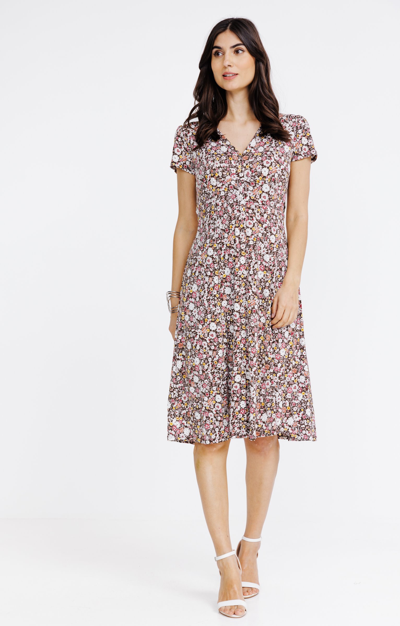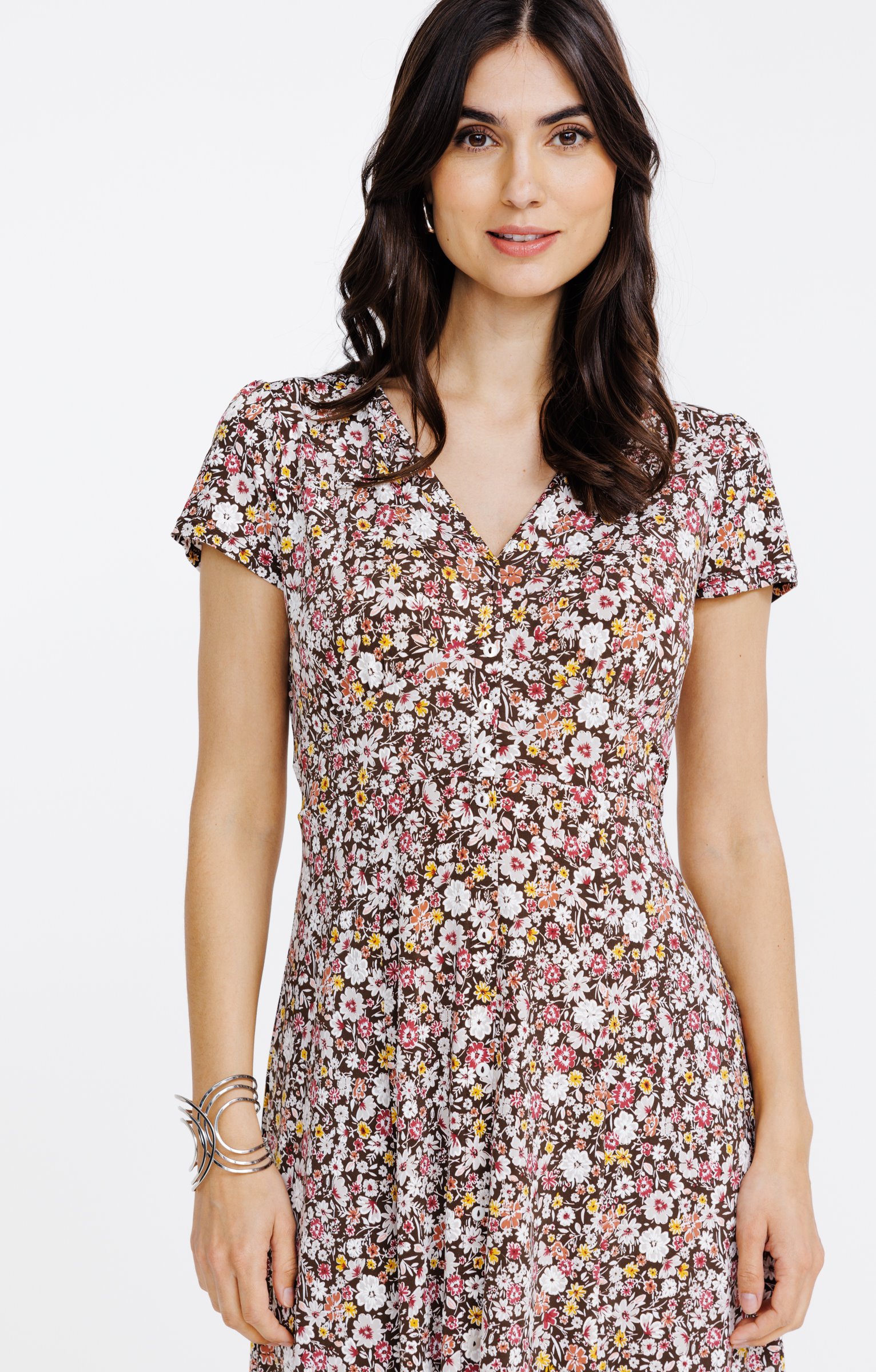 Robe midi à manches courtes avec col en V. Coupe évasée, cintrée à la taille avec un lien à nouer. Boutons décoratifs sur le devant. Imprimé floral sur l'ensemble du modèle. Longueur midi, tombé fluide.