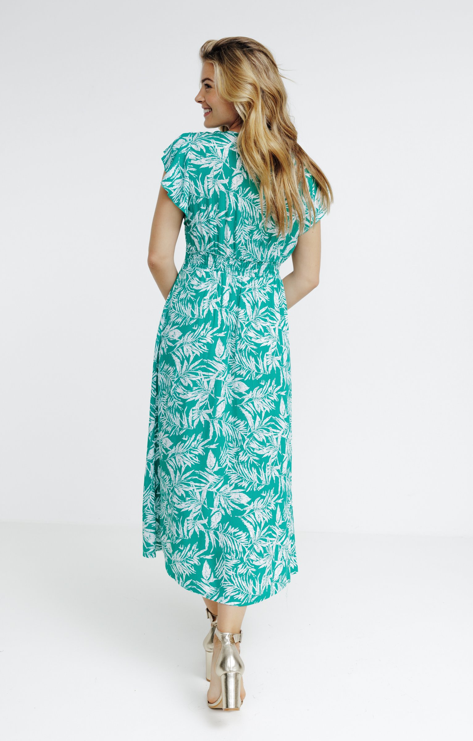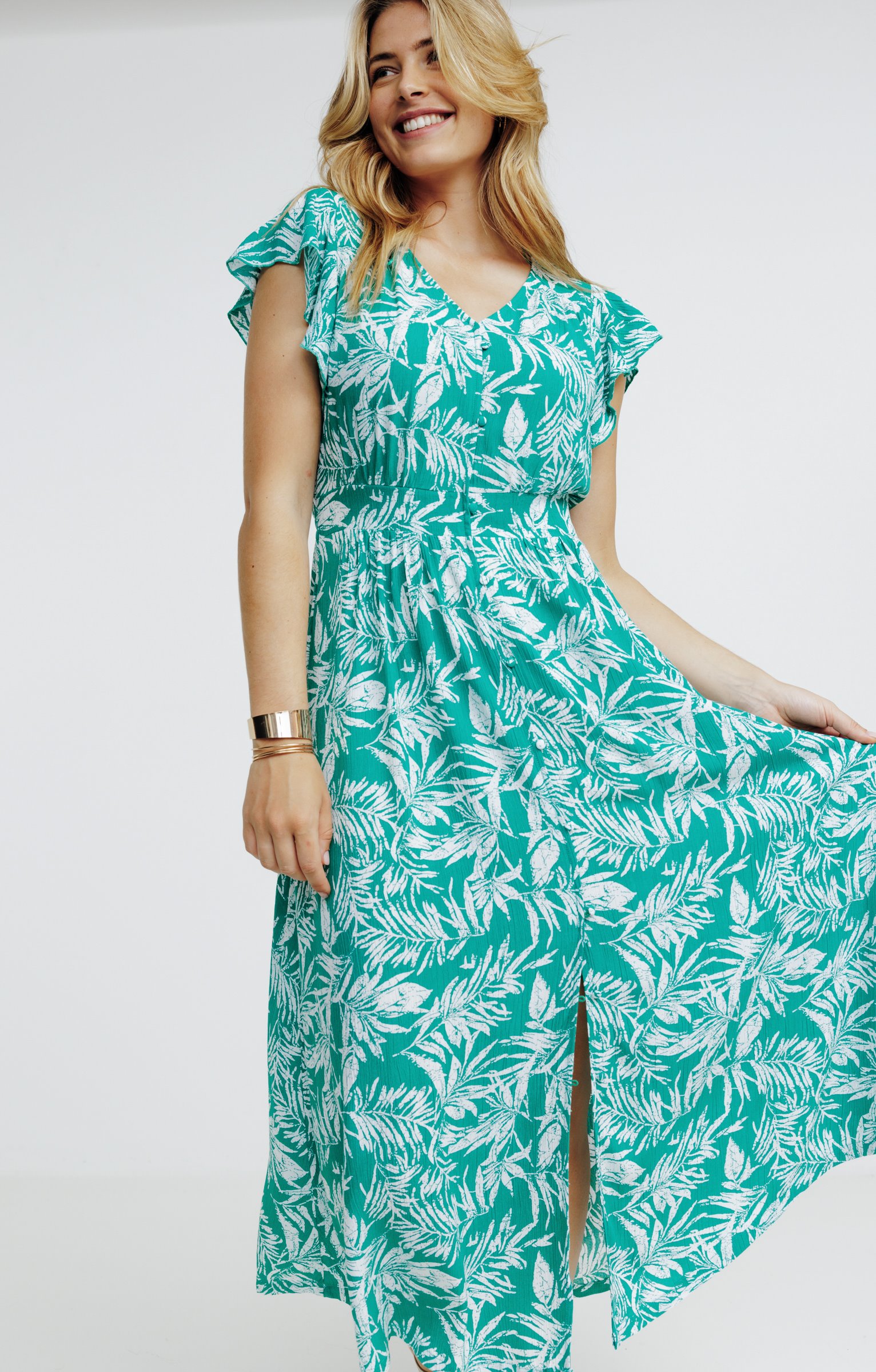 Robe imprimé feuillage à manches courtes et col V. Coupe évasée cintrée à la taille. Robe longue. Manches courtes à volants. Col V. Robe boutonnée devant. 2 boutons du bas déboutonnables. Feuilles monochromes sur fond contrastant en motif. Modèle en crépon. Large ceinture élastiquée à la taille. Boutons recouverts de tissu assorti. Notre mannequin Frédérique mesure 1m78 et porte une robe taille 38.