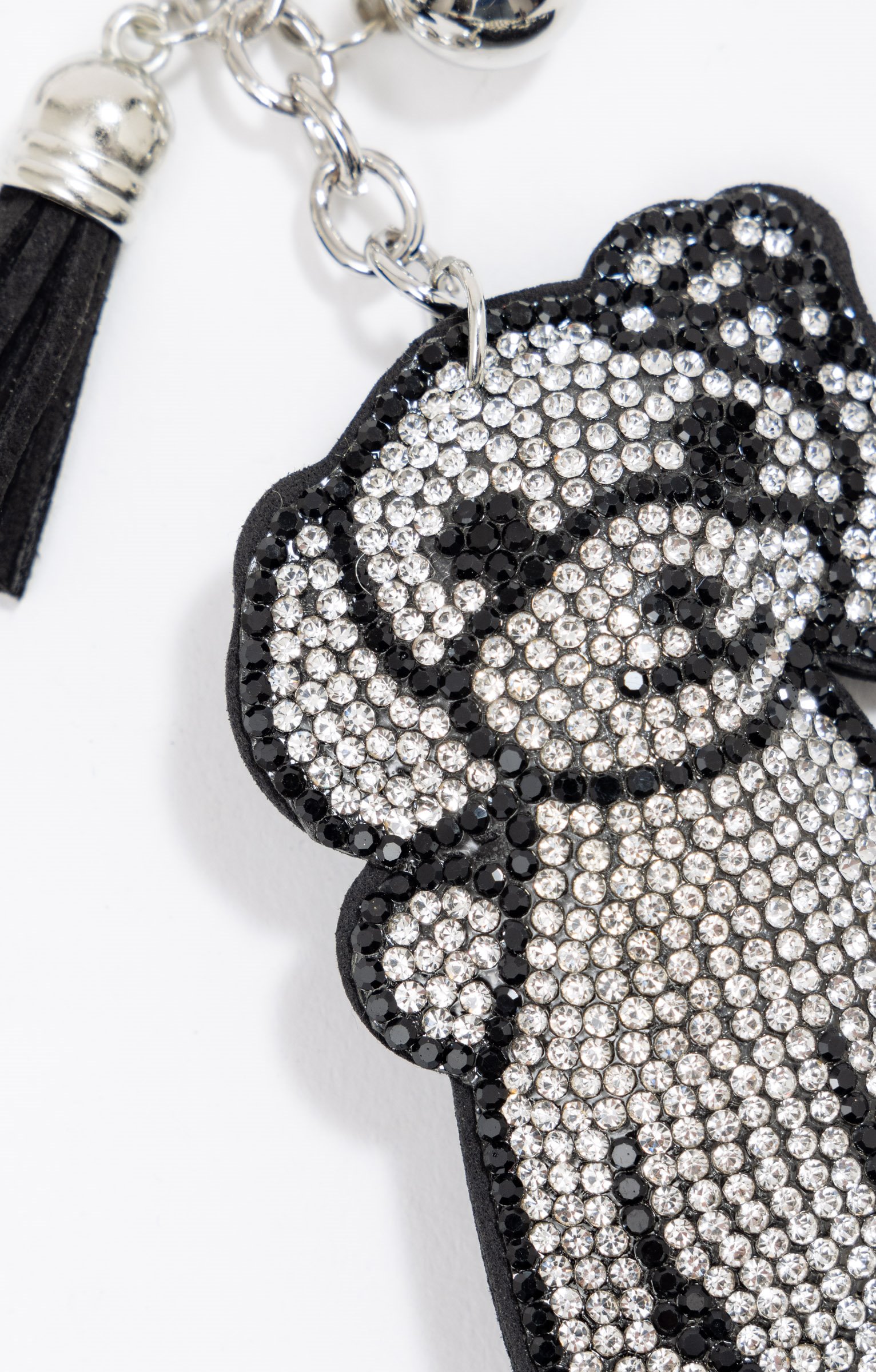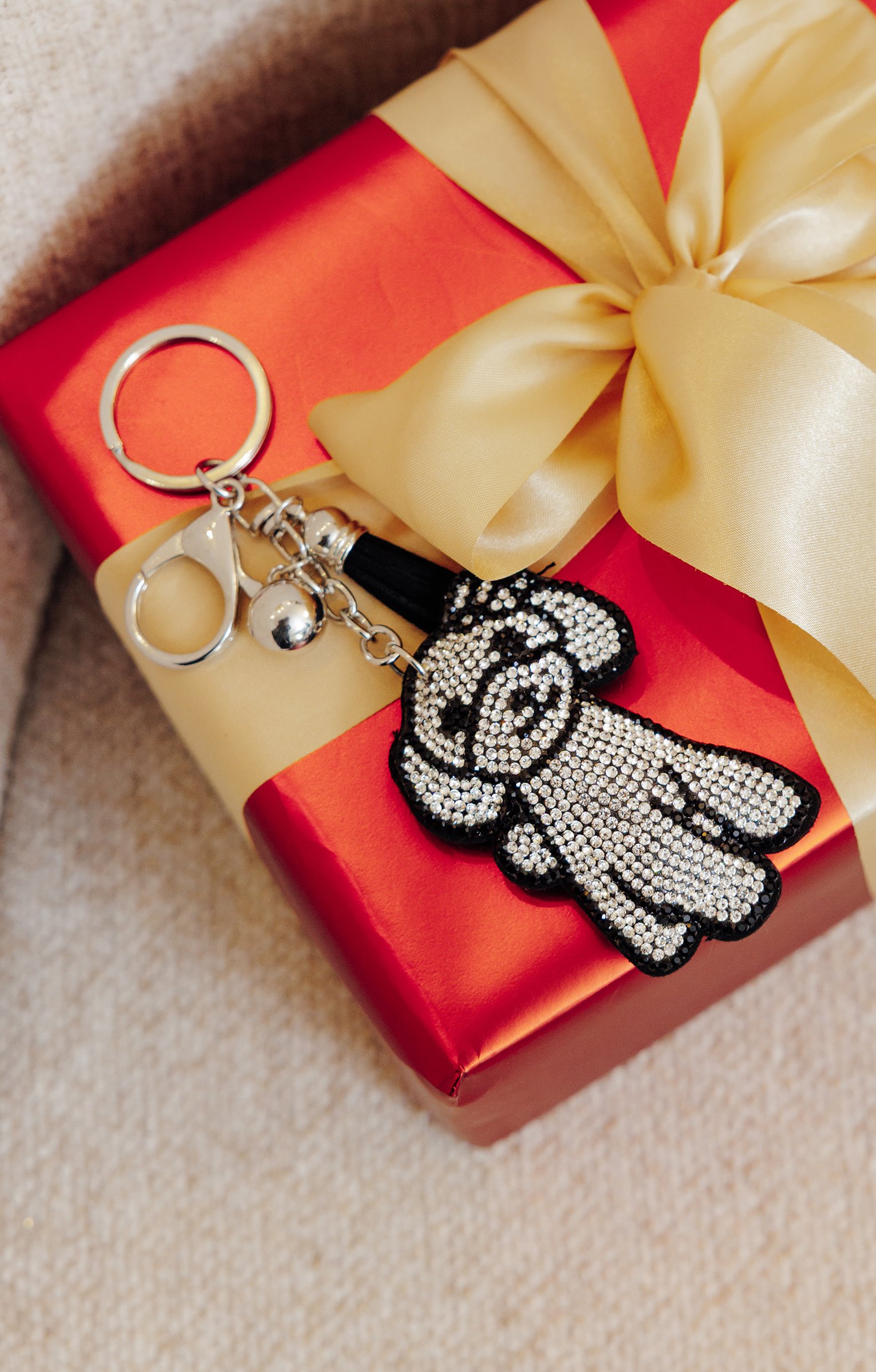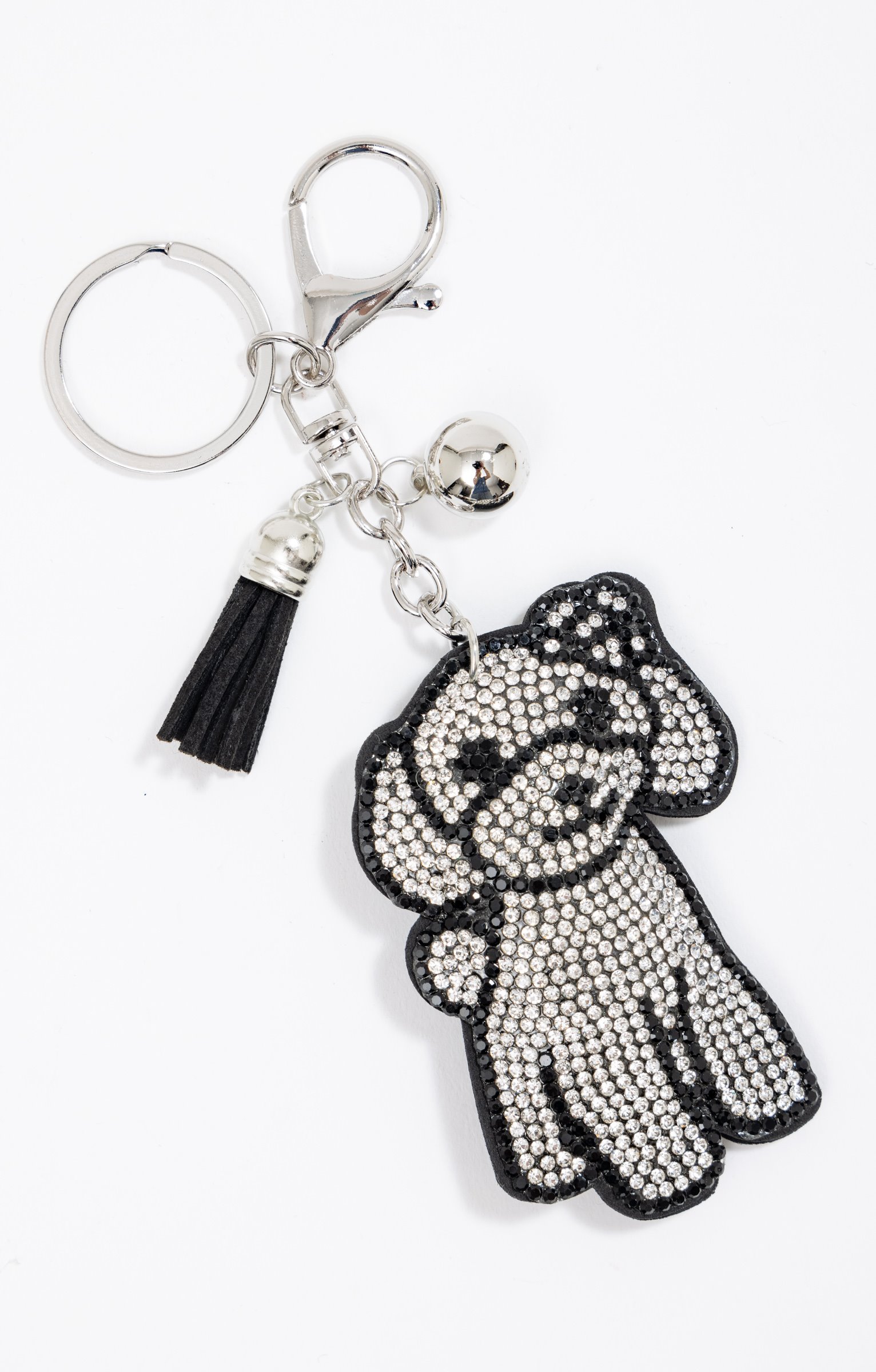 Porte-clé fantaisie en forme de chien mignon. Modèle avec pendentif chien mignon en tissu serti de strass sur toute la surface. Modèle bicolore avec bordures et détails contrastants. Jonction à douille rotative entre anneau brisé et chaîne. Chaîne en maille fine avec breloque bille et pompon façon cuir. Porte-clé avec attache mousqueton. Métallerie aux finitions argentées.