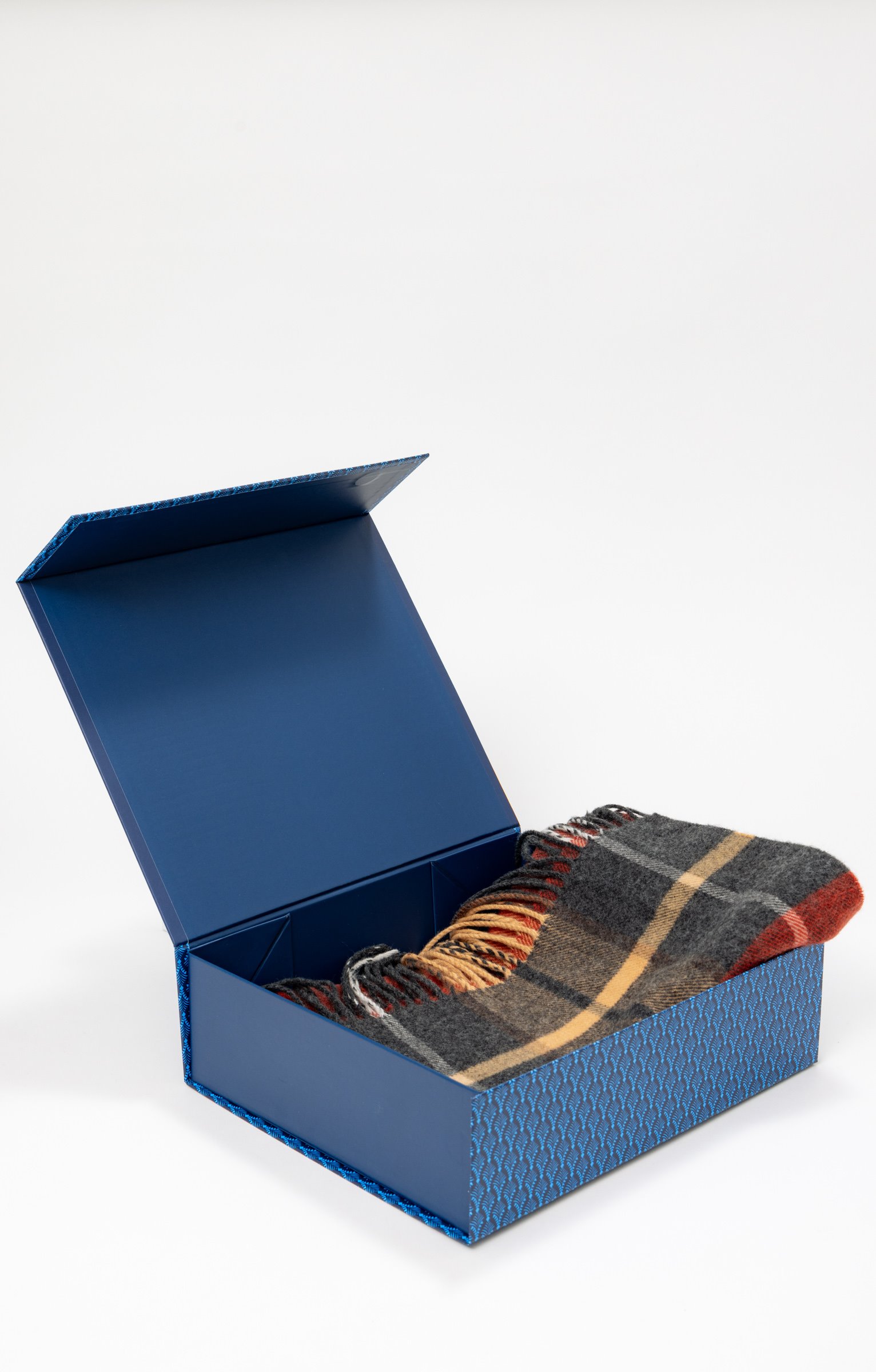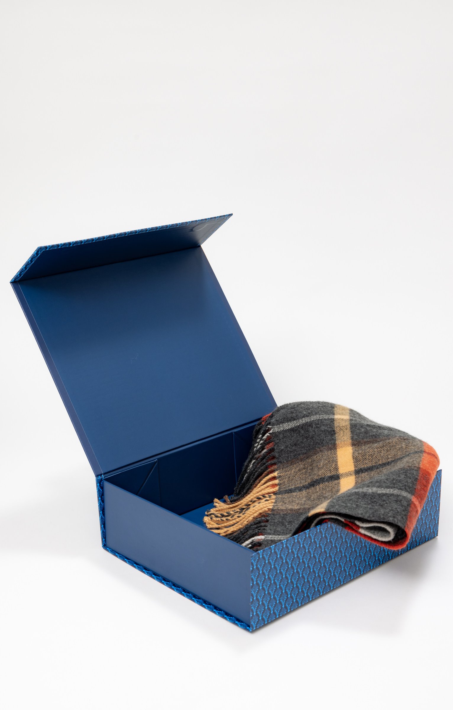 Boite cadeau imprimée format moyen. Format rectangulaire. Fermeture par un rabat sur le dessus. Imprimé à petits motifs fantaisie sur le dessus et 2 des côtés. Cadre doré autour des motifs sur le dessus. Logo sur le dessus de la boite. Composition 100 % papier. Cette boite cadeau est idéale pour offrir un accessoire : ceinture, cravate...