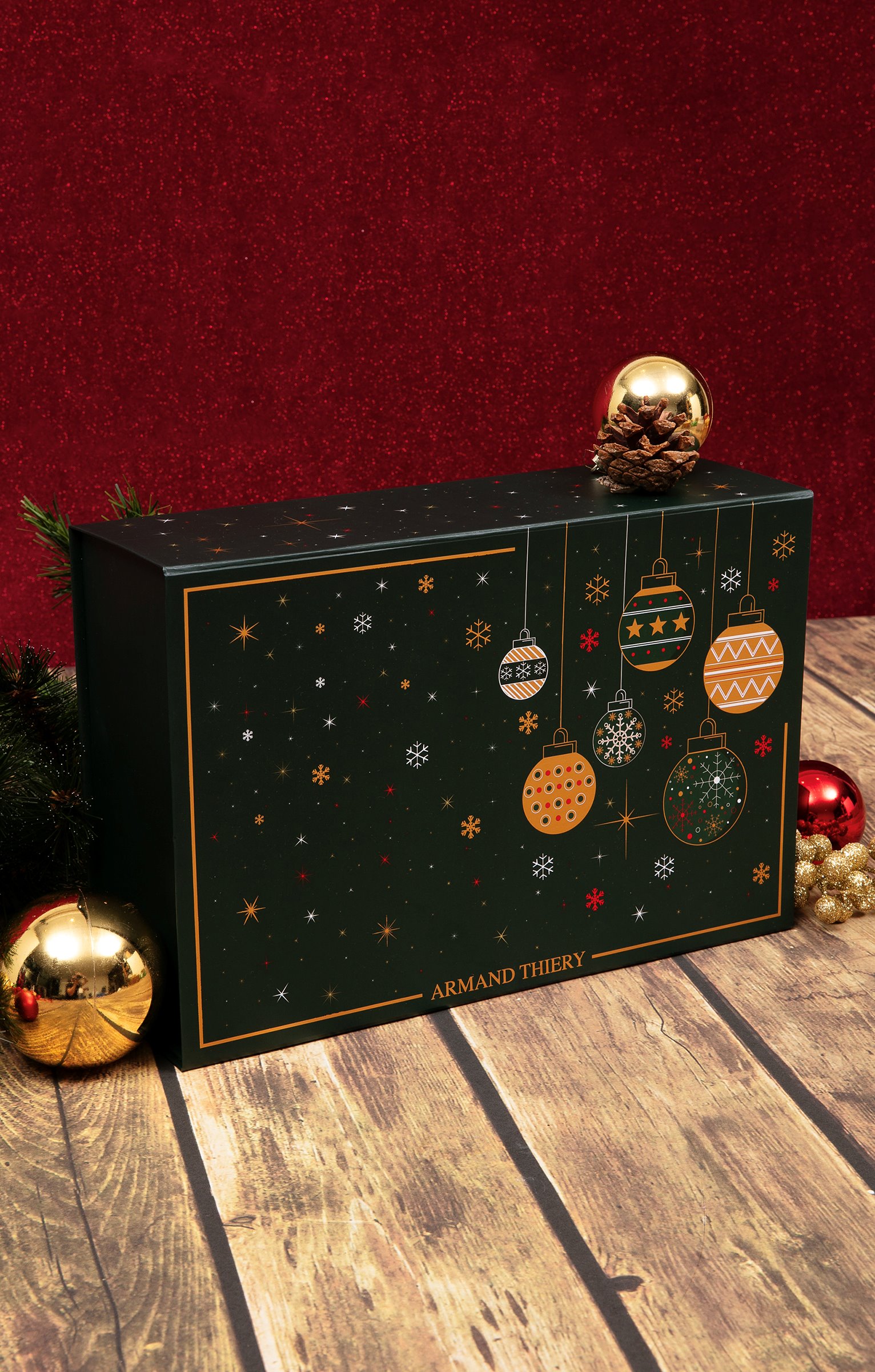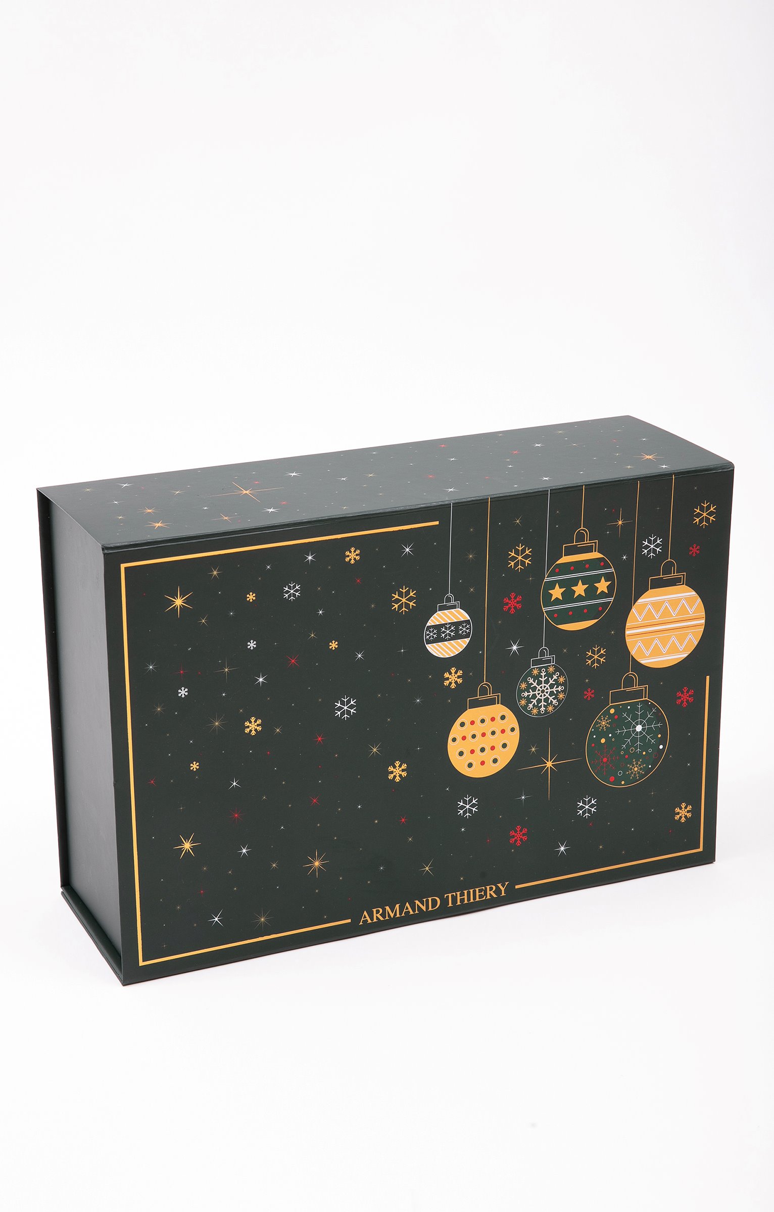 Boite cadeau imprimée spéciale Noël grand format. Format rectangulaire. Fermeture par un rabat aimanté sur le dessus. Imprimé flocons, étoiles et guirlandes. Cadre doré autour des motifs sur le dessus. Logo sur le dessus de la boite. Composition 100 % papier. Cette boite cadeau est idéale pour offrir Cette boite cadeau est idéale pour offrir un vêtement léger : tee-shirt, pyjama...
