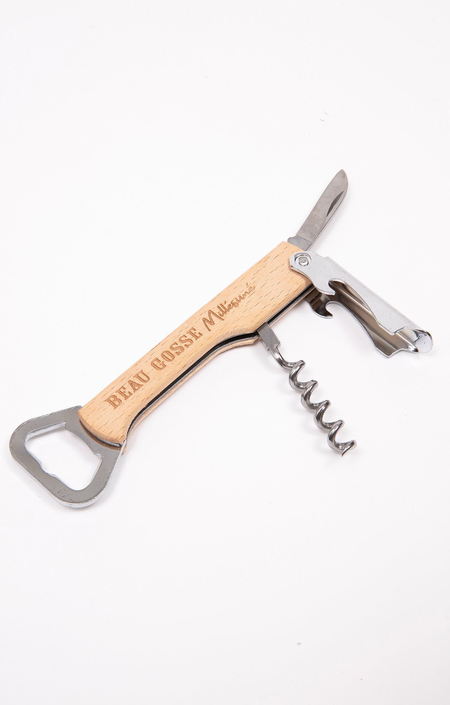 Coffret cadeau deux accessoires pour le vin, collection spéciale Noël. Comprend un tire-bouchon, deux décapsuleurs et un couteau, ainsi qu'un bouchon pour bouteille de vin. Message « Beau gosse millésimé » sur le manche de l'accessoire et sur le dessus du bouchon. En bois et métal. Vendu dans un coffret cadeau logoté et orné de motifs boules de Noël.
