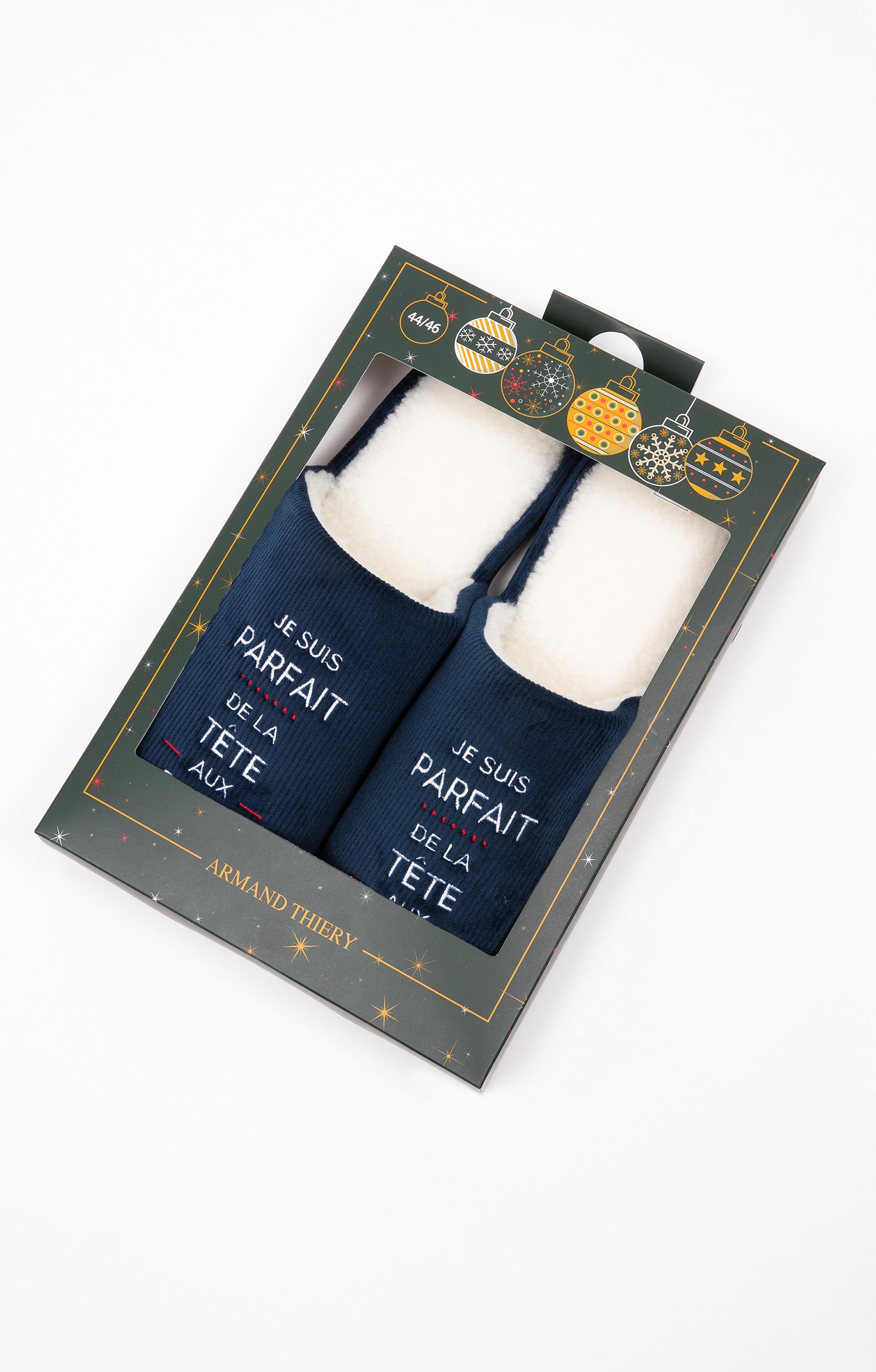 Chaussons à message brodé en coffret cadeau de Noël. Pantoufles forme mules plates à bout fermé. Message «Je suis parfait de la tête aux pieds» avec points et tirets en broderie bicolore. Dessus en velours uni côtelé. Doublure et semelle intérieure en matière duveteuse moutonnée. Chaussons vendus en boîte cadeau.