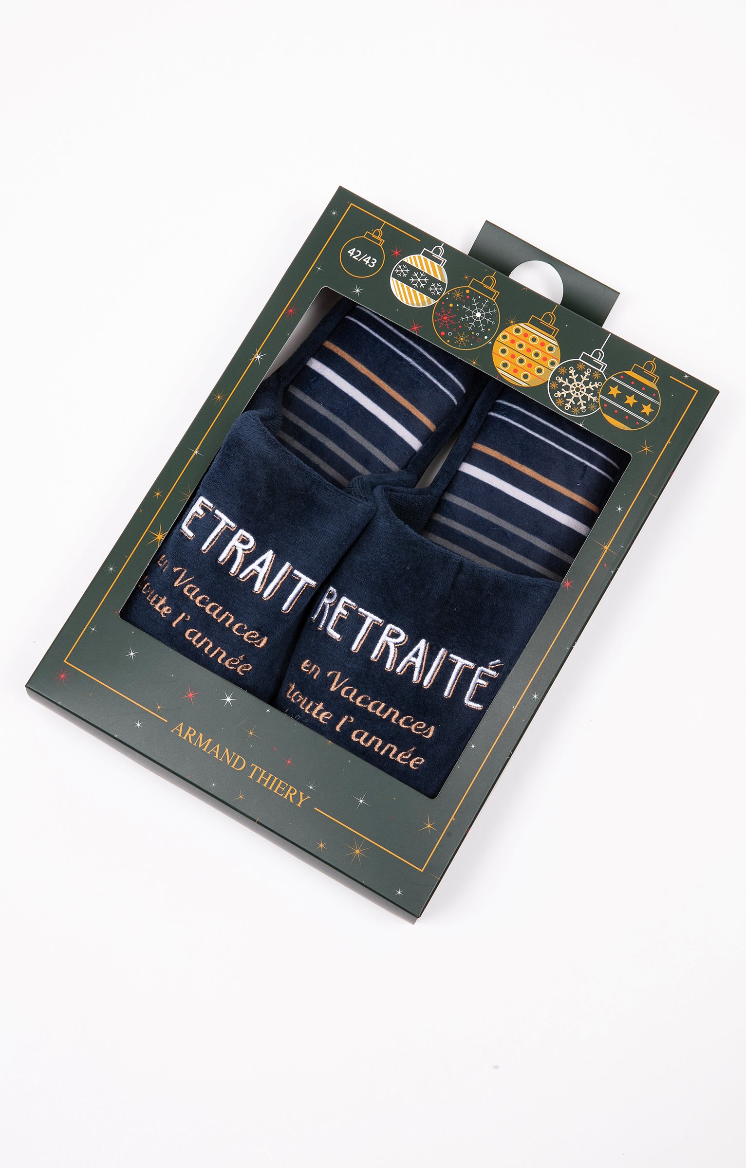 Chaussons multicolores en velours à message brodé en coffret cadeau de Noël. Chaussons forme mules plates à bout fermé. Dessus uni avec message bicolore brodé «Retraité en vacances toute l'année». Semelle intérieure à rayures multicolores. Velours ras. Chaussons vendus en boîte cadeau.