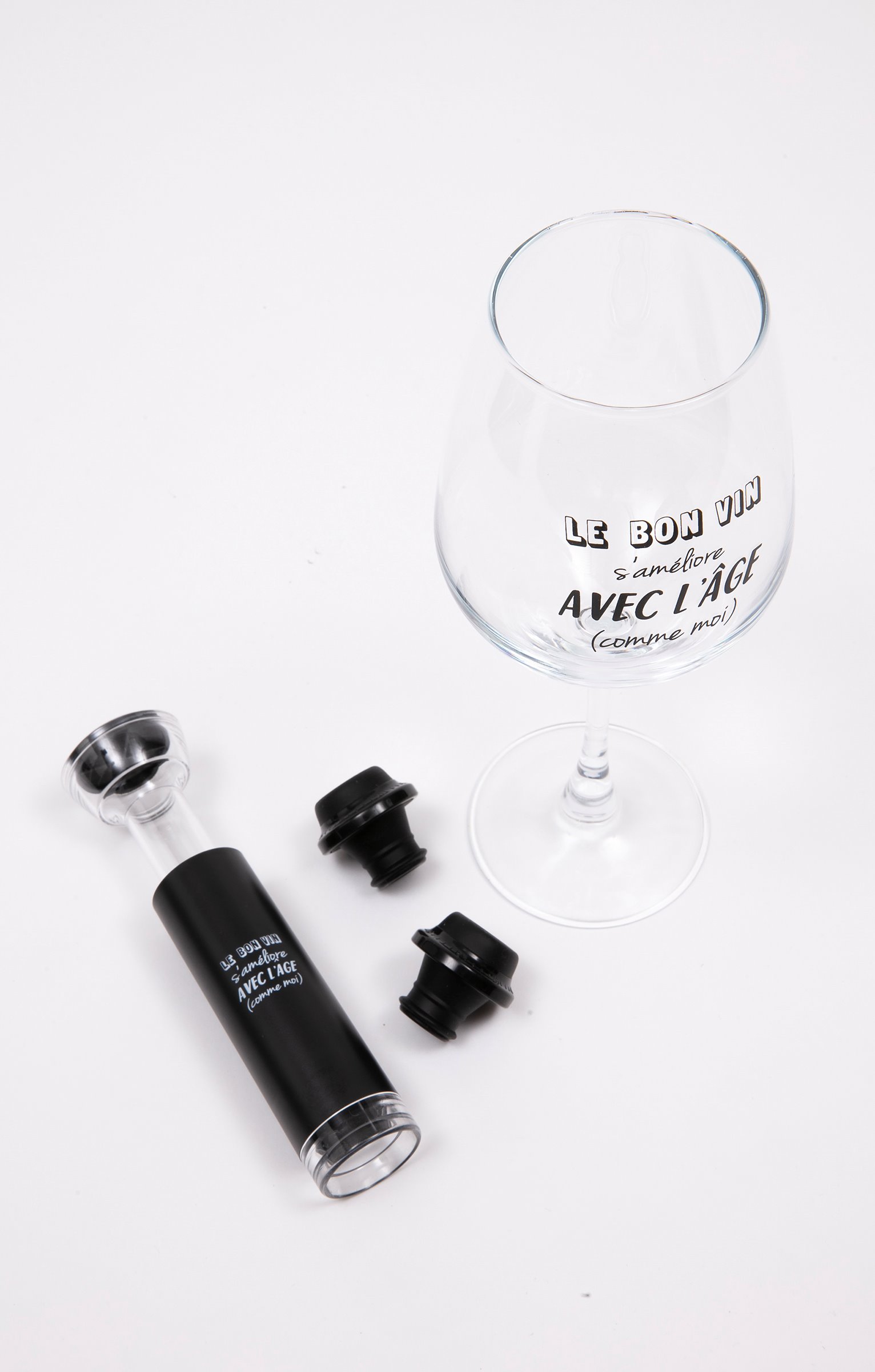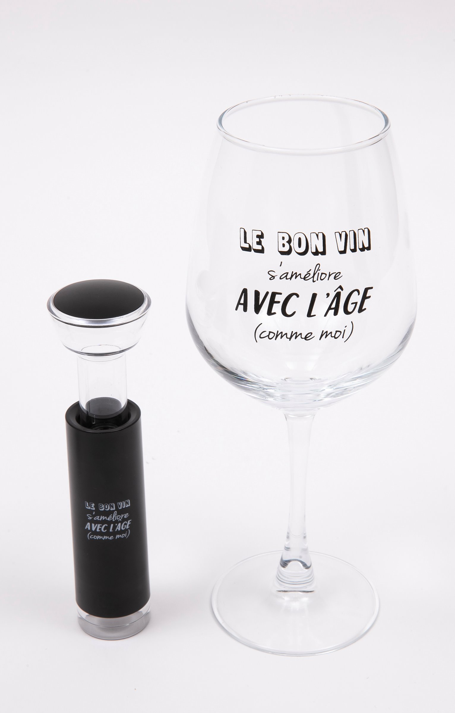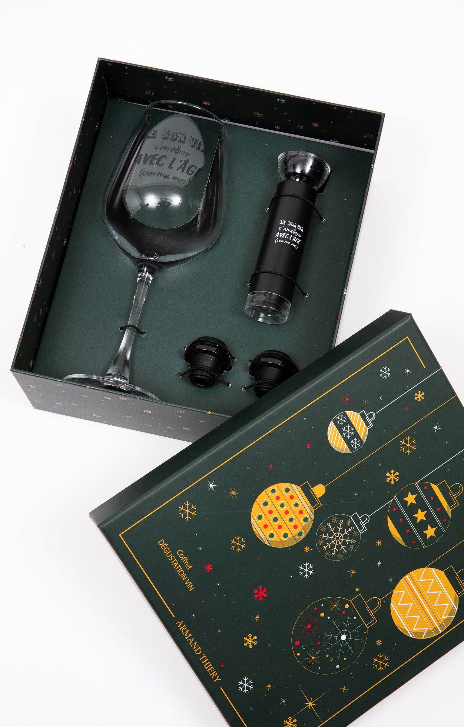 Coffret cadeau dégustation vin humoristique, collection spéciale Noël. Comprend un verre à vin, un bouchon vide d'air et deux bouchons. Message « Le bon vin s'améliore avec l'âge (comme moi) » sur le verre et sur le bouchon. Coffret cadeau logoté, orné de motifs boules de Noël et offrant la possibilité d'inscrire le nom du destinataire.