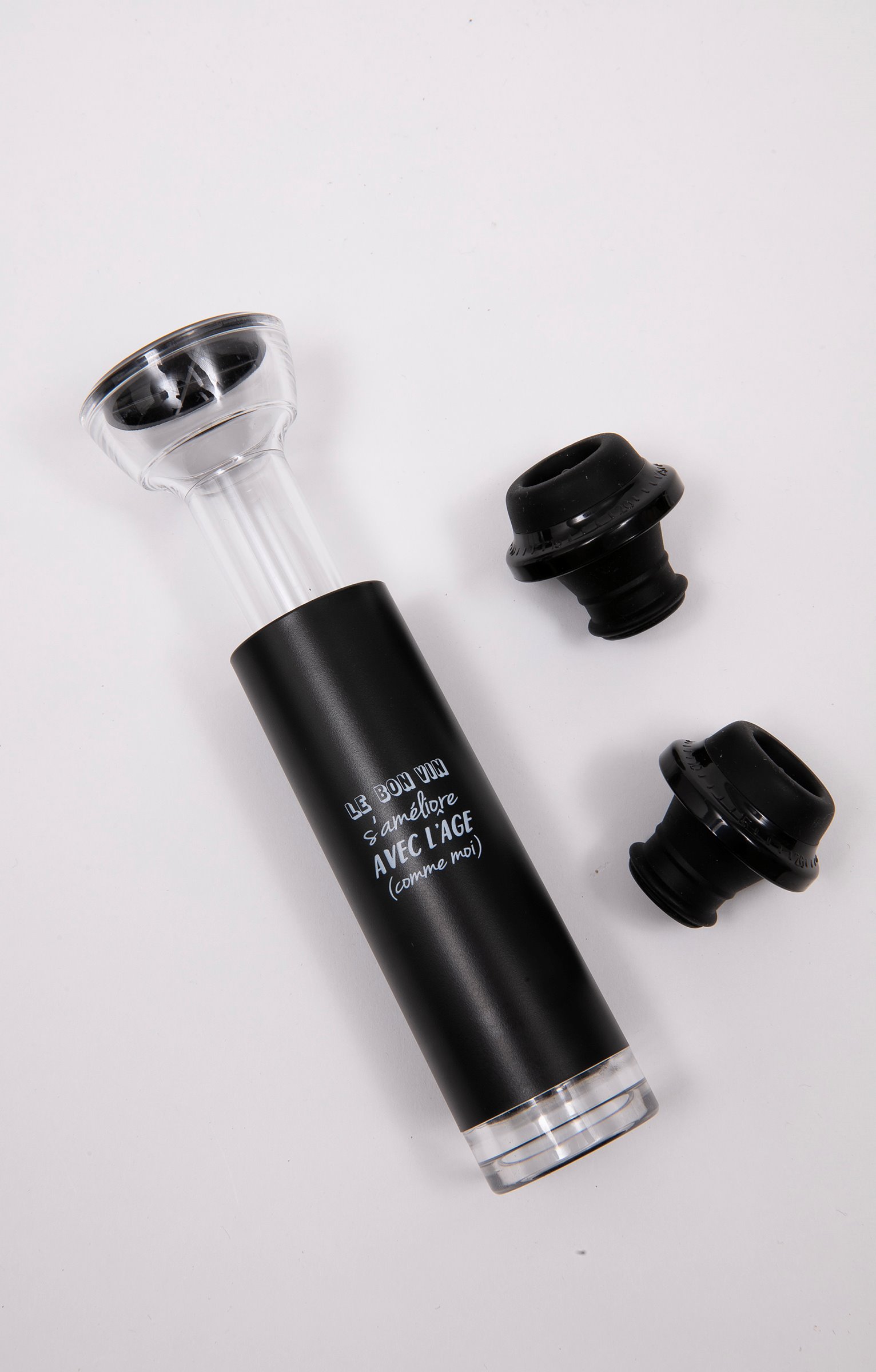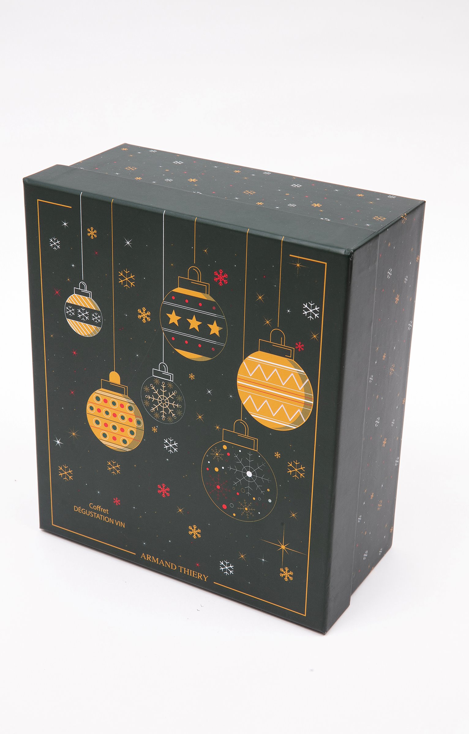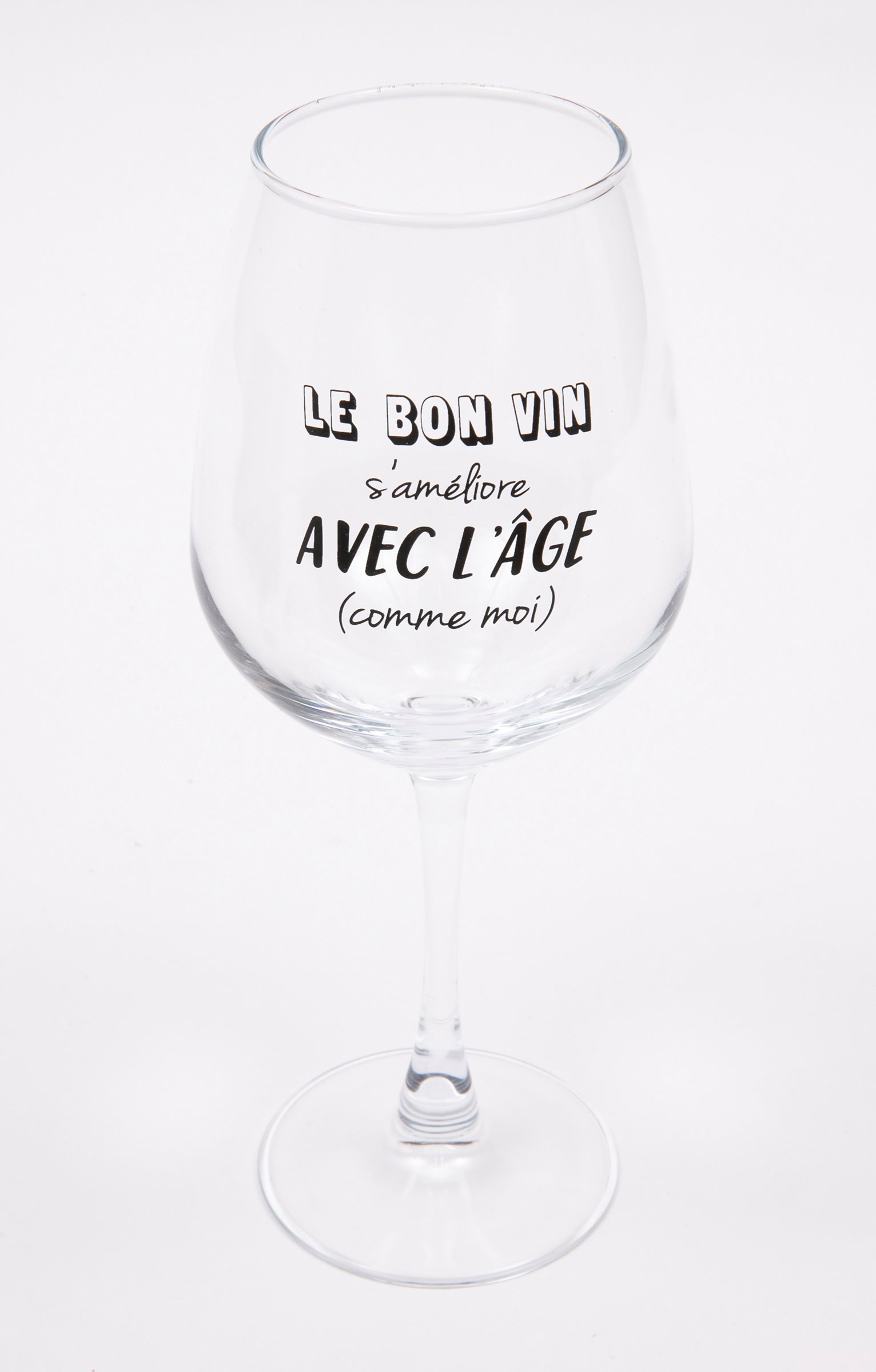 Coffret cadeau dégustation vin humoristique, collection spéciale Noël. Comprend un verre à vin, un bouchon vide d'air et deux bouchons. Message « Le bon vin s'améliore avec l'âge (comme moi) » sur le verre et sur le bouchon. Coffret cadeau logoté, orné de motifs boules de Noël et offrant la possibilité d'inscrire le nom du destinataire.