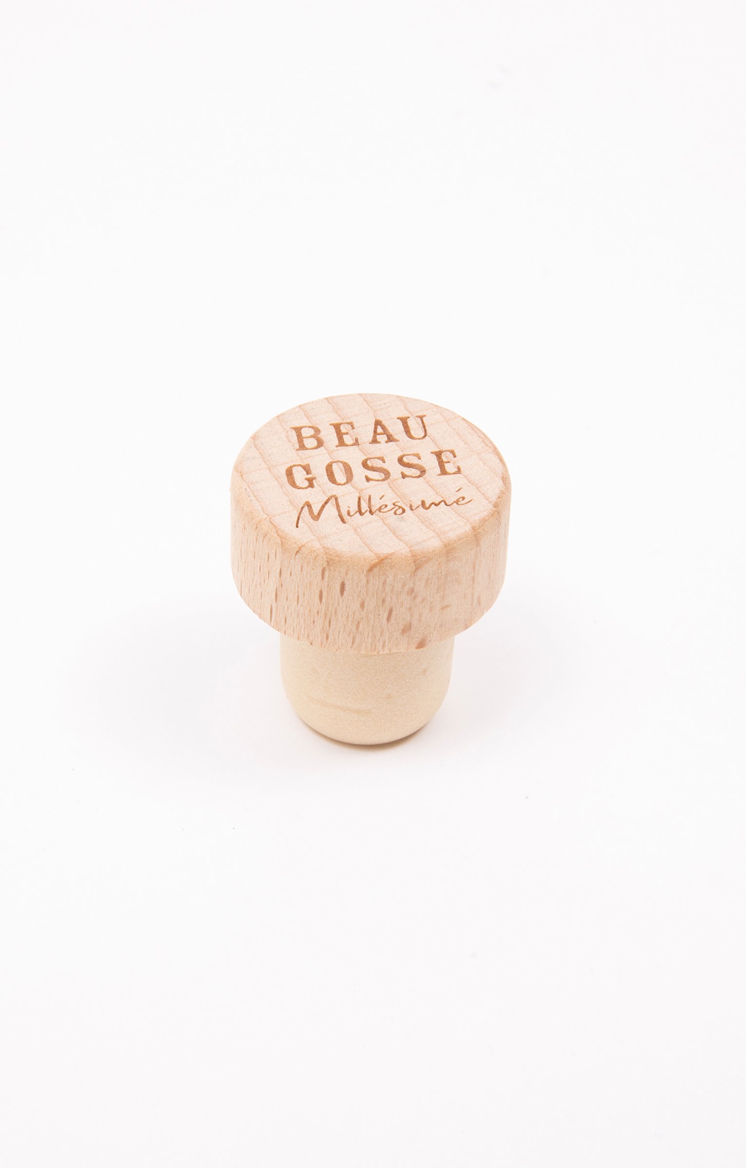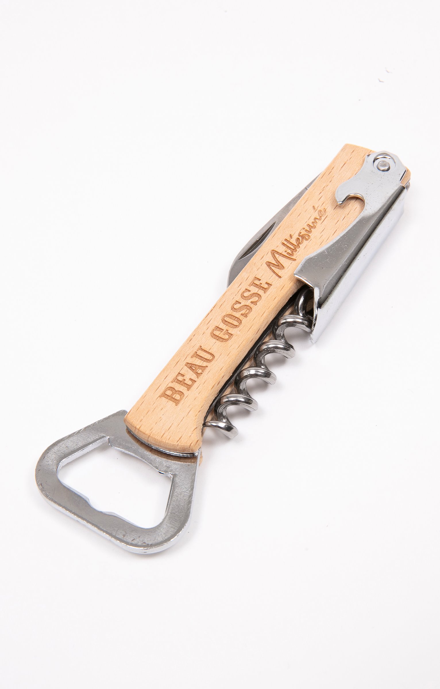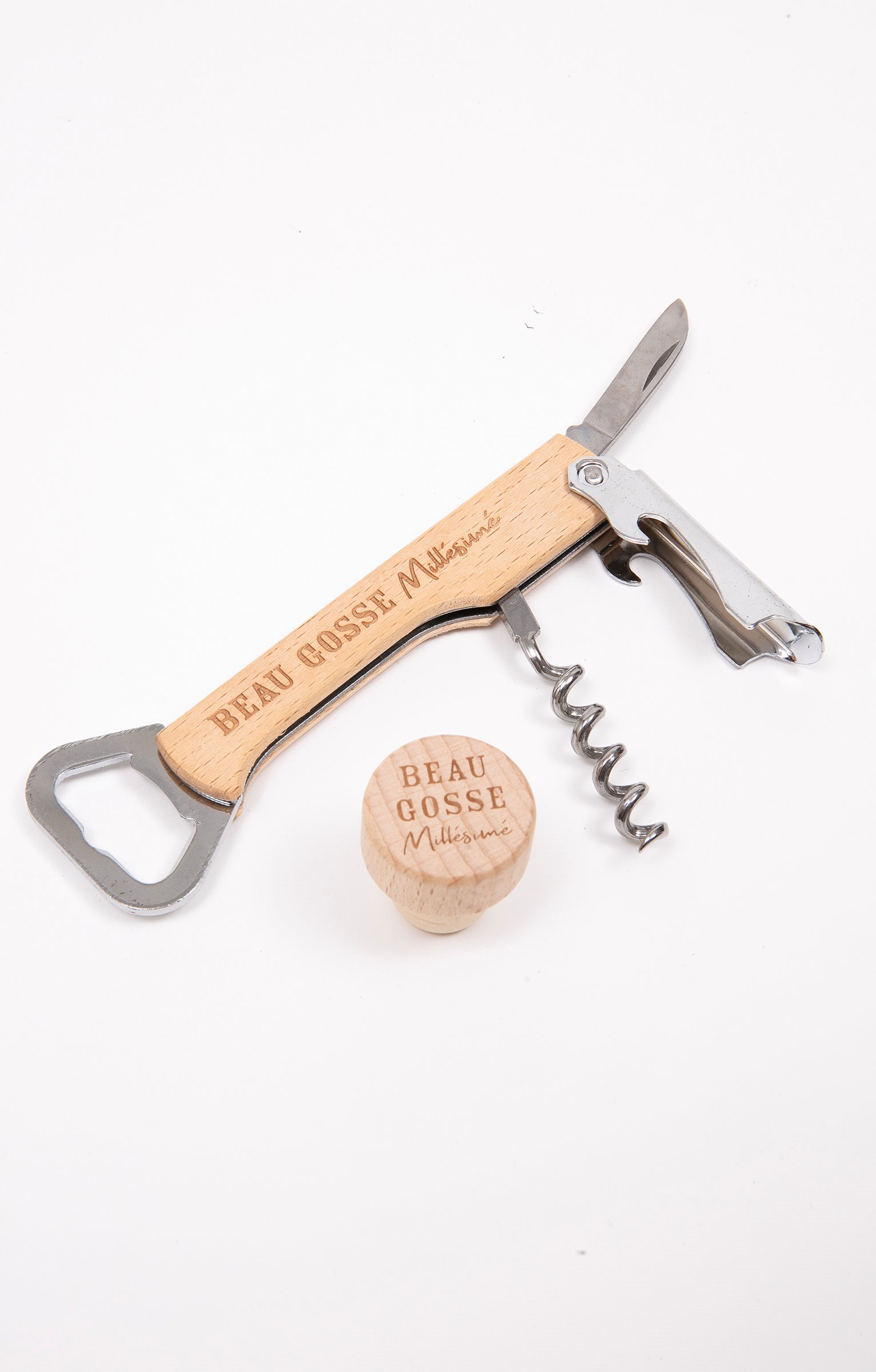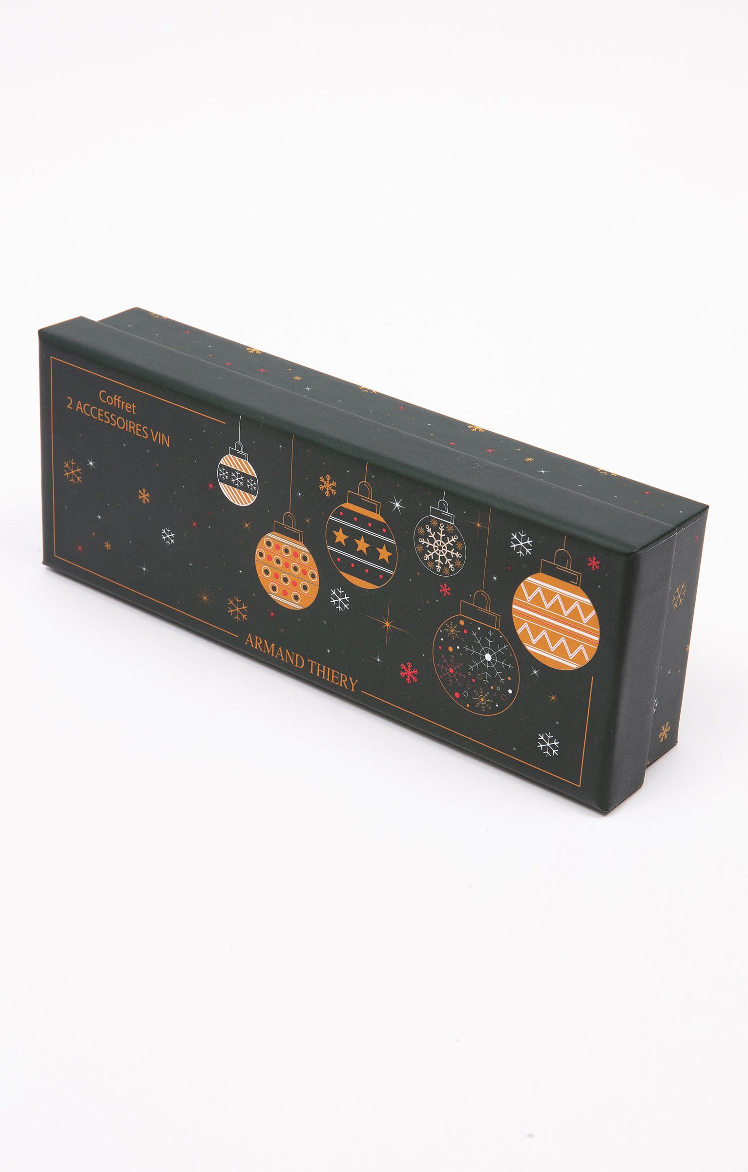 Coffret cadeau deux accessoires pour le vin, collection spéciale Noël. Comprend un tire-bouchon, deux décapsuleurs et un couteau, ainsi qu'un bouchon pour bouteille de vin. Message « Beau gosse millésimé » sur le manche de l'accessoire et sur le dessus du bouchon. En bois et métal. Vendu dans un coffret cadeau logoté et orné de motifs boules de Noël.