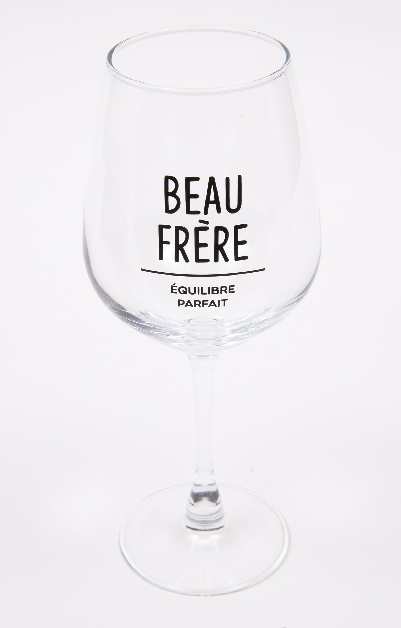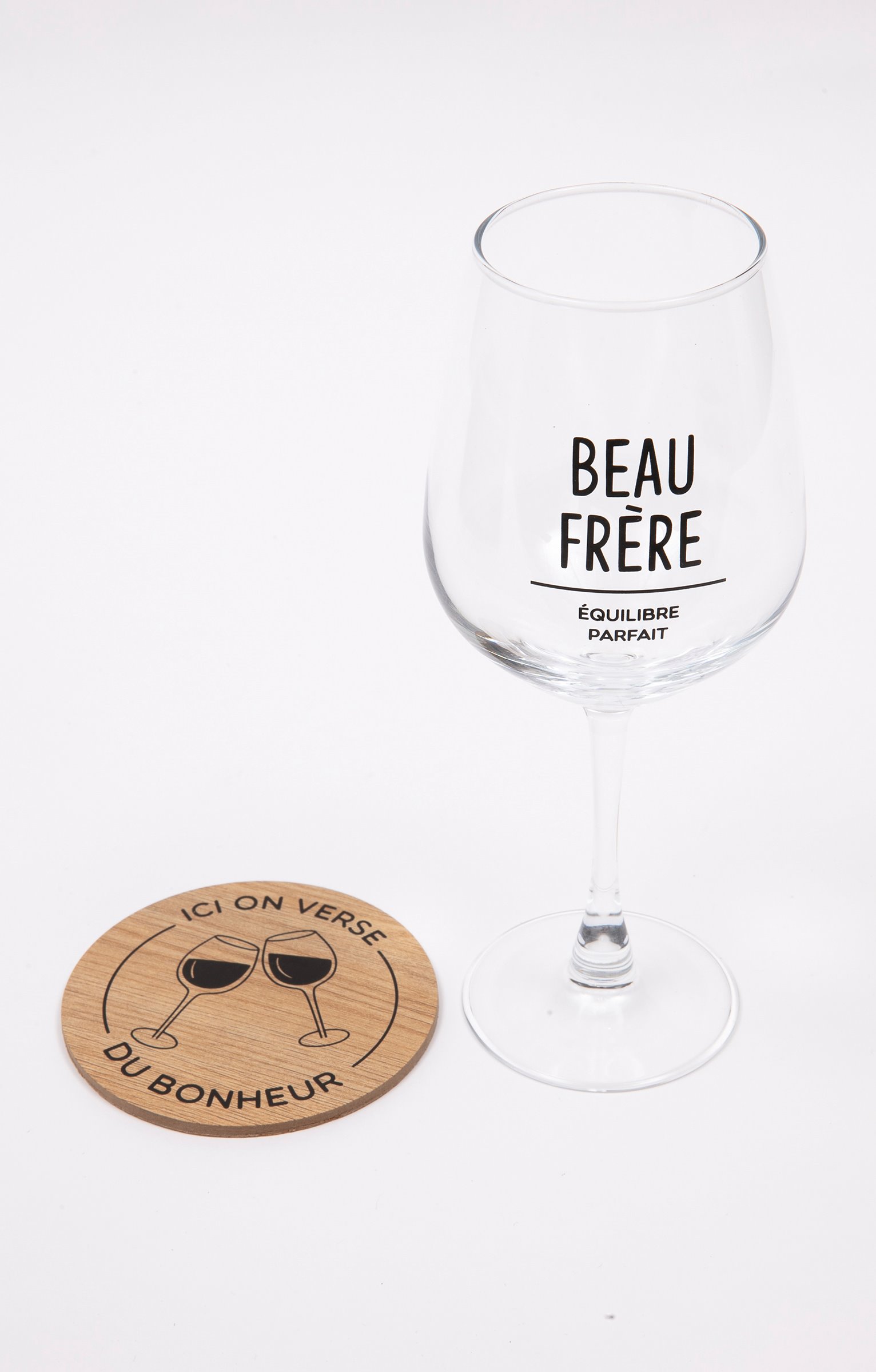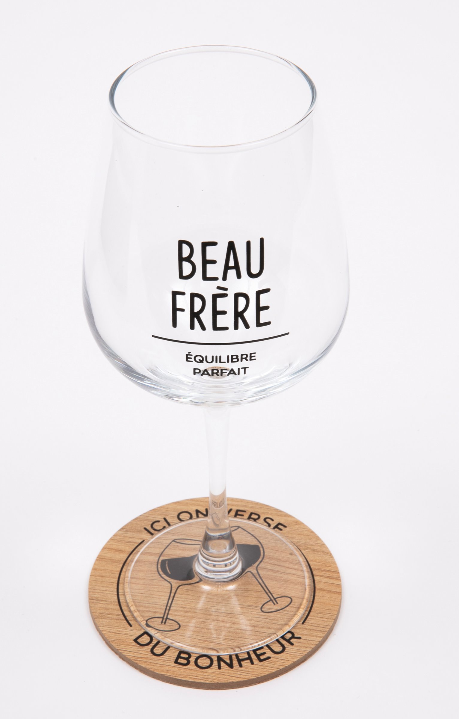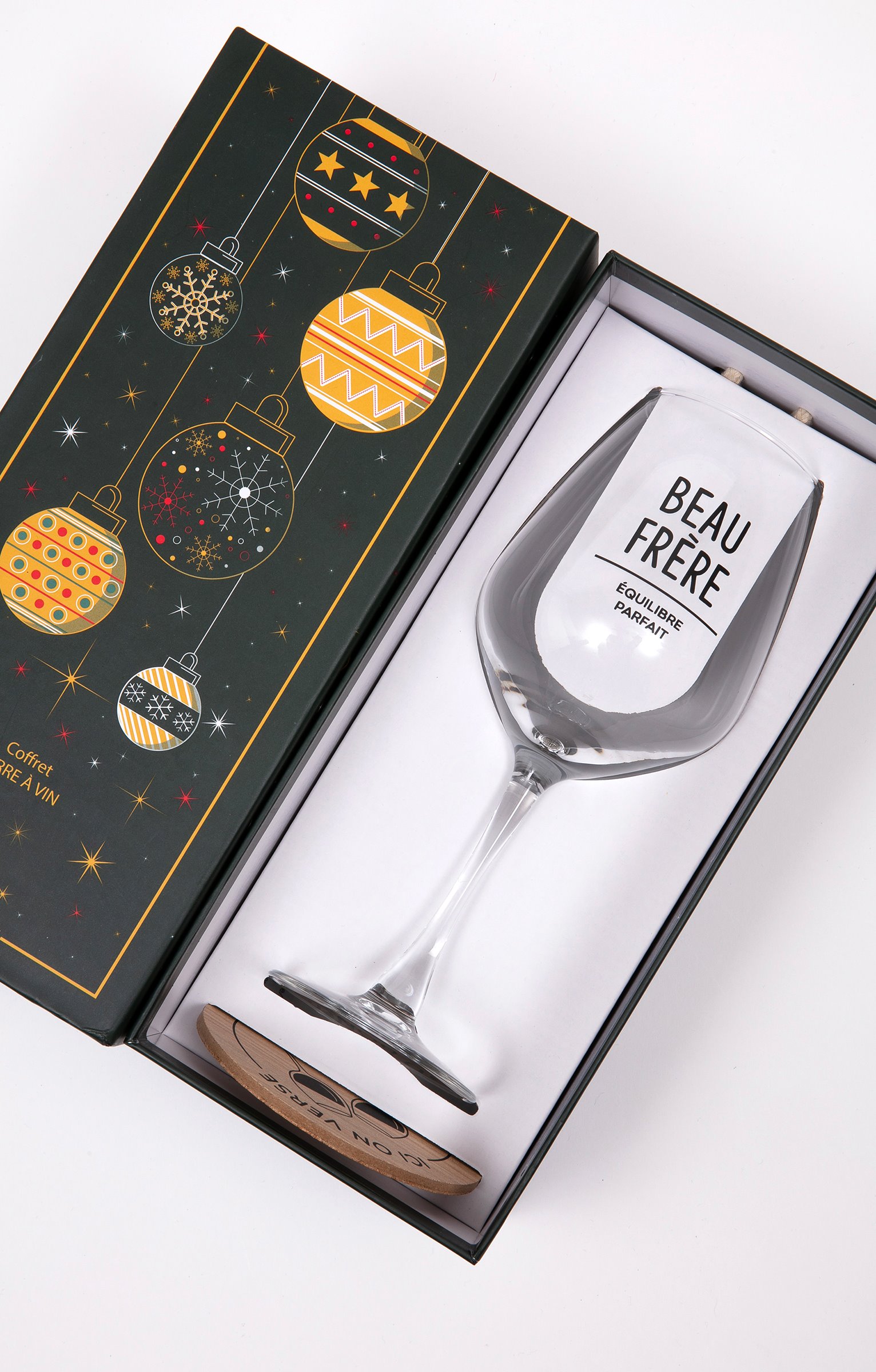 Coffret cadeau vin humoristique, collection spéciale Noël. Comprend un verre à vin et un sous-verre. Message « Beau-frère équilibre parfait » sur le verre. Imprimé verres qui se cognent et message « Ici on verse du bonheur » sur le sous-verre. En verre et en bois. Vendu dans un coffret cadeau avec poignée, orné de motifs boules de Noël et offrant la possibilité d'inscrire le nom du destinataire.