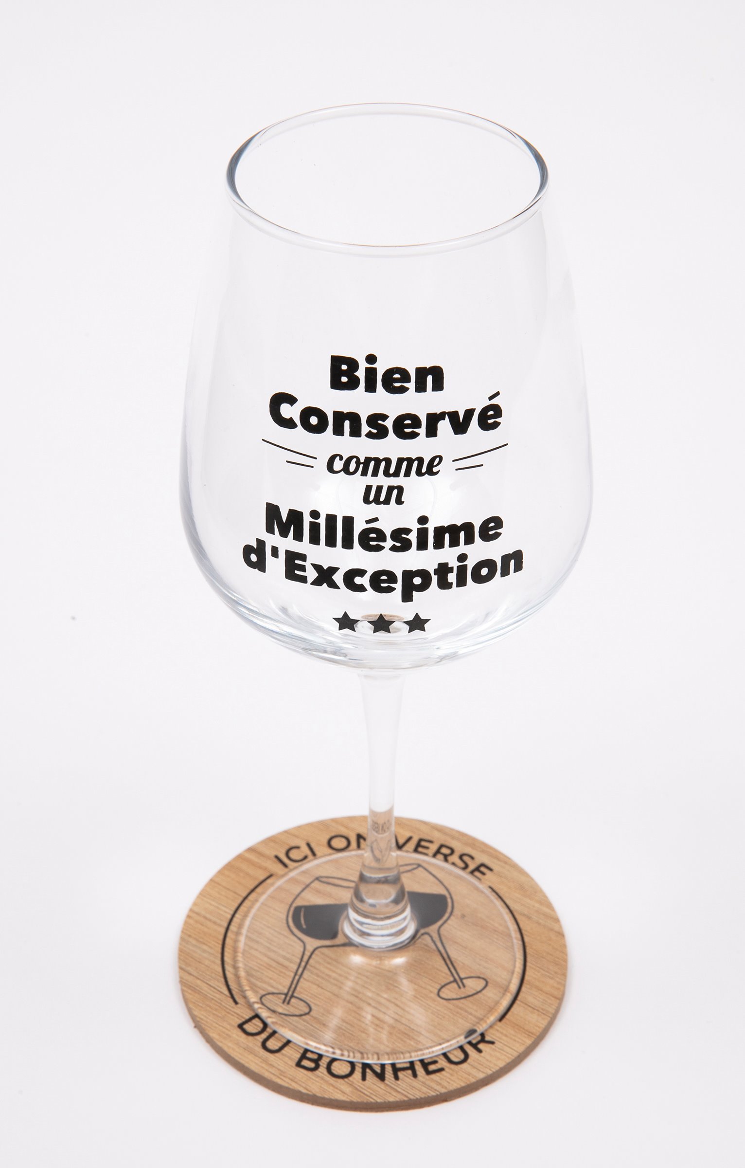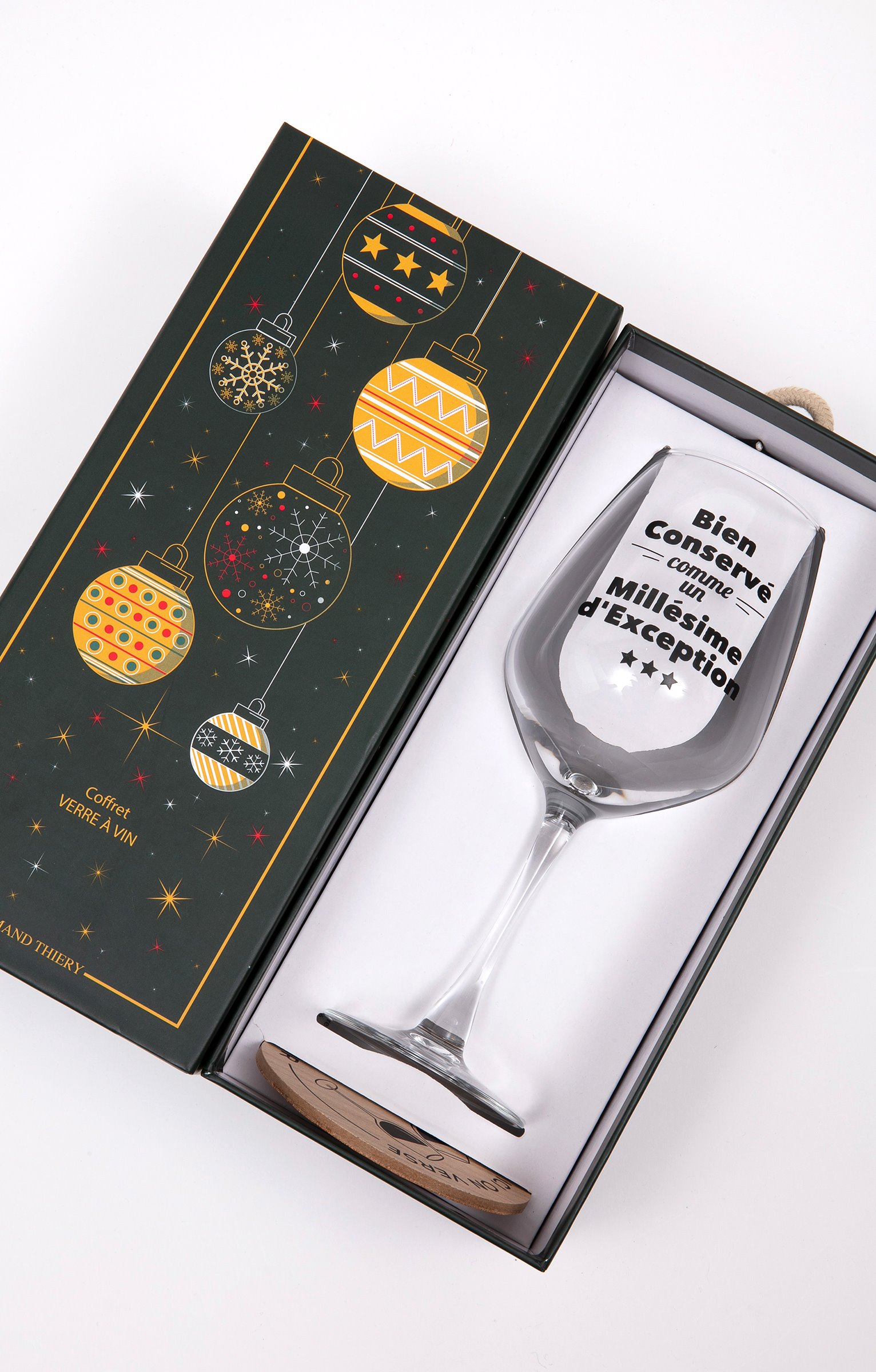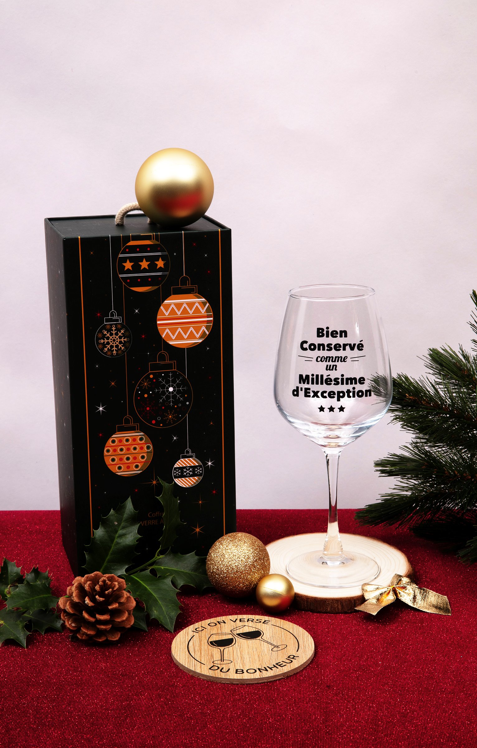 Coffret cadeau vin avec messages, collection spéciale Noël. Comprend un verre à vin et un sous-verre. Message « Bien conservé comme un millésime d'exception » sur le verre. Imprimé verres qui se cognent et message « Ici on verse du bonheur » sur le sous-verre. En verre et en bois. Vendu dans un coffret cadeau avec poignée, orné de motifs boules de Noël et offrant la possibilité d'inscrire le nom du destinataire.