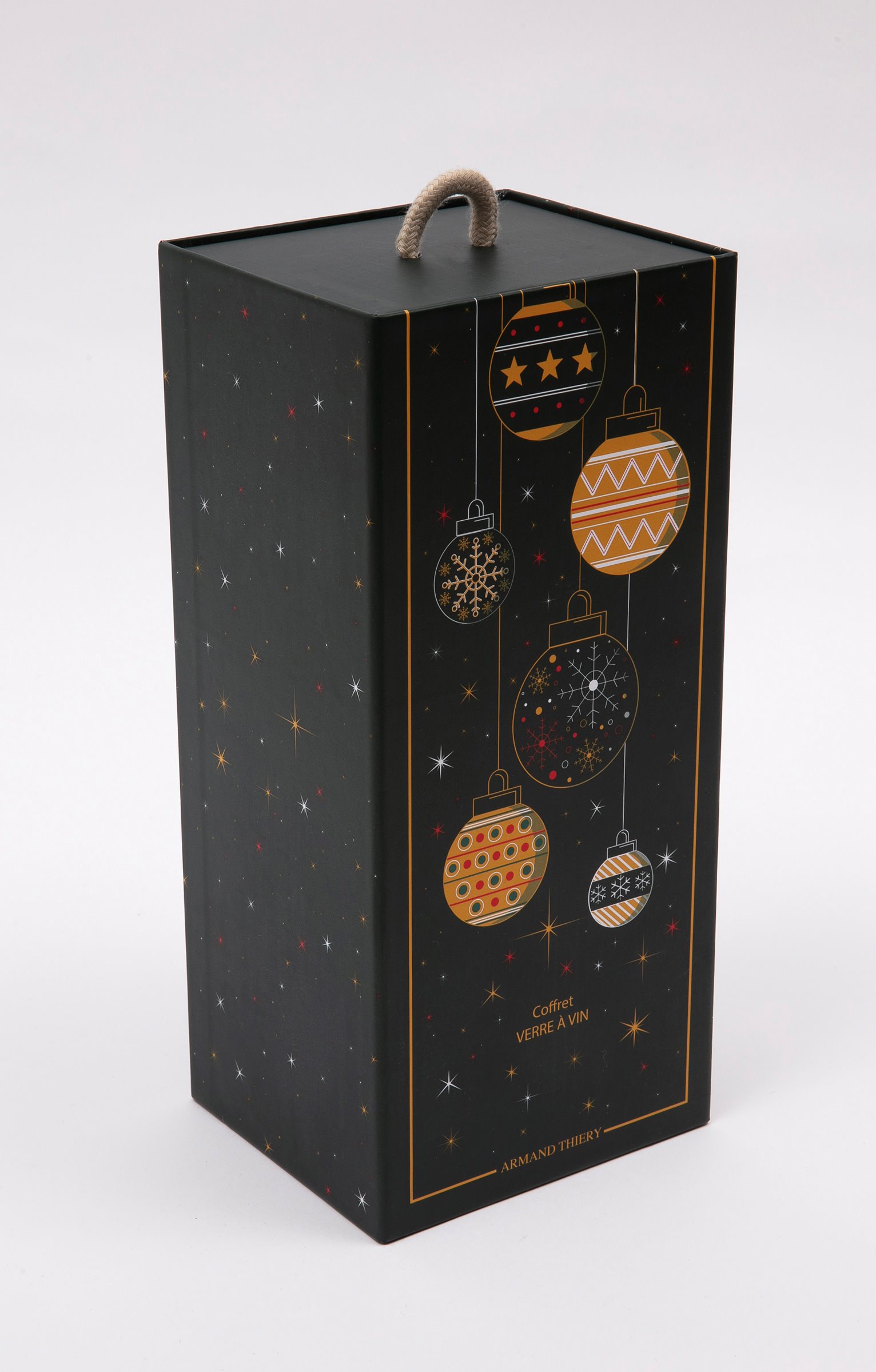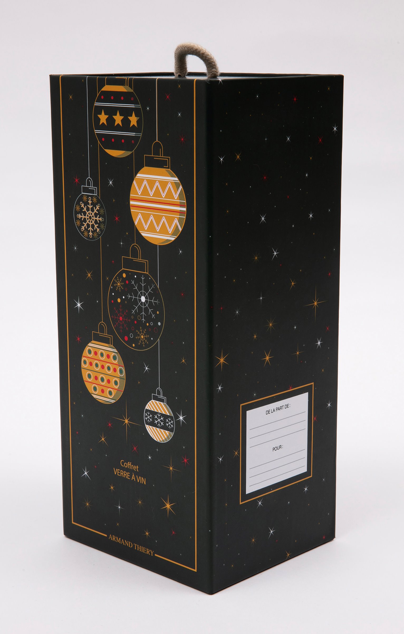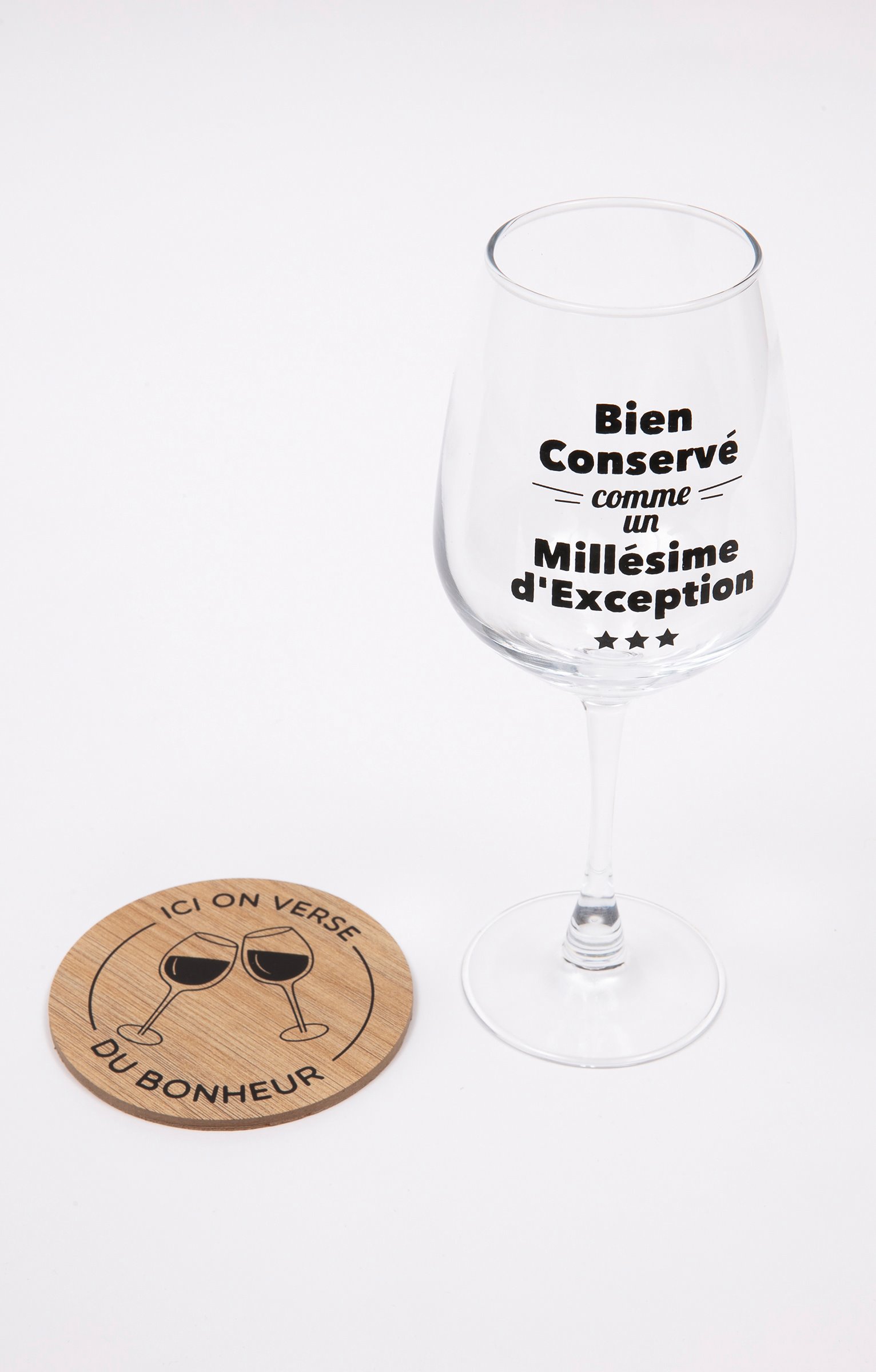 Coffret cadeau vin avec messages, collection spéciale Noël. Comprend un verre à vin et un sous-verre. Message « Bien conservé comme un millésime d'exception » sur le verre. Imprimé verres qui se cognent et message « Ici on verse du bonheur » sur le sous-verre. En verre et en bois. Vendu dans un coffret cadeau avec poignée, orné de motifs boules de Noël et offrant la possibilité d'inscrire le nom du destinataire.