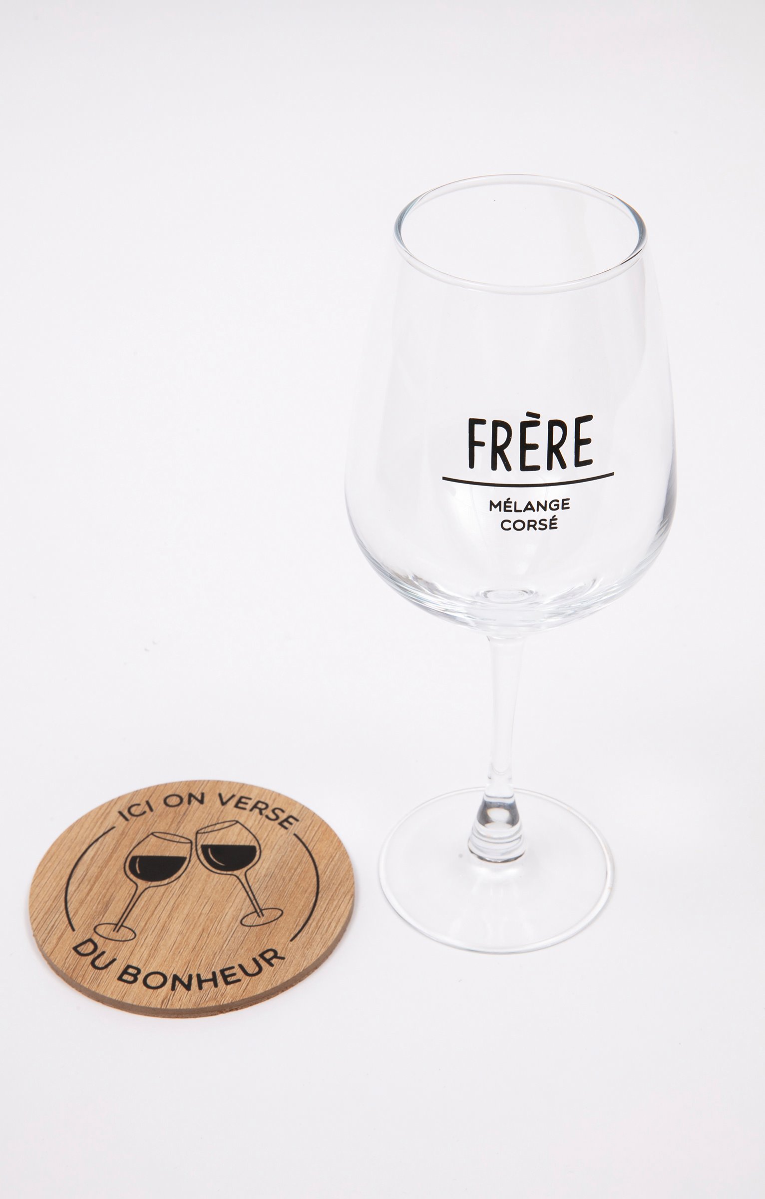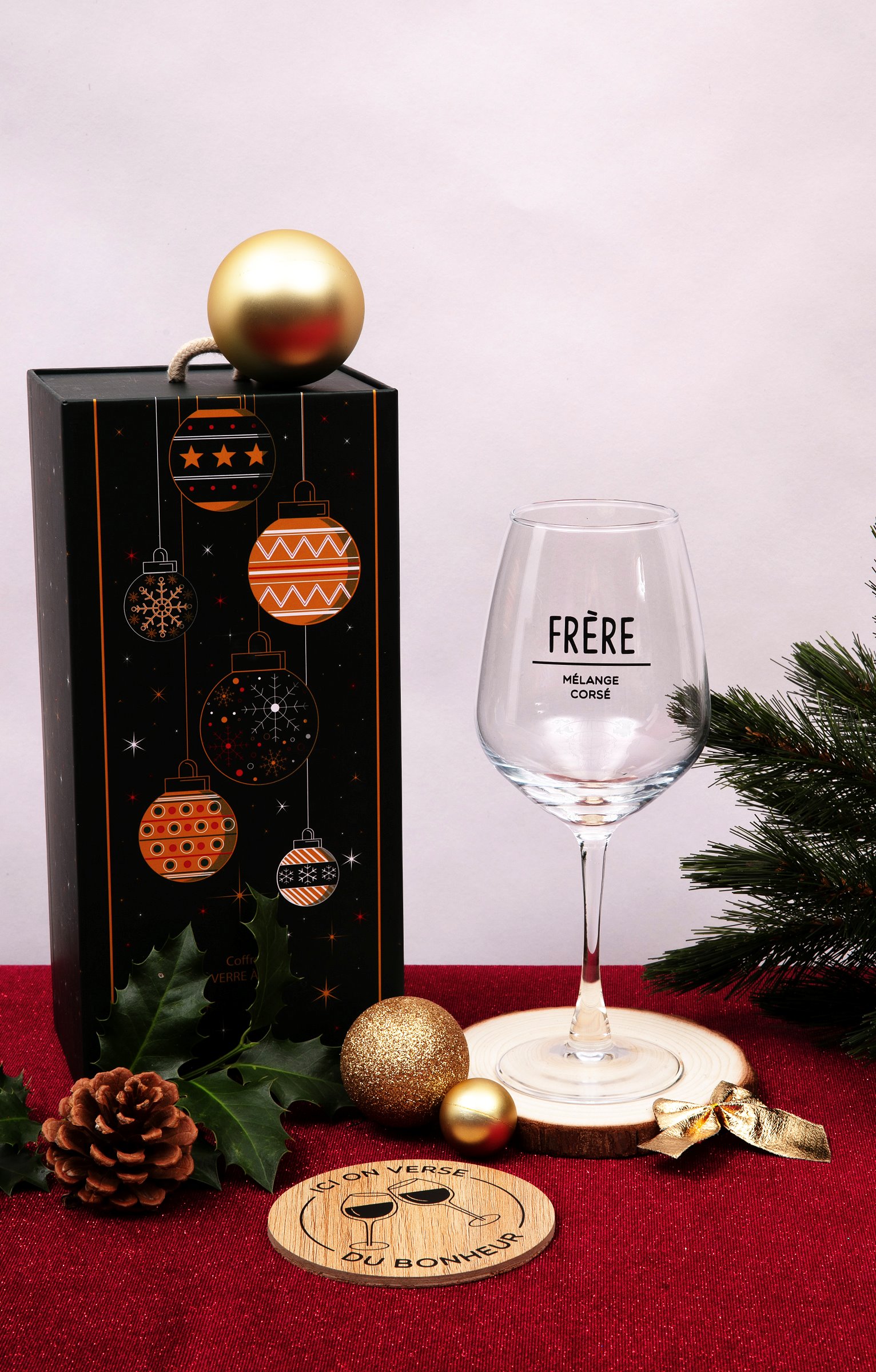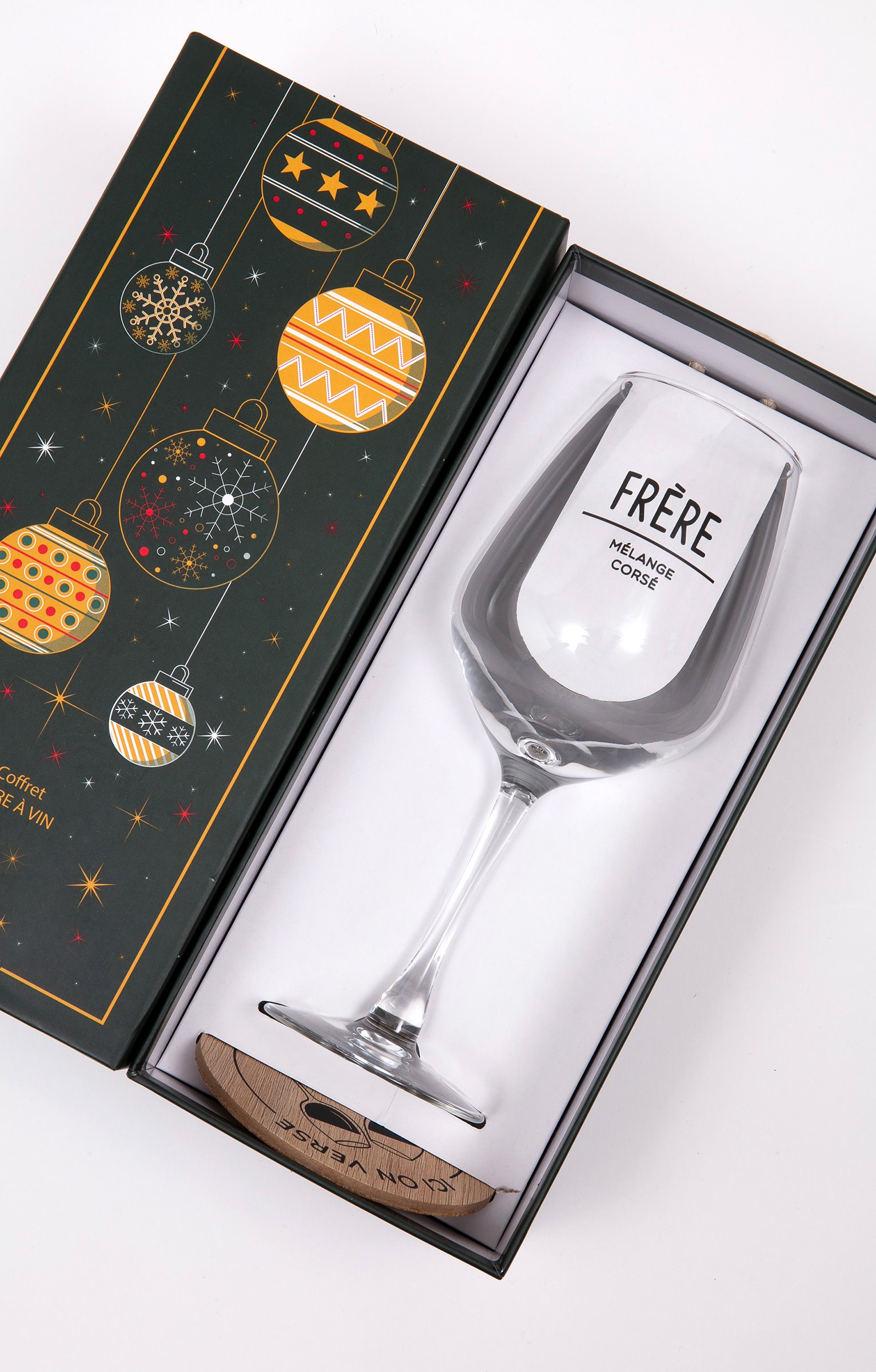 Coffret cadeau vin humoristique, collection spéciale Noël. Comprend un verre à vin et un sous-verre. Message « Frère mélange corsé » sur le verre. Imprimé verres qui se cognent et message « Ici on verse du bonheur » sur le sous-verre. En verre et en bois. Vendu dans un coffret cadeau avec poignée, orné de motifs boules de Noël et offrant la possibilité d'inscrire le nom du destinataire.