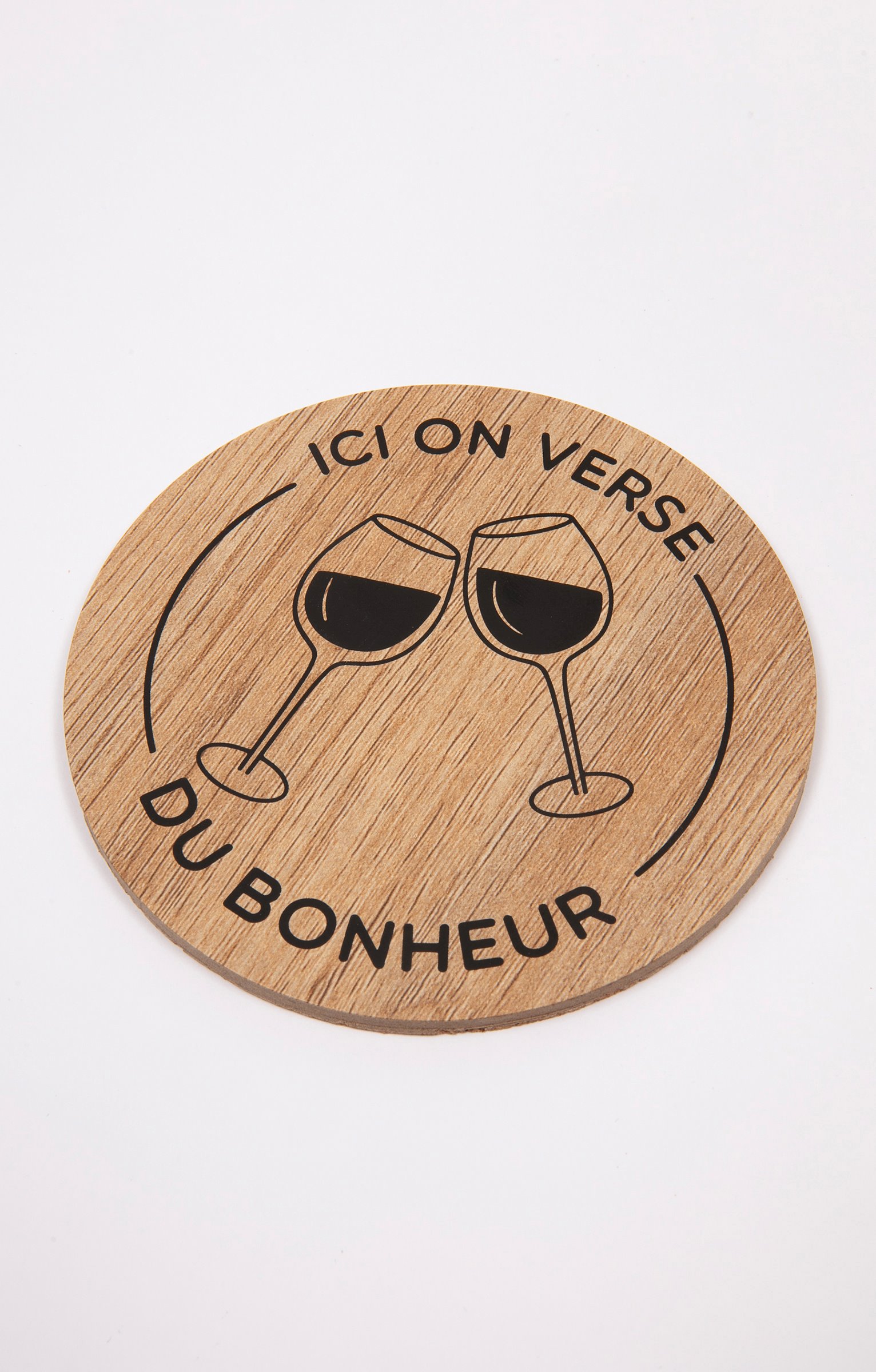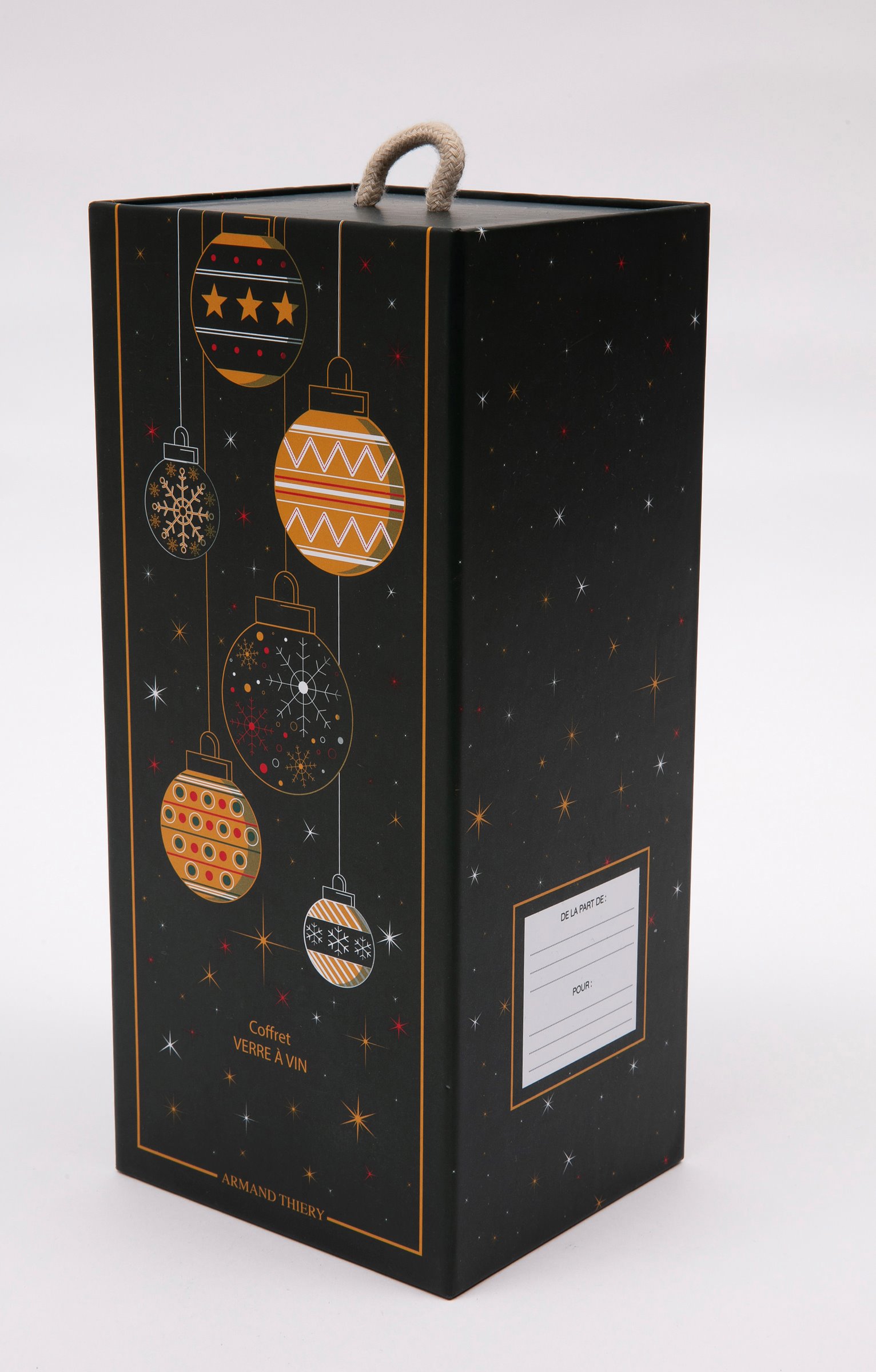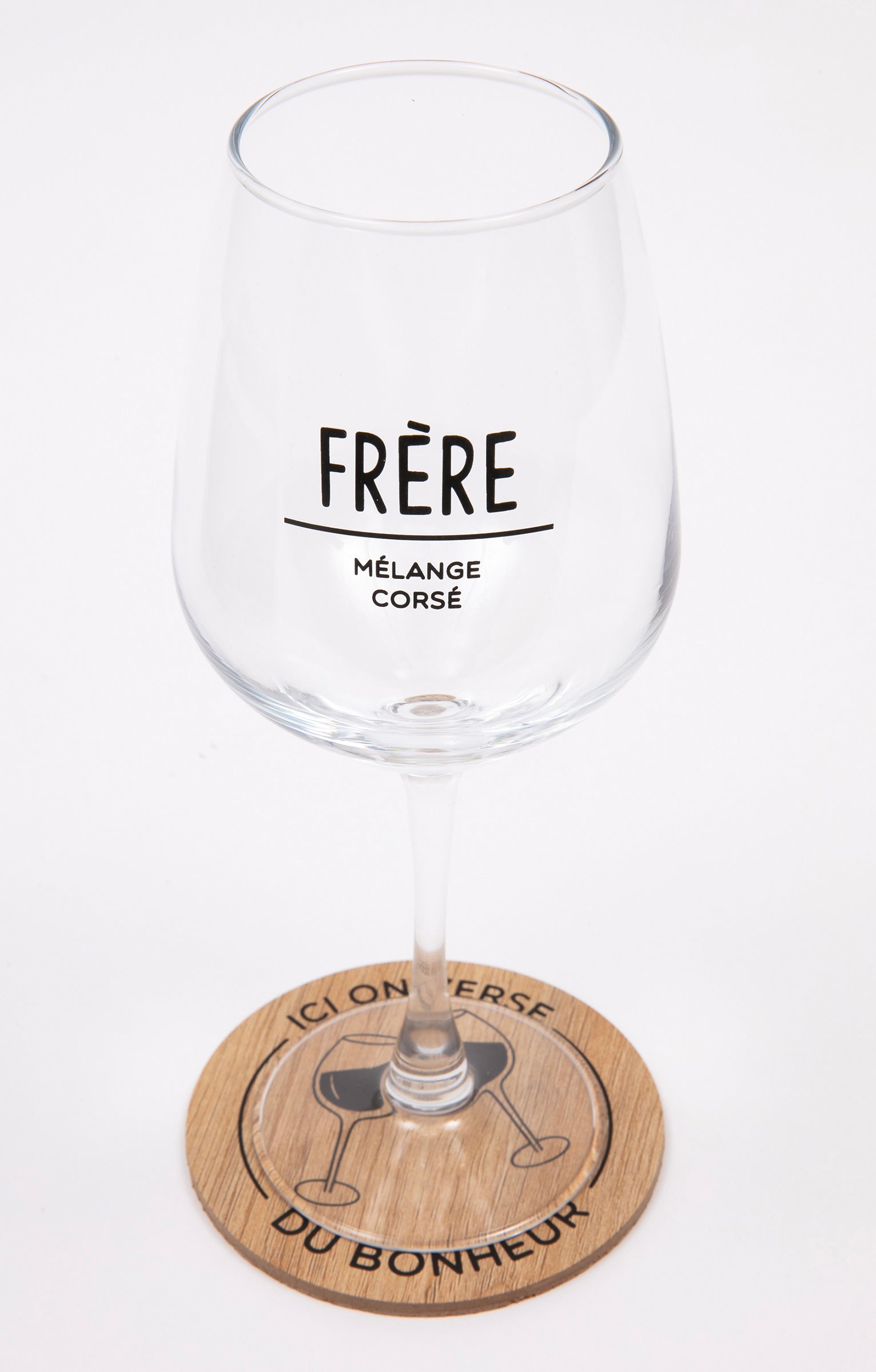 Coffret cadeau vin humoristique, collection spéciale Noël. Comprend un verre à vin et un sous-verre. Message « Frère mélange corsé » sur le verre. Imprimé verres qui se cognent et message « Ici on verse du bonheur » sur le sous-verre. En verre et en bois. Vendu dans un coffret cadeau avec poignée, orné de motifs boules de Noël et offrant la possibilité d'inscrire le nom du destinataire.