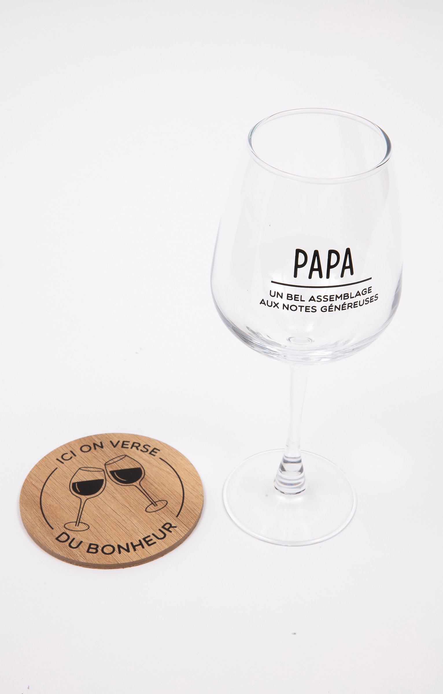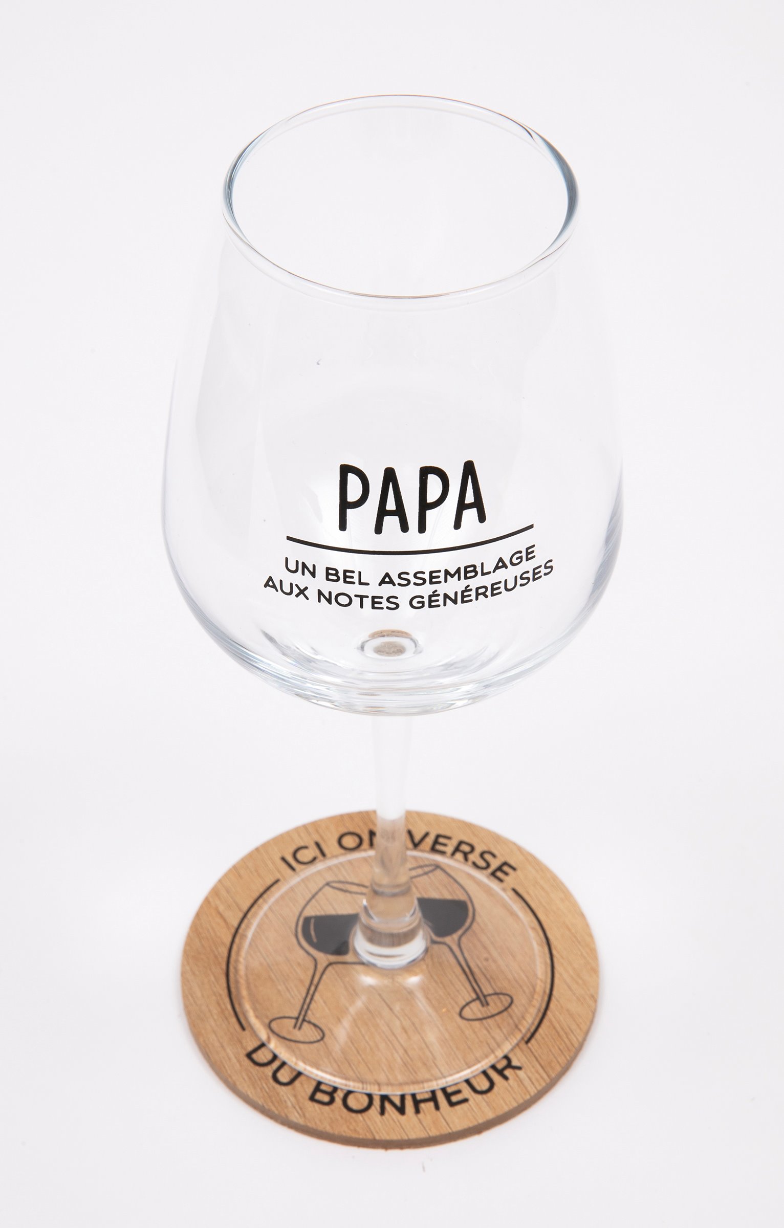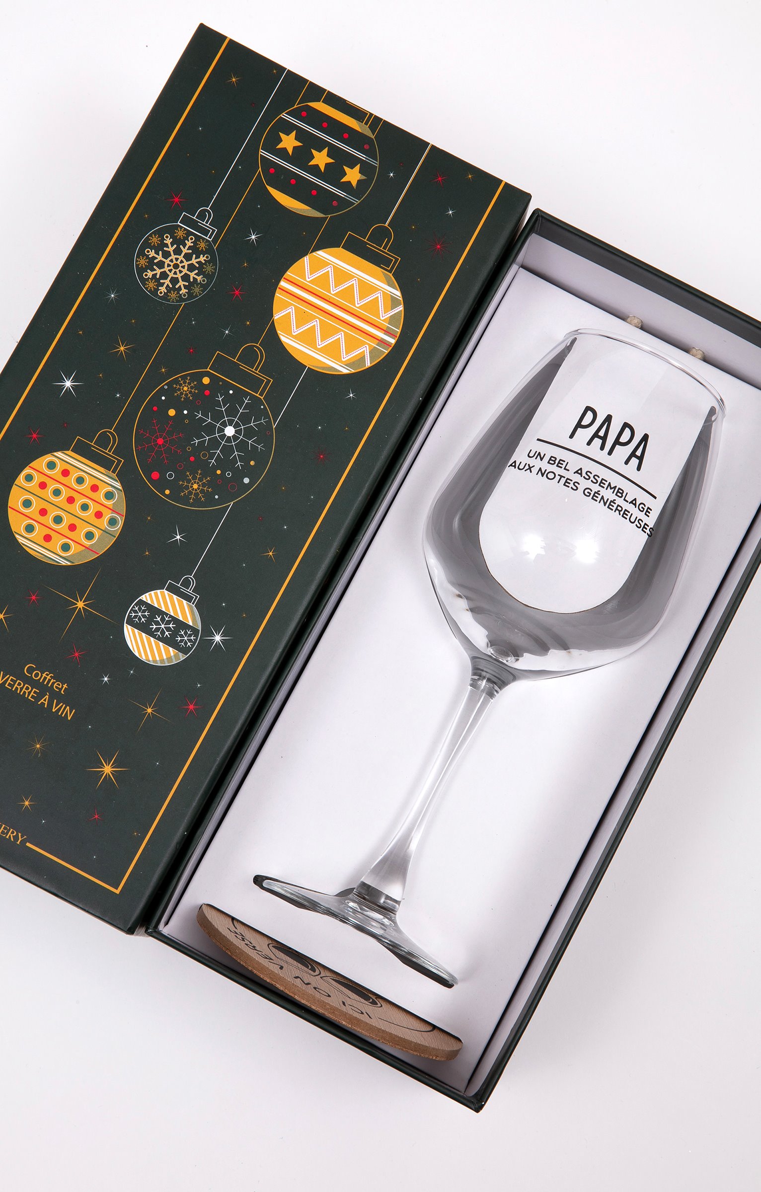 Coffret cadeau vin humoristique, collection spéciale Noël. Comprend un verre à vin et un sous-verre. Message « Papa un bel assemblage aux notes généreuses » sur le verre. Imprimé verres qui se cognent et message « Ici on verse du bonheur » sur le sous-verre. En verre et en bois. Vendu dans un coffret cadeau avec poignée, orné de motifs boules de Noël et offrant la possibilité d'inscrire le nom du destinataire.