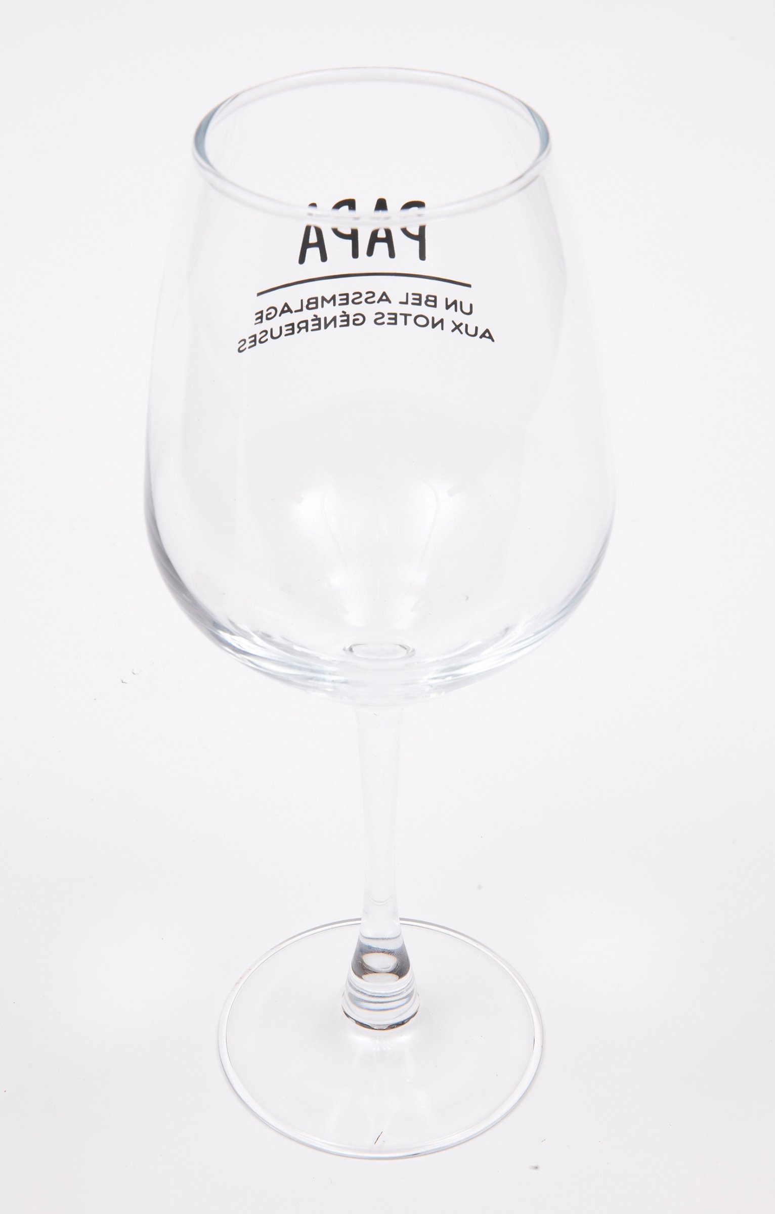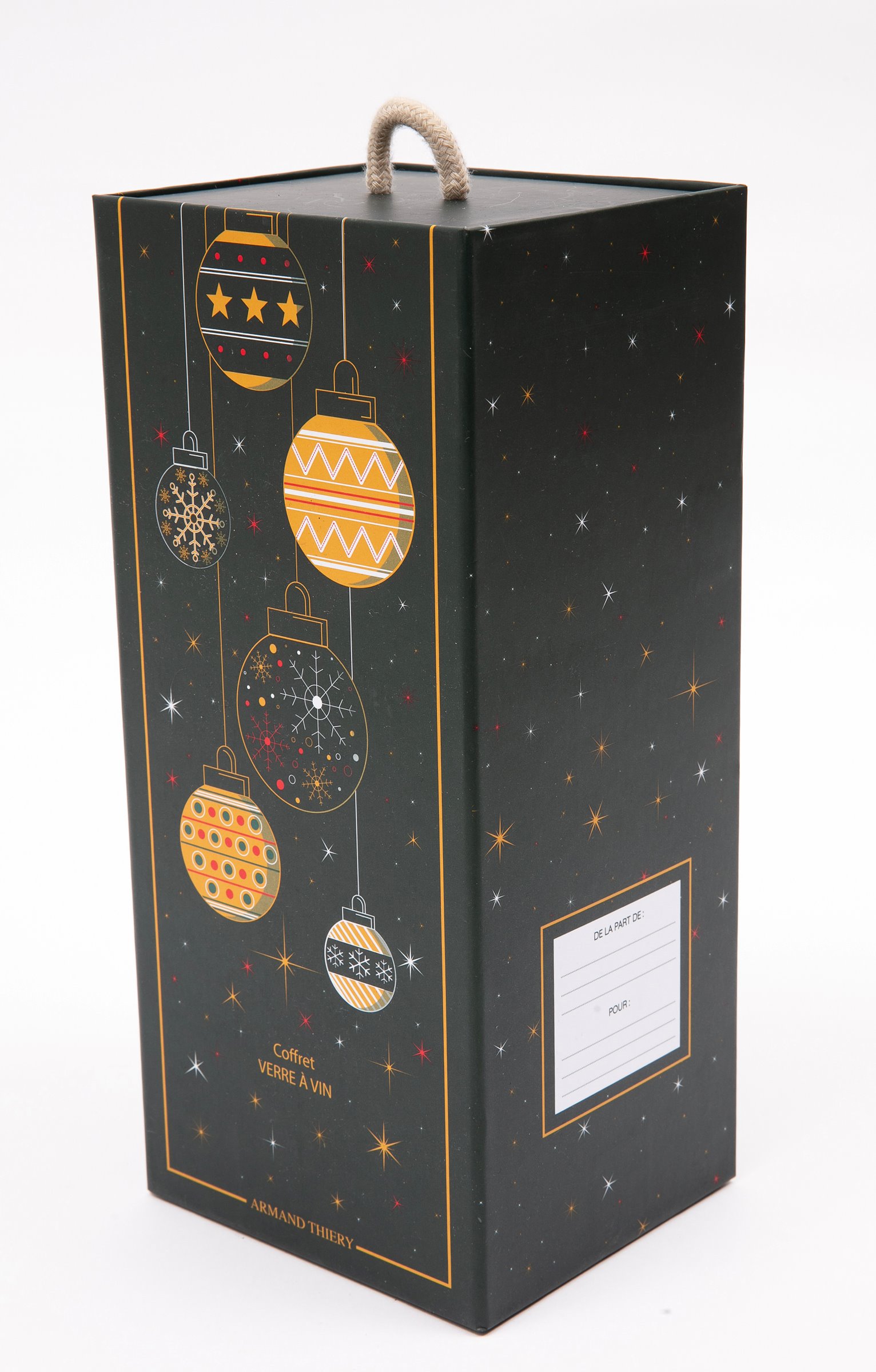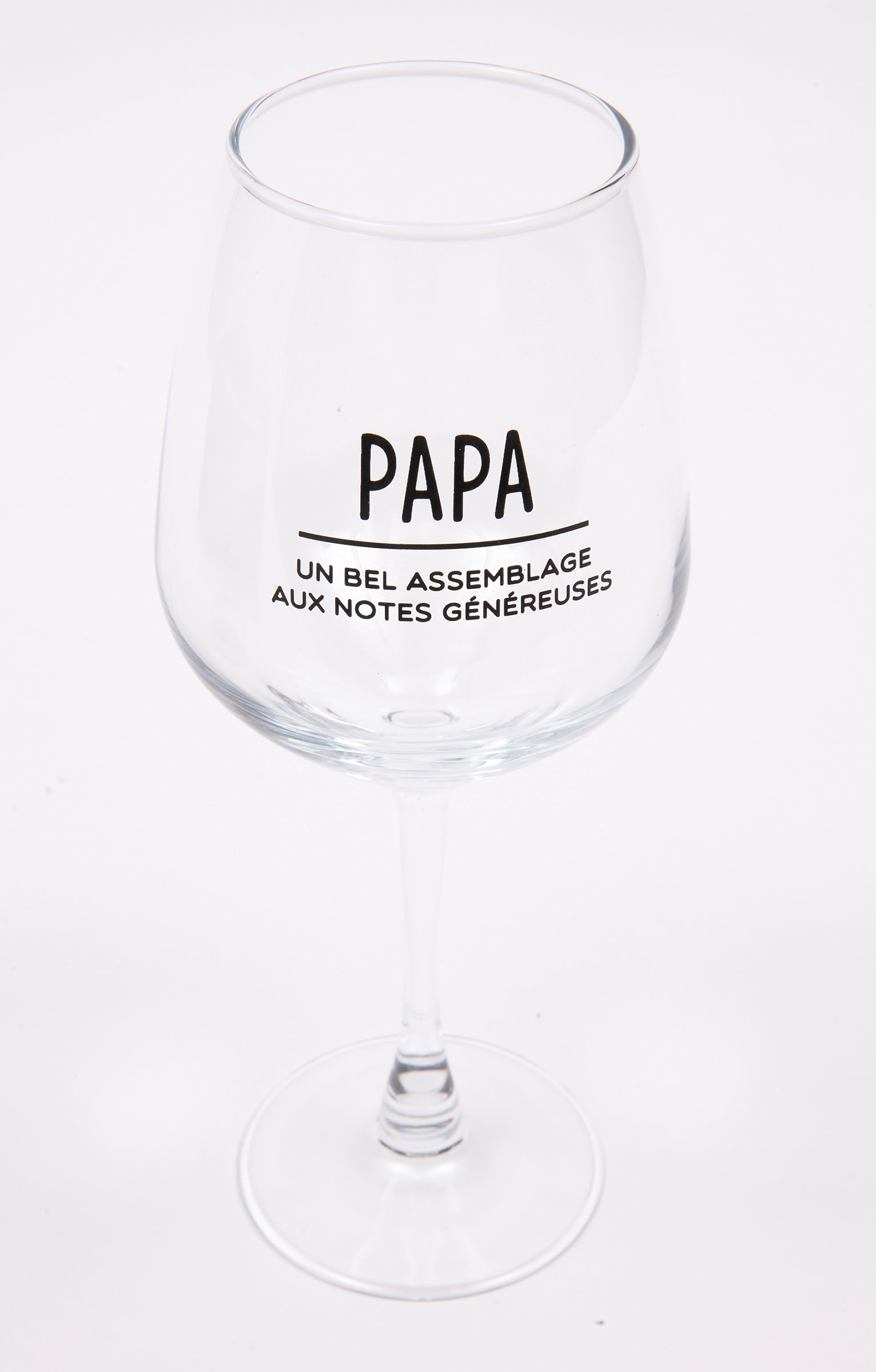 Coffret cadeau vin humoristique, collection spéciale Noël. Comprend un verre à vin et un sous-verre. Message « Papa un bel assemblage aux notes généreuses » sur le verre. Imprimé verres qui se cognent et message « Ici on verse du bonheur » sur le sous-verre. En verre et en bois. Vendu dans un coffret cadeau avec poignée, orné de motifs boules de Noël et offrant la possibilité d'inscrire le nom du destinataire.