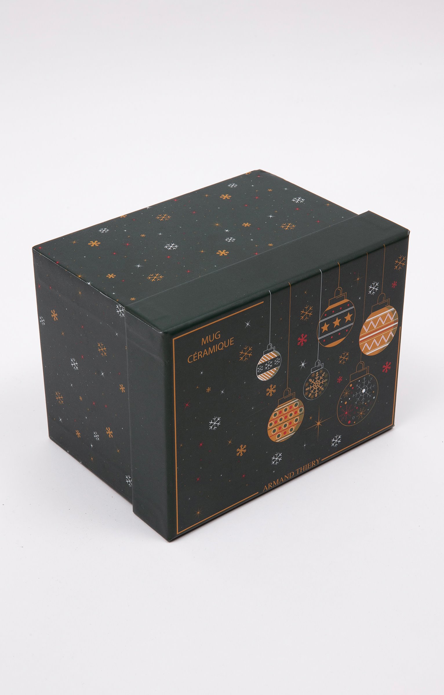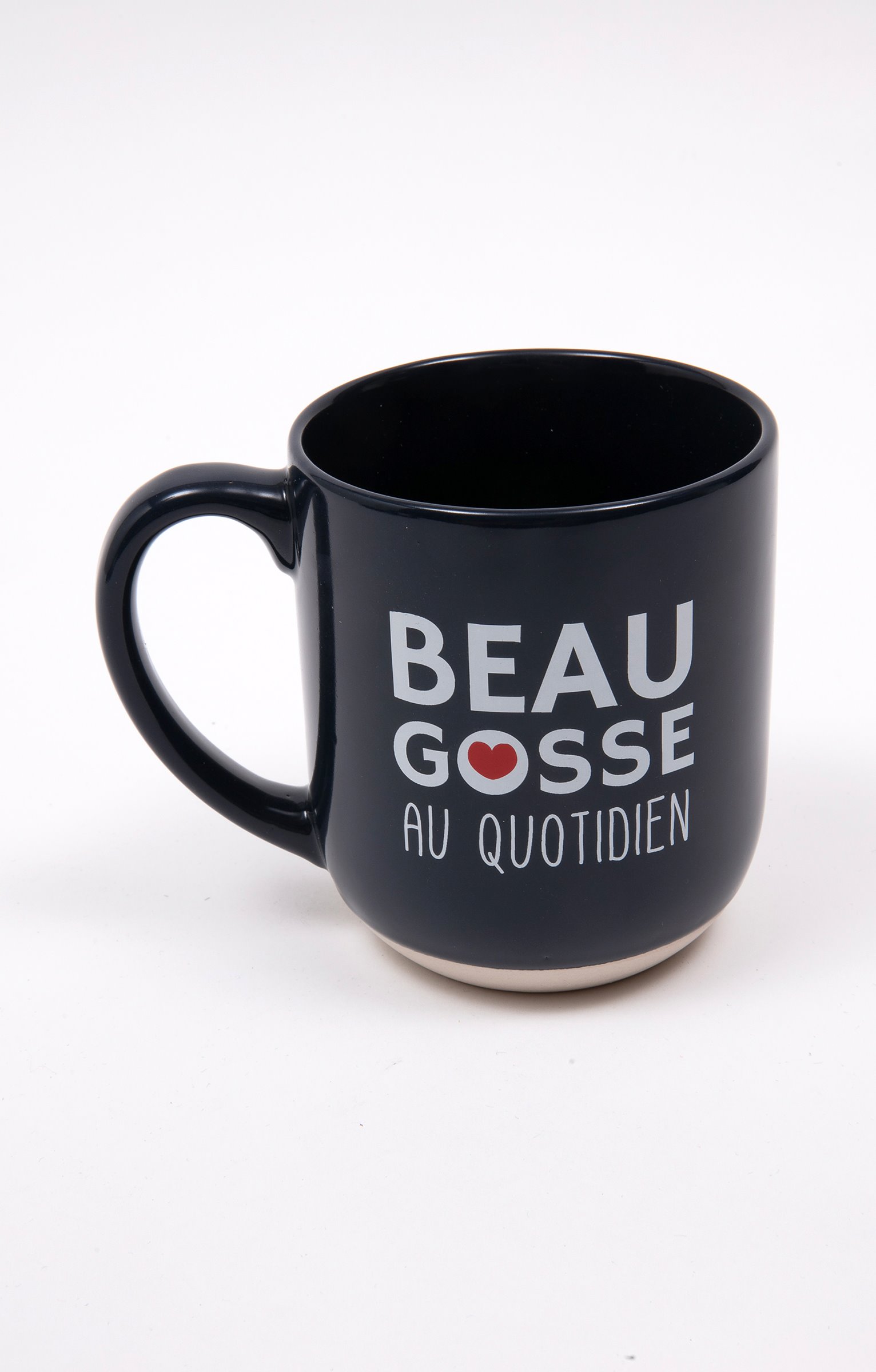 Mug à message humoristique en céramique. Collection d'idées cadeaux de Noël. Tasse haute avec anse. Message «Beau gosse au quotidien» et cœur imprimés en tons multicolores devant. Base en teinte contrastée. Vendu en coffret cadeau, prêt à offrir. Étiquette nominative à remplir sur le côté de la boîte.