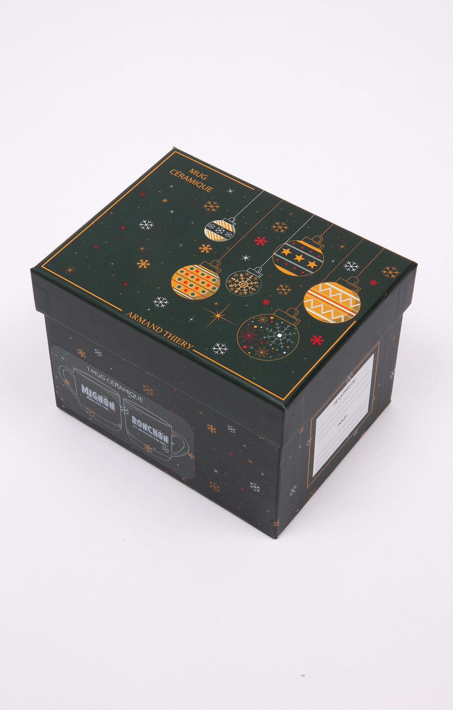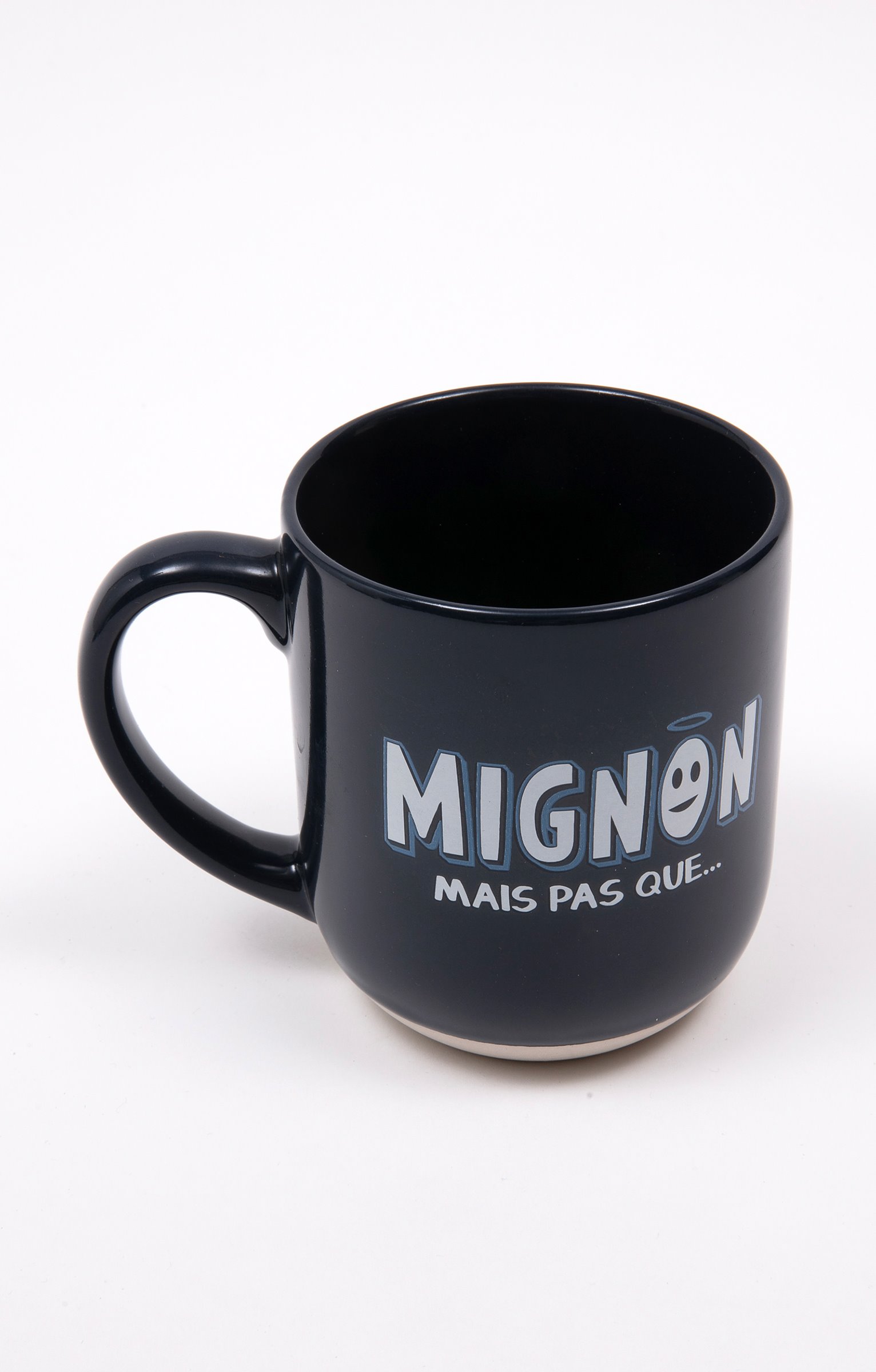 Mug à message humoristique en céramique. Collection d'idées cadeaux de Noël. Message «Mignon mais pas que…» d'un côté et «Ronchon et bien plus encore!» de l'autre côté. Lettres stylisées façon smileys ange et râleur. Avec anse. En céramique. Vendu en coffret cadeau, prêt à offrir. Étiquette nominative à remplir sur le côté de la boîte.