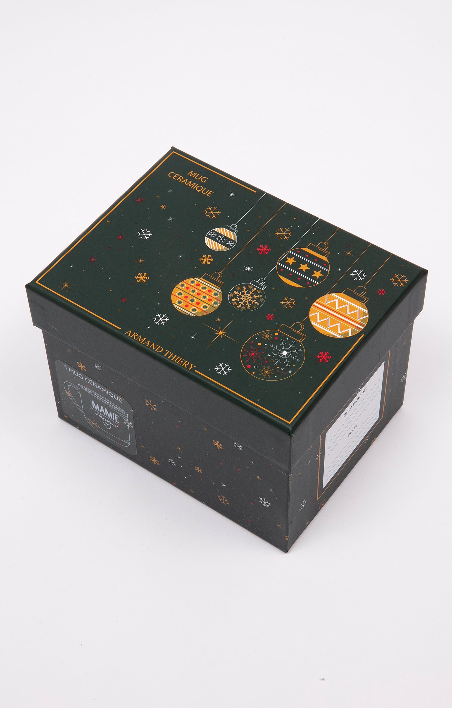 Mug à message en céramique. Collection d'idées cadeaux de Noël. Message «Mamie d'amour» à l'extérieur et «Super mamie pour toujours» à l'intérieur. Motif cœur sous le message à l'extérieur. Avec anse. En céramique. Vendu en coffret cadeau, prêt à offrir. Étiquette nominative à remplir sur le côté de la boîte.