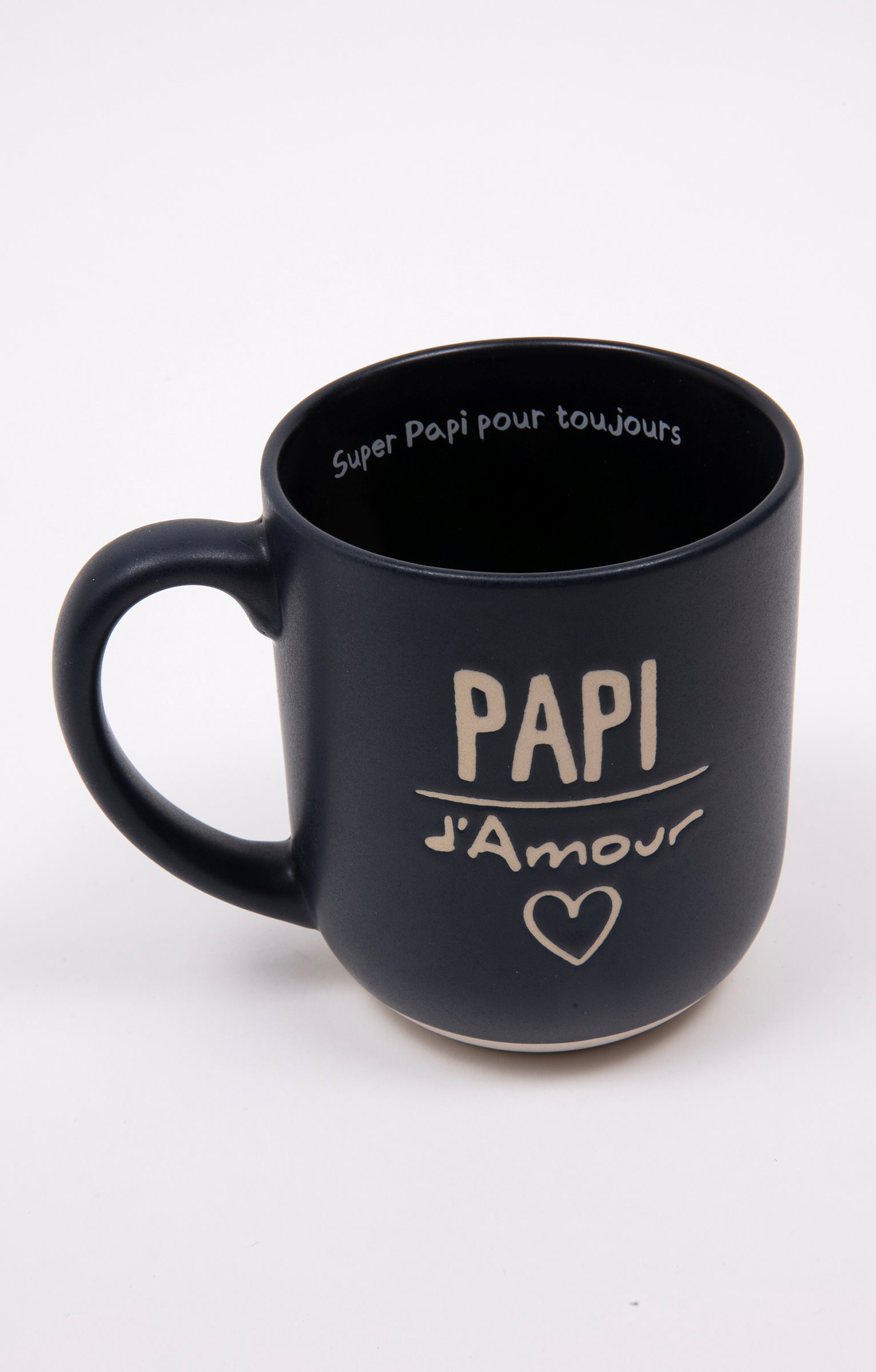 Mug à message en céramique. Collection d'idées cadeaux de Noël. Message «?Papi d'amour?» à l'extérieur et «?Super papi pour toujours?» à l'intérieur. Motif cœur sous le message à l'extérieur. Avec anse. En céramique. Vendu en coffret cadeau, prêt à offrir. Étiquette nominative à remplir sur le côté de la boîte.