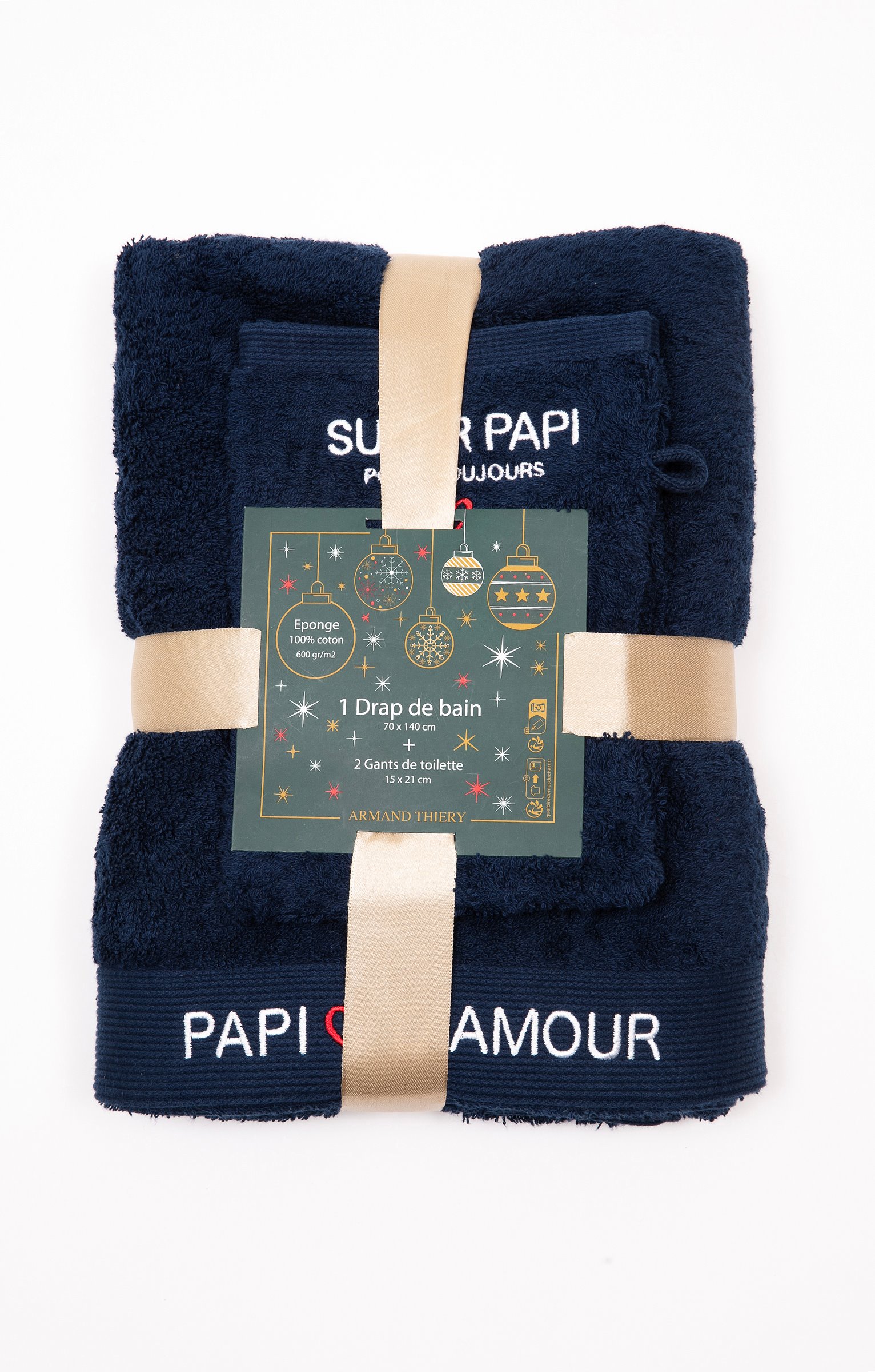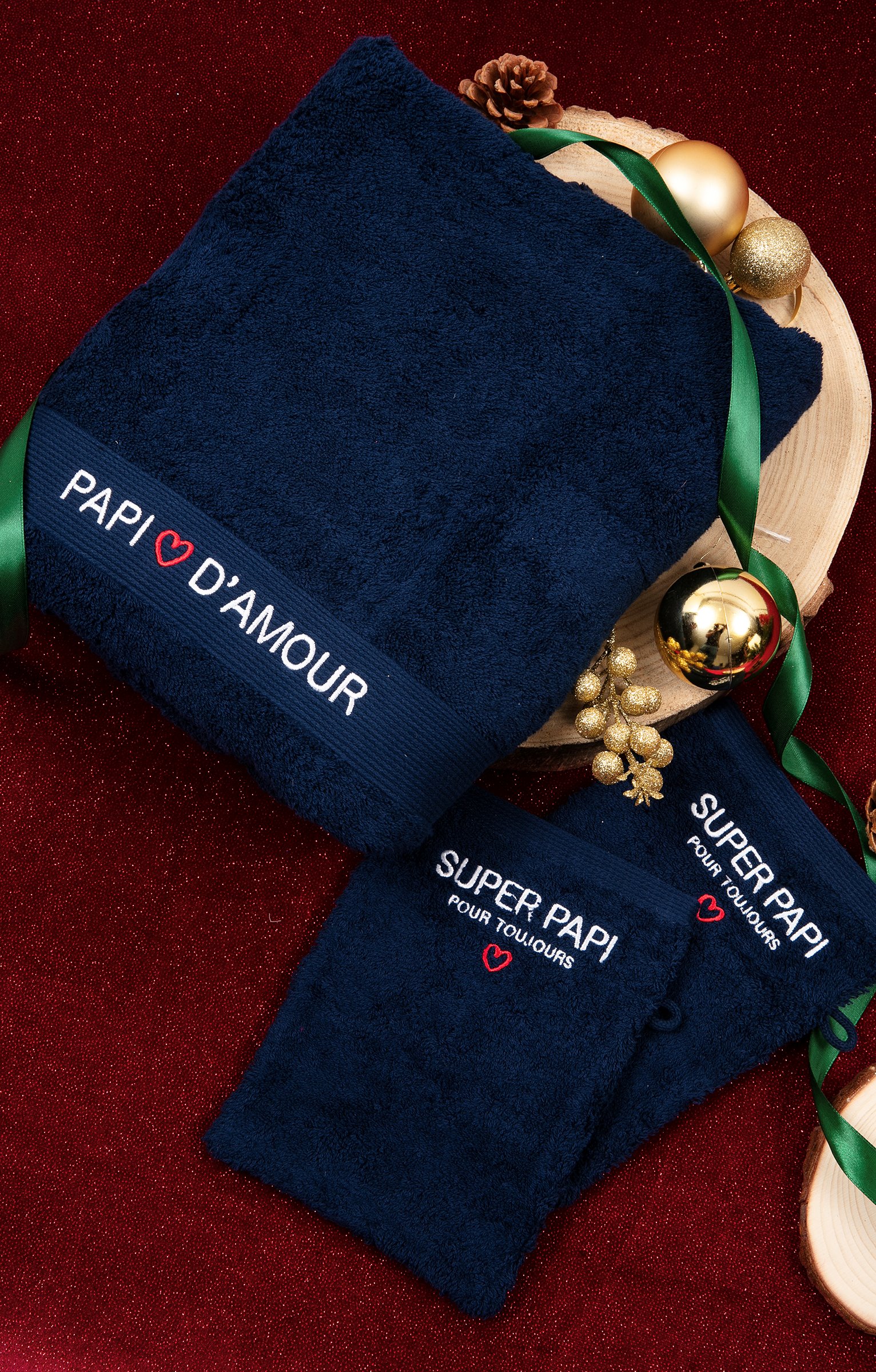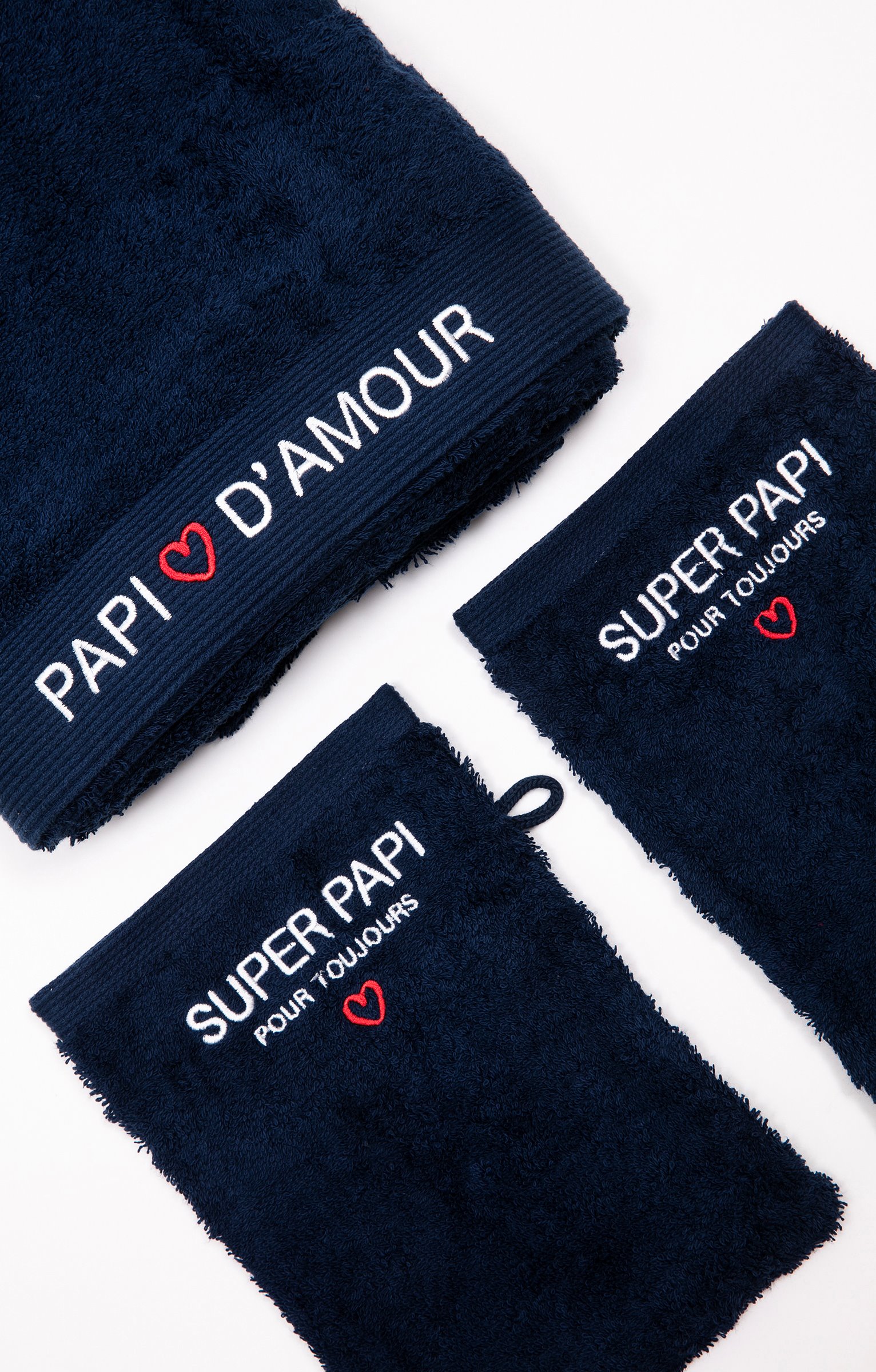 Lot de drap de bain avec 2 gants de toilette brodés. Un drap de bain. Forme rectangulaire. 70 x 140 cm de long. 2 gants de toilette rectangulaires. 15 x 21 cm de long. Bride en cordon ton sur ton. Coloris uni. Tissu éponge. Bordures dobby côtelées à motifs brodés contrastants. Message « Papi d'amour » sur le drap de bain et « Super Papi pour toujours » sur les gants. Détail cœur contrastant.