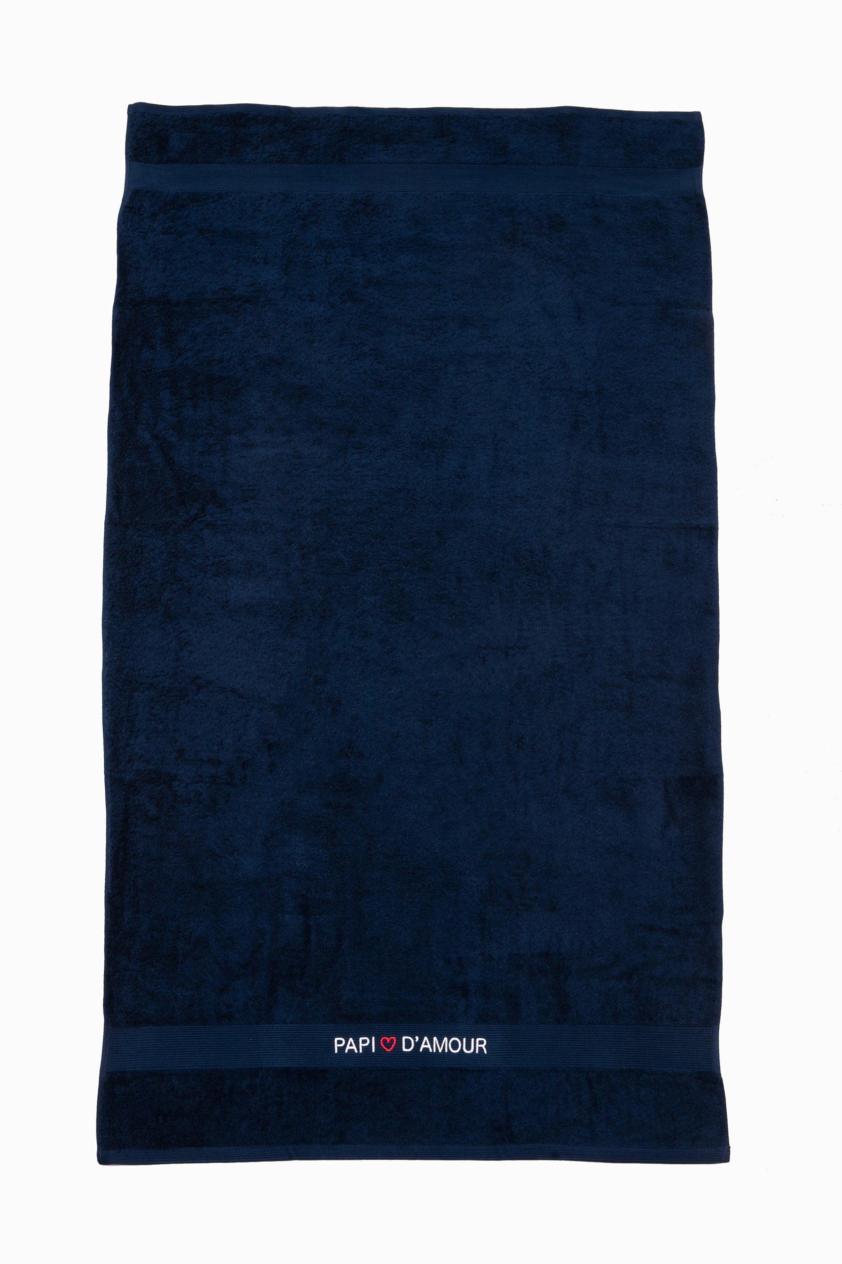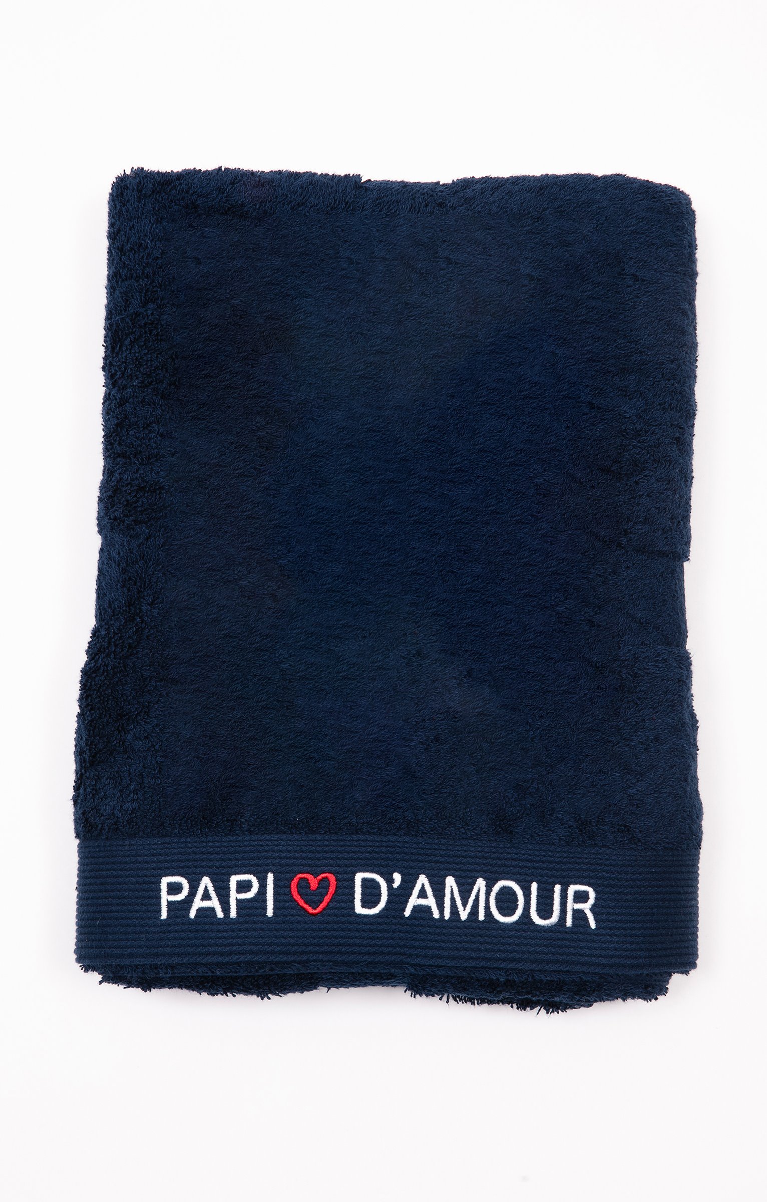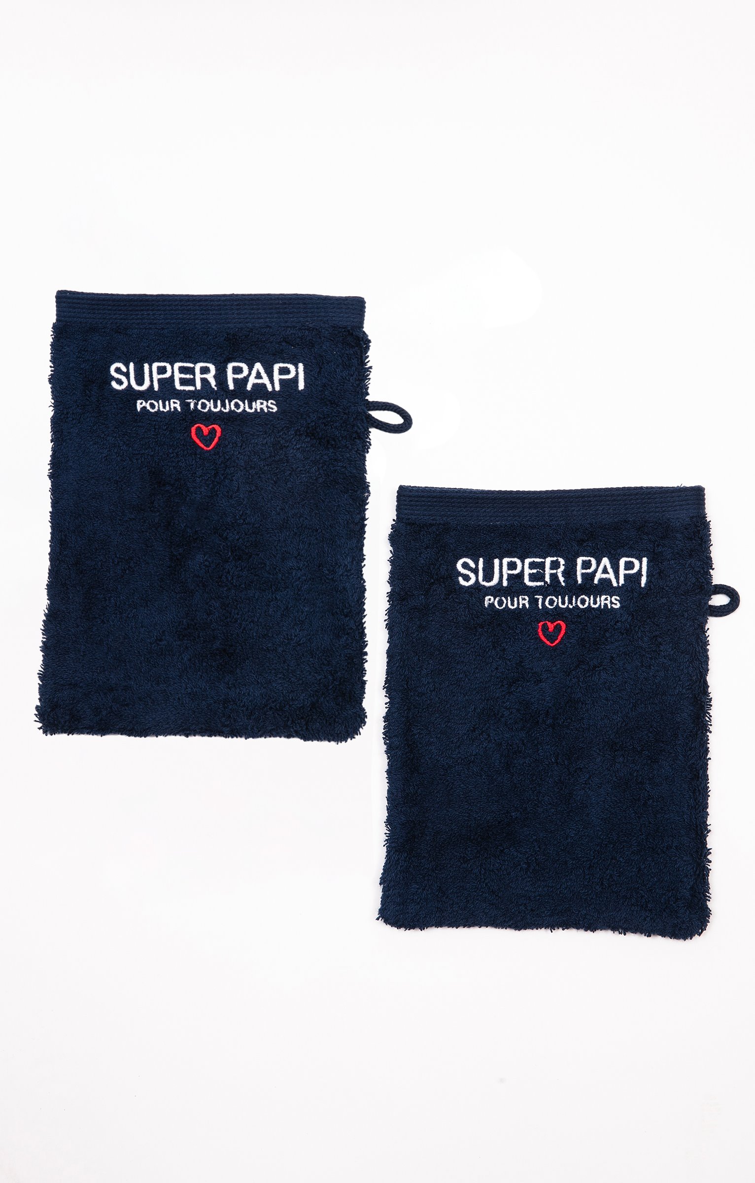 Lot de drap de bain avec 2 gants de toilette brodés. Un drap de bain. Forme rectangulaire. 70 x 140 cm de long. 2 gants de toilette rectangulaires. 15 x 21 cm de long. Bride en cordon ton sur ton. Coloris uni. Tissu éponge. Bordures dobby côtelées à motifs brodés contrastants. Message « Papi d'amour » sur le drap de bain et « Super Papi pour toujours » sur les gants. Détail cœur contrastant.