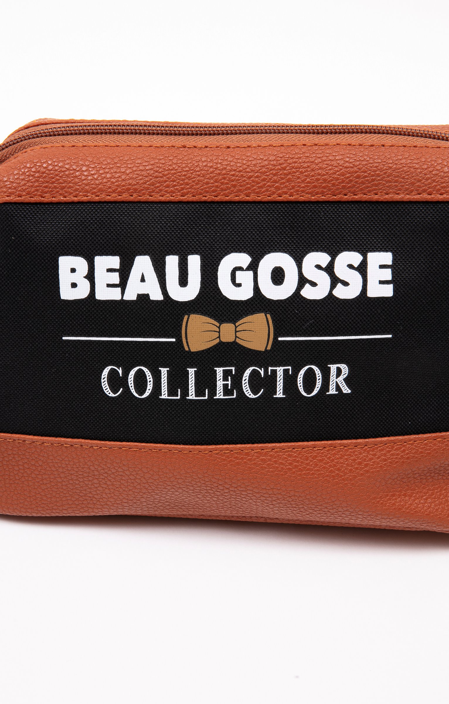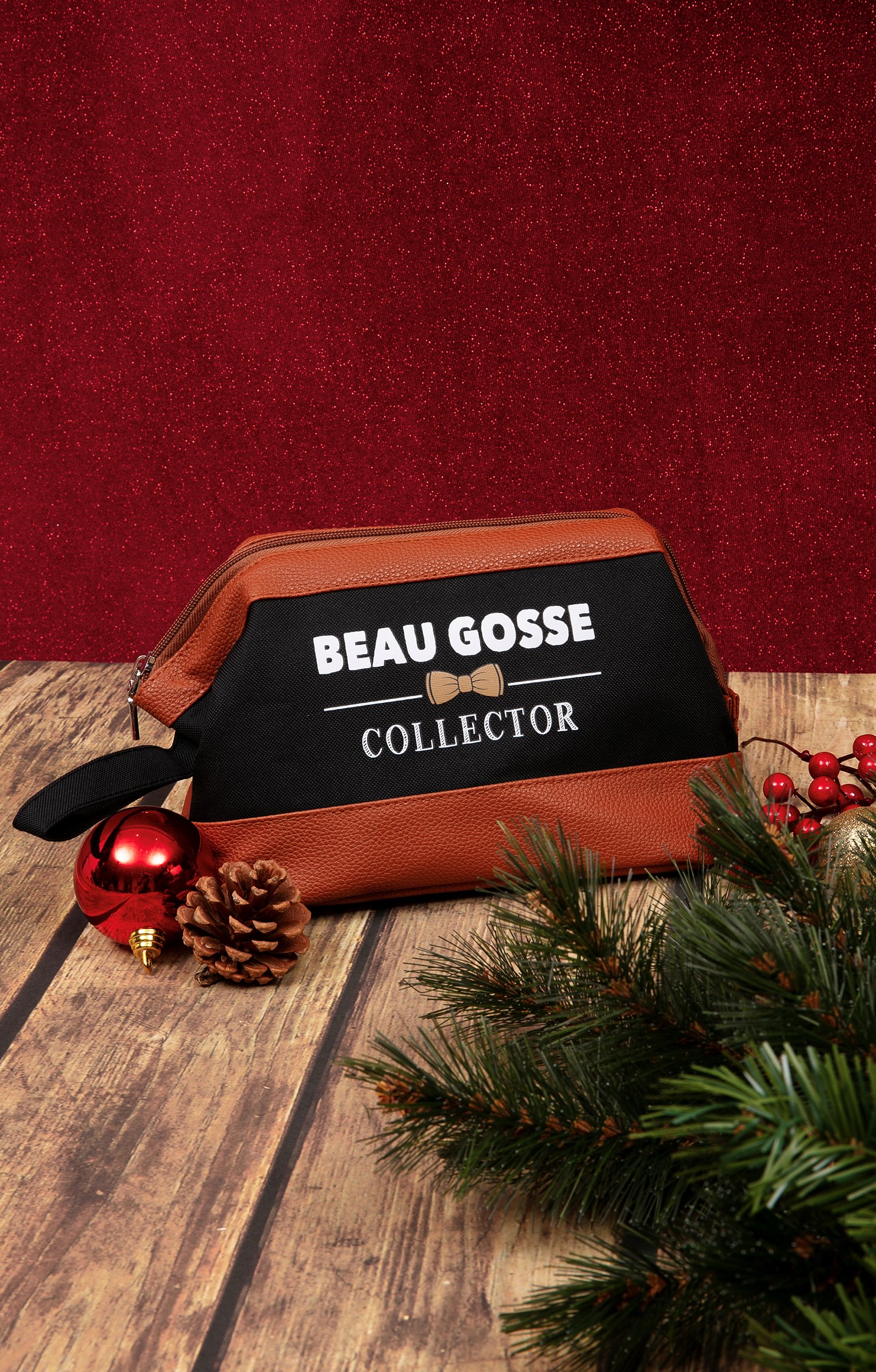 Trousse humoristique, collection spéciale Noël. Forme rectangulaire. Fermeture par un zip sur le dessus. Modèle bicolore avec une large bande contrastante au milieu. Message « Beau gosse collector » imprimé au milieu dans une couleur contrastante. « Beau gosse » et « collector » séparés par un motif nœud papillon. Bande centrale en tissu, reste du modèle façon cuir grainé. Doublure intérieure à motif carreaux.