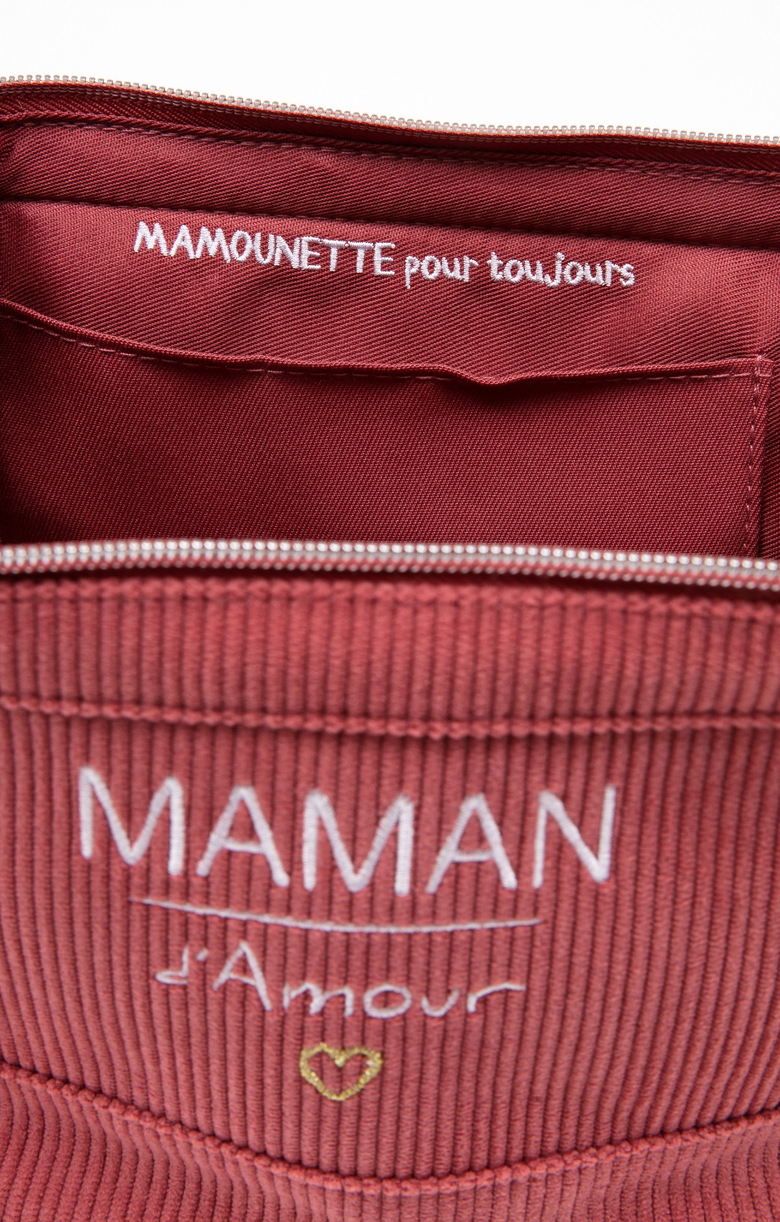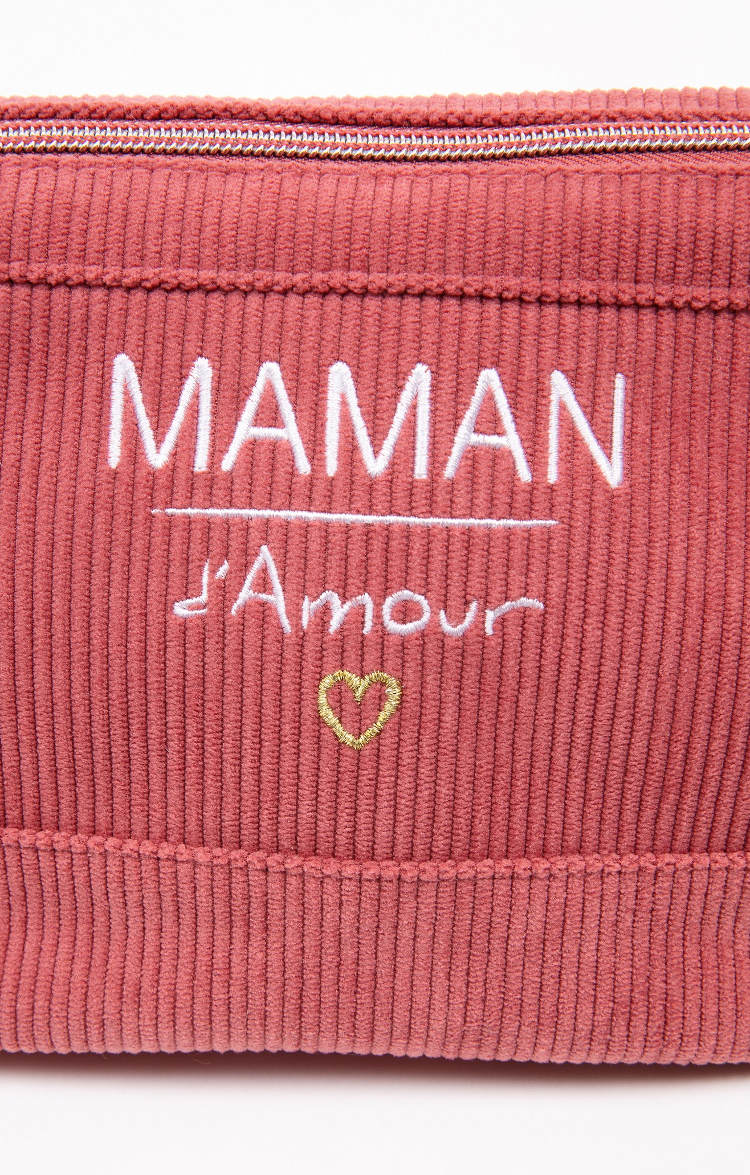 Trousse zippée en velours. Forme trapèze à fond plat. Grand compartiment rectangulaire à l'ouverture. Doublure ton sur ton avec poche intérieure. Fermeture zippée. Message « Maman d'amour » et détail cœur doré sur la face extérieure. « Mamounette pour toujours » surmontant la poche intérieure. Motifs contrastants brodés. Tissu en velours côtelé. Anse en tissu assorti. Fines surpiqûres ton sur ton en finition du modèle.