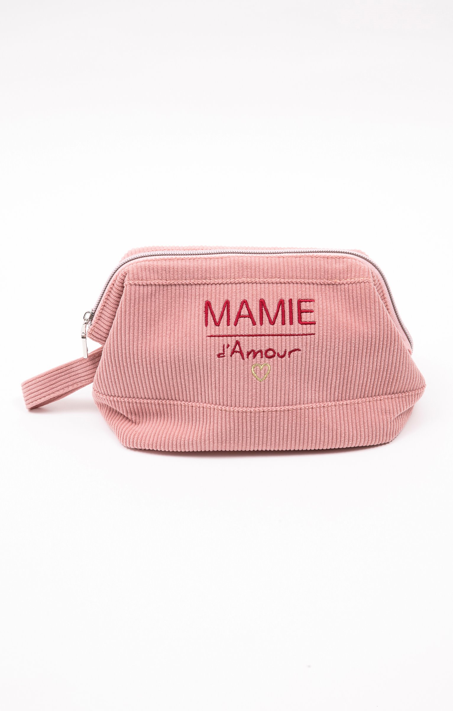 Trousse en velours avec fermeture à zip. Trousse fermée forme trapèze à fond plat. Grand compartiment rectangulaire à l'ouverture. Doublure avec poche plaquée intérieure. Fermeture à zip. Message « Mamie d'amour » et cœur doré sur la façade extérieure. « Super Mamie pour toujours » sur la paroi intérieure. Motifs contrastants brodés. Tissu en velours côtelé. Longue anse en tissu assorti. Fines surpiqûres ton sur ton en finition du modèle.