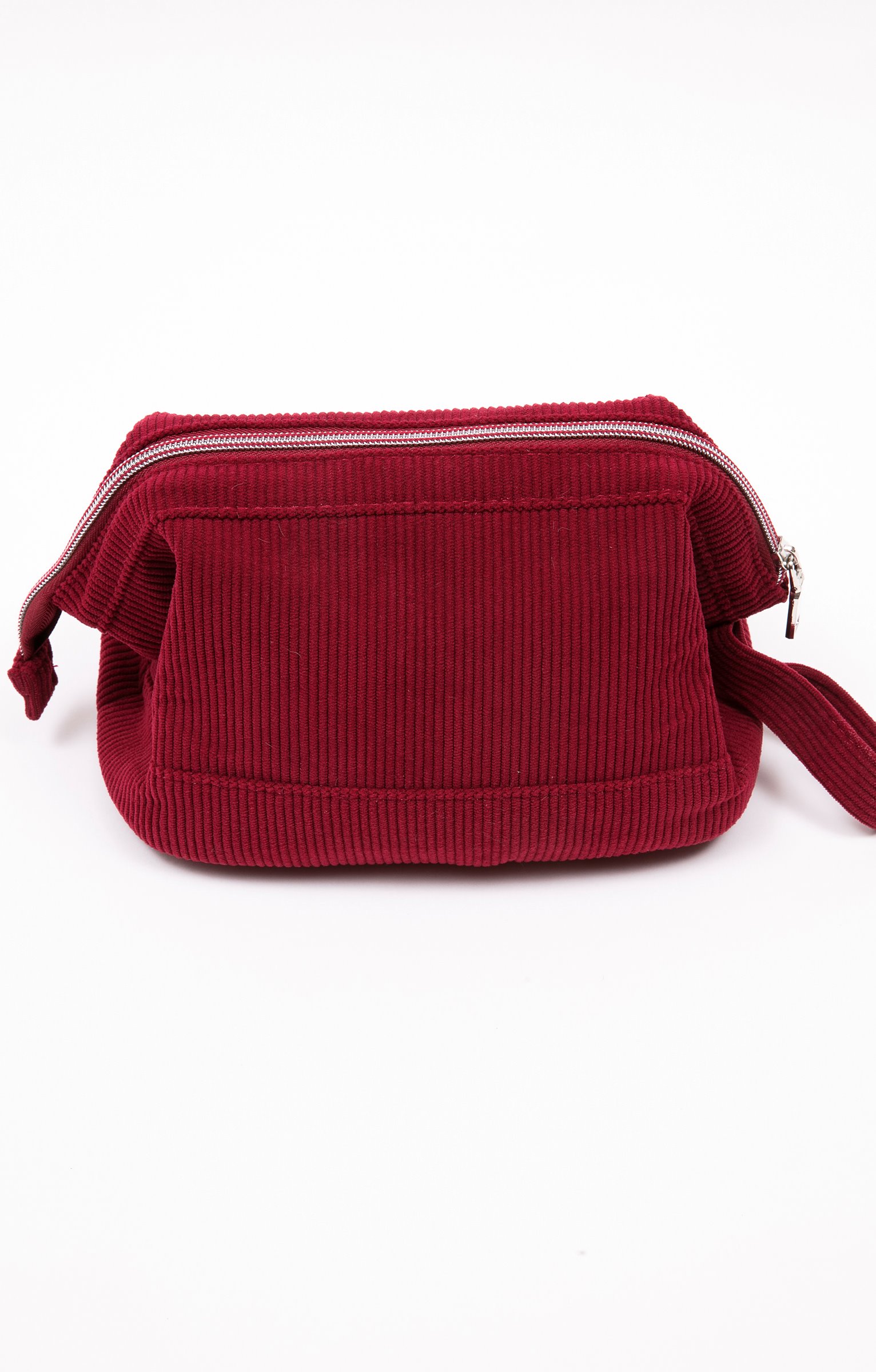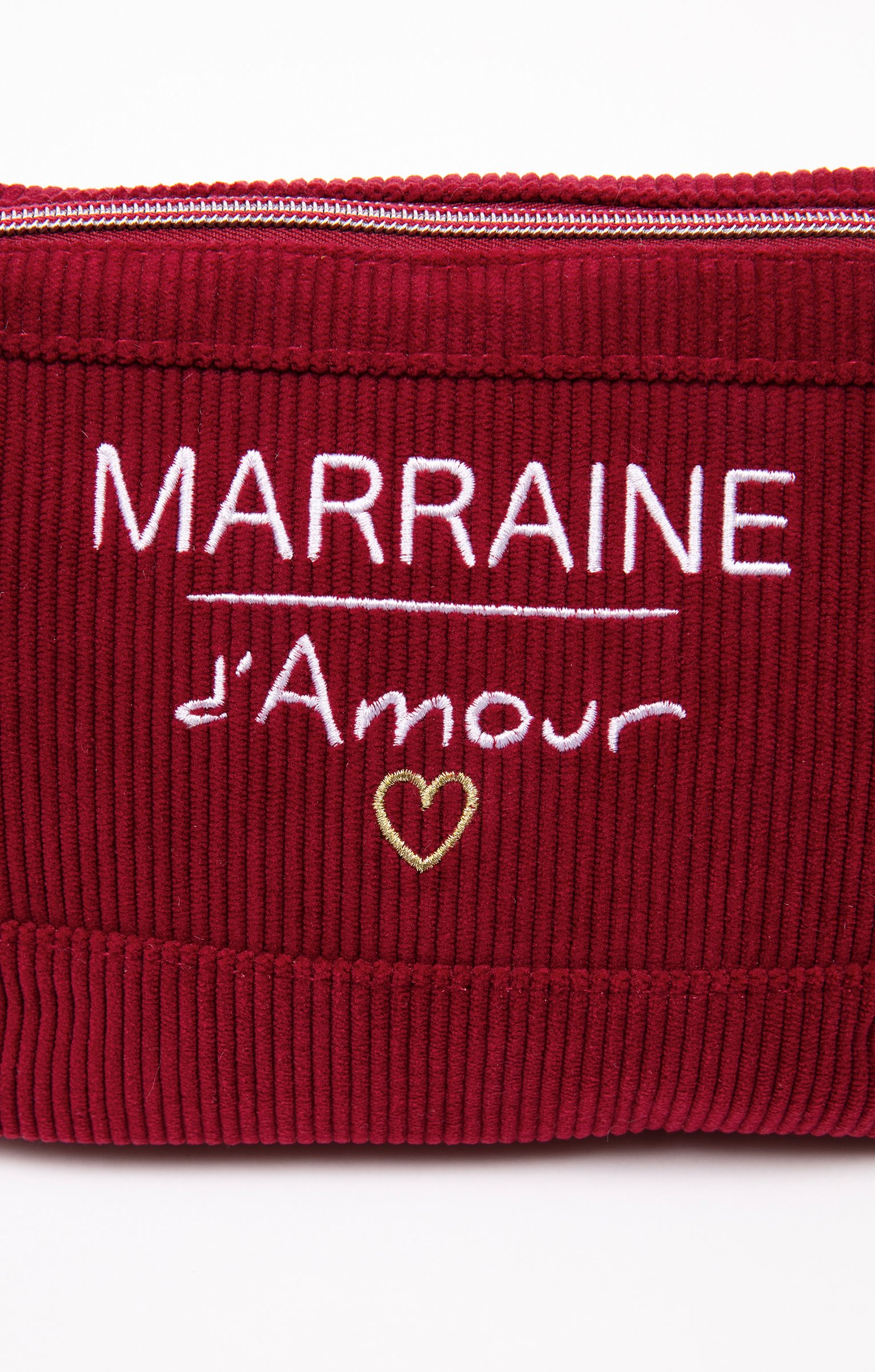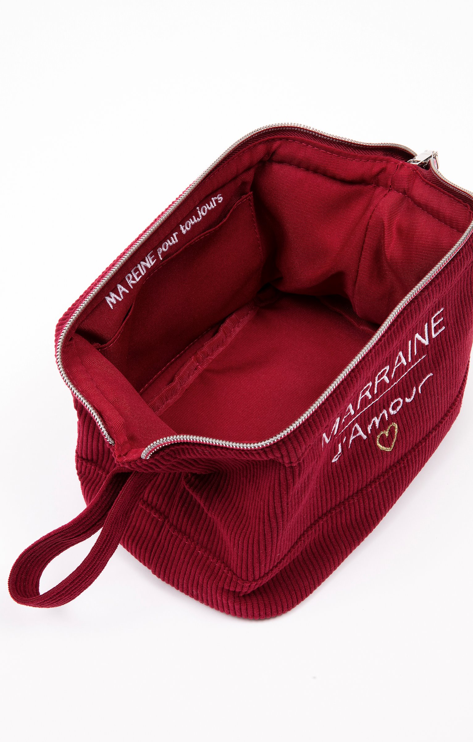 Trousse zippée en velours. Forme trapèze à fond plat. Trousse ouverte rectangulaire avec grand compartiment. Doublure ton sur ton avec poche intérieure. Fermeture à zip. Message « Marraine d'amour » et détail cœur placés sur la façade extérieure. « Ma Reine pour toujours » sur la paroi intérieure. Motifs contrastants brodés. Tissu en velours côtelé. Longue anse en velours. Fines surpiqûres ton sur ton en finition du modèle.
