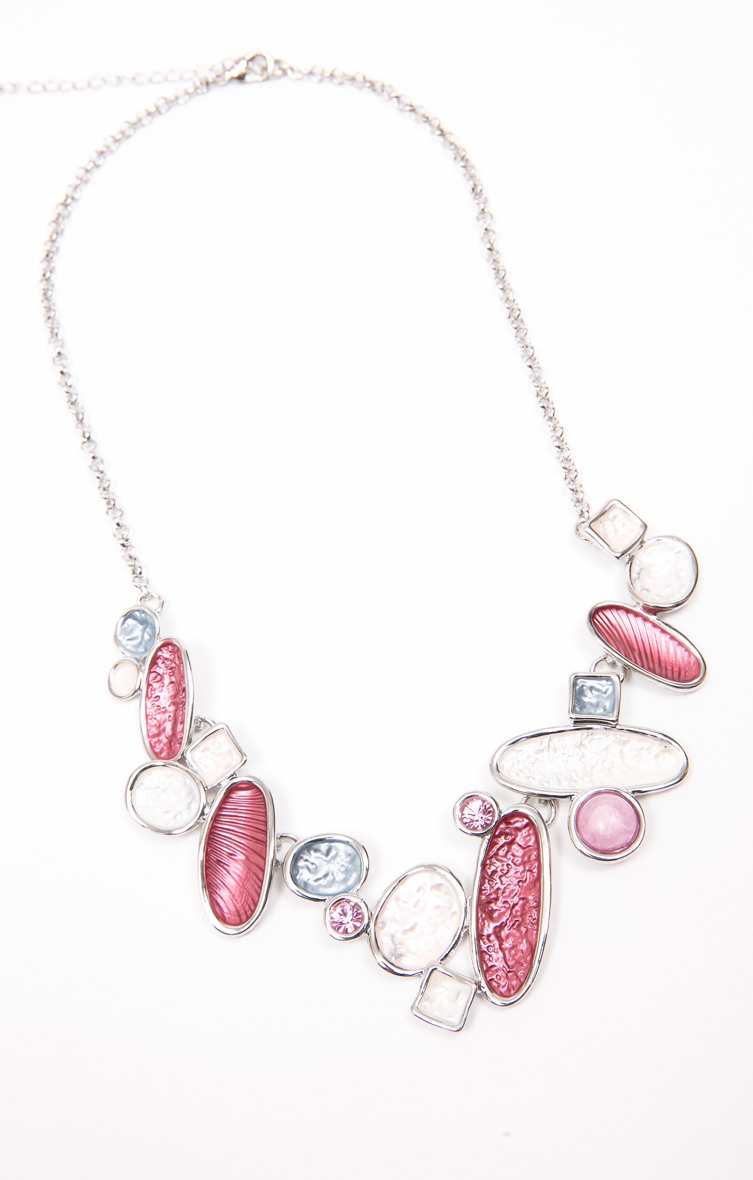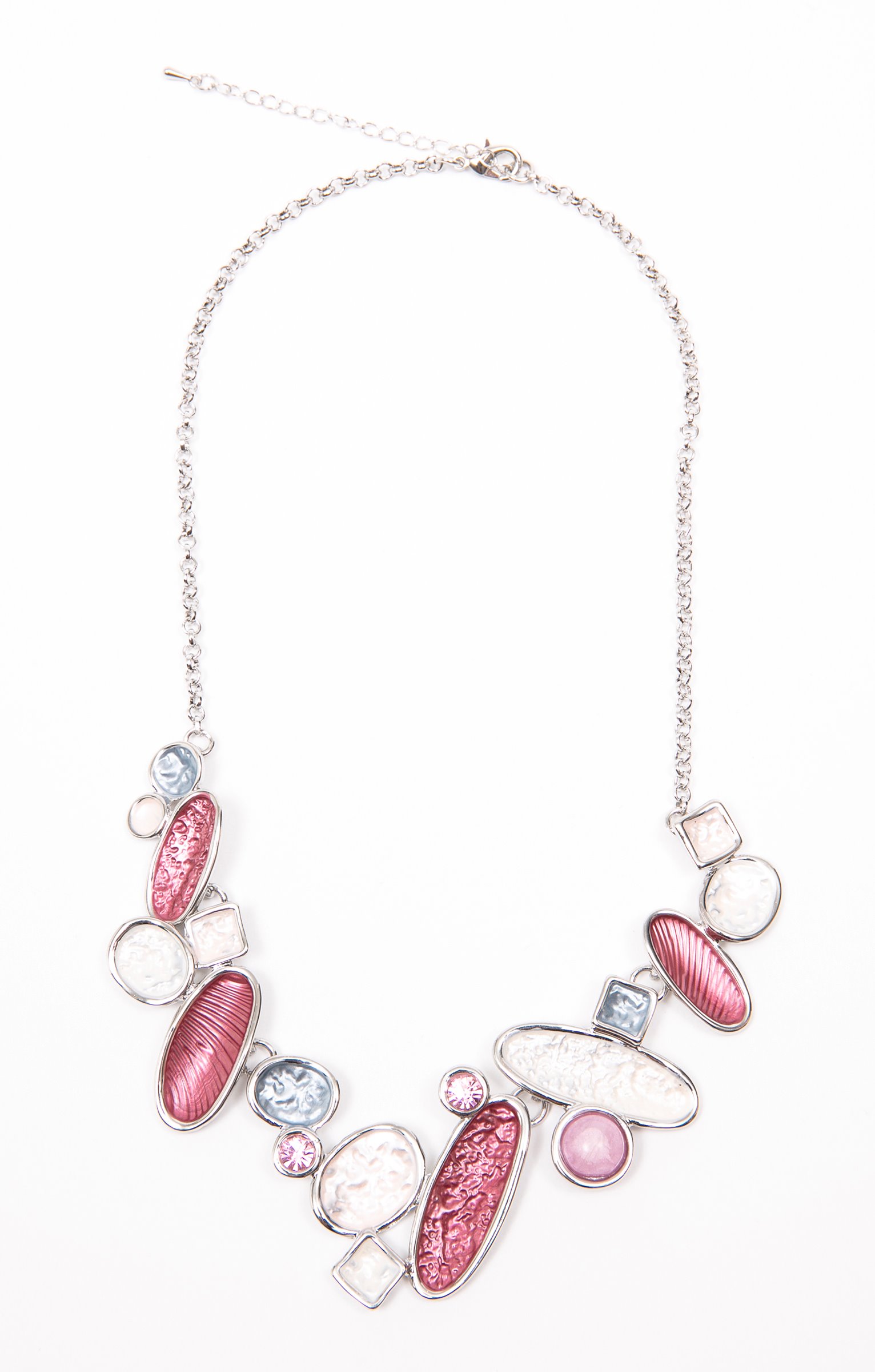 Collier à chaîne fine avec fermoir mousqueton et chaînette d’ajustement. Partie centrale composée d’un assemblage de formes géométriques irrégulières serties, de tailles variées, à effet martelé, nacré ou strié. Finition multicolore avec éléments brillants de type strass.