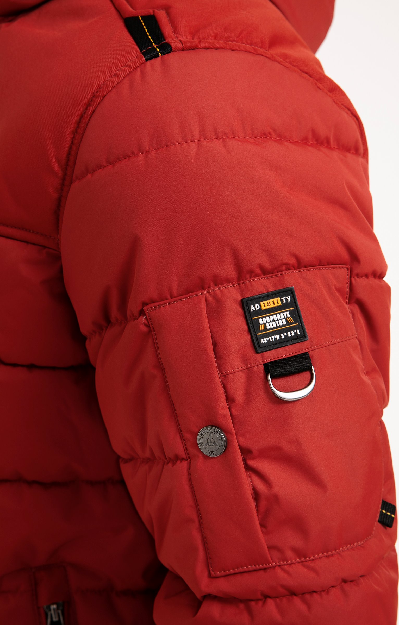 Blouson matelassé uni à capuche amovible. Coupe droite. Manches longues avec poignets en bords-côtes. Fermeture zippée devant. 2 poches zippées verticales à la taille. 1 poche plaquée à rabat pressionné sur la manche gauche, avec passant et détail métallique. Doublure intérieure contrastante avec 1 poche pressionnée. Base droite en bords-côtes.