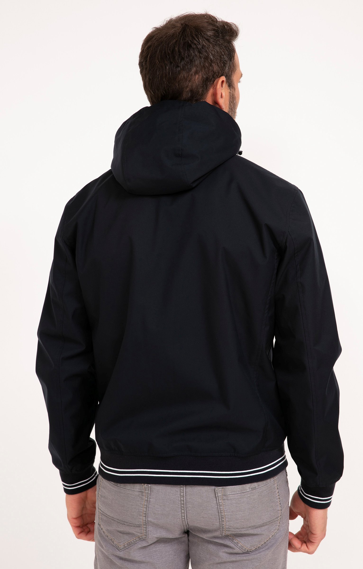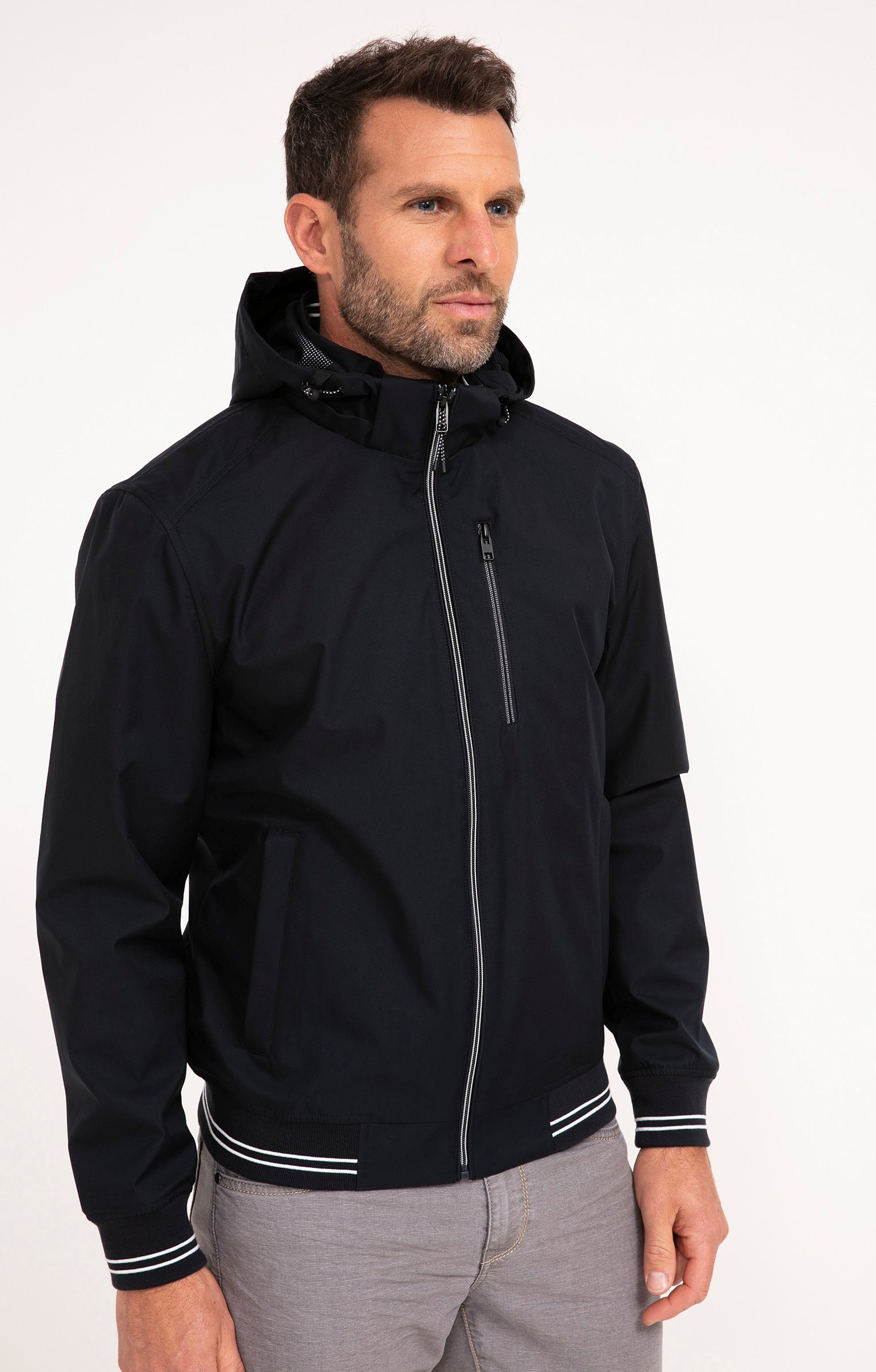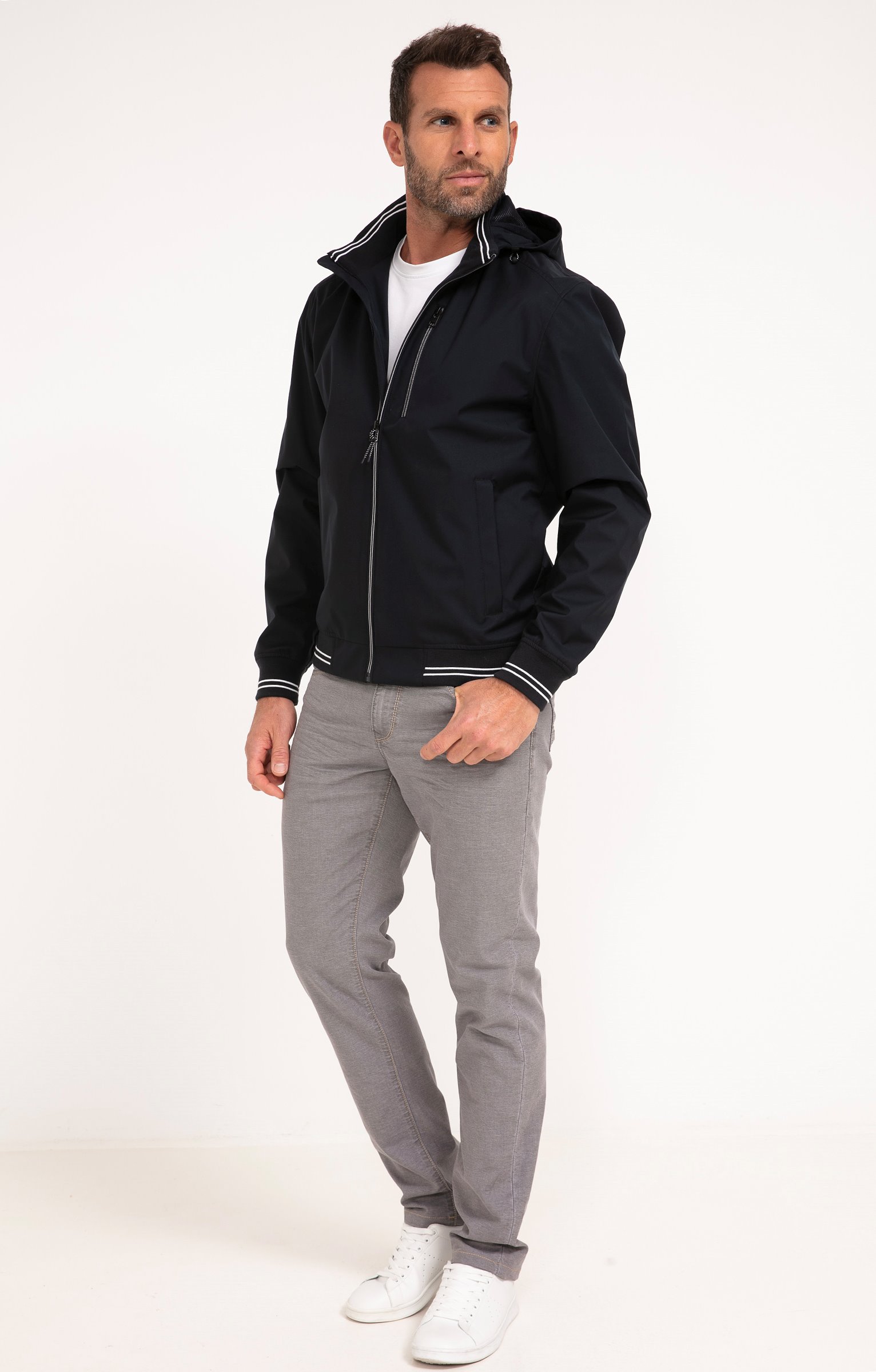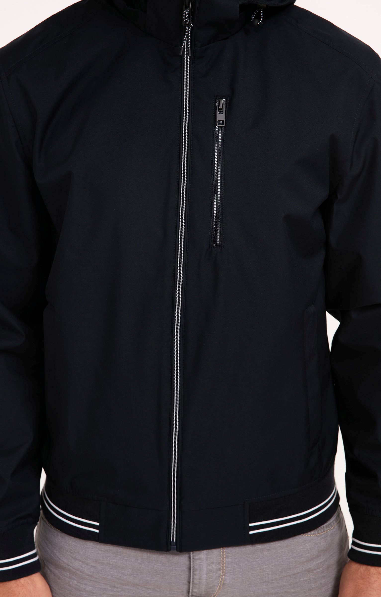 Blouson uni à manches longues et col capuche amovible. Coupe droite. Manches longues. Col capuche. Fermeture à zip avec tirette à cordon. Une poche zippée à la poitrine, une poche passepoilée à la taille, une poche intérieure. Poches verticales. Coloris uni. Tissu aspect toile souple. Doublure rayée. Capuche amovible avec cordon de serrage. Zips rayés. Larges bords-côtes à rayures en finition des poignets et de la base droite. Matière déperlante avec une imperméabilisation sans fluor.
