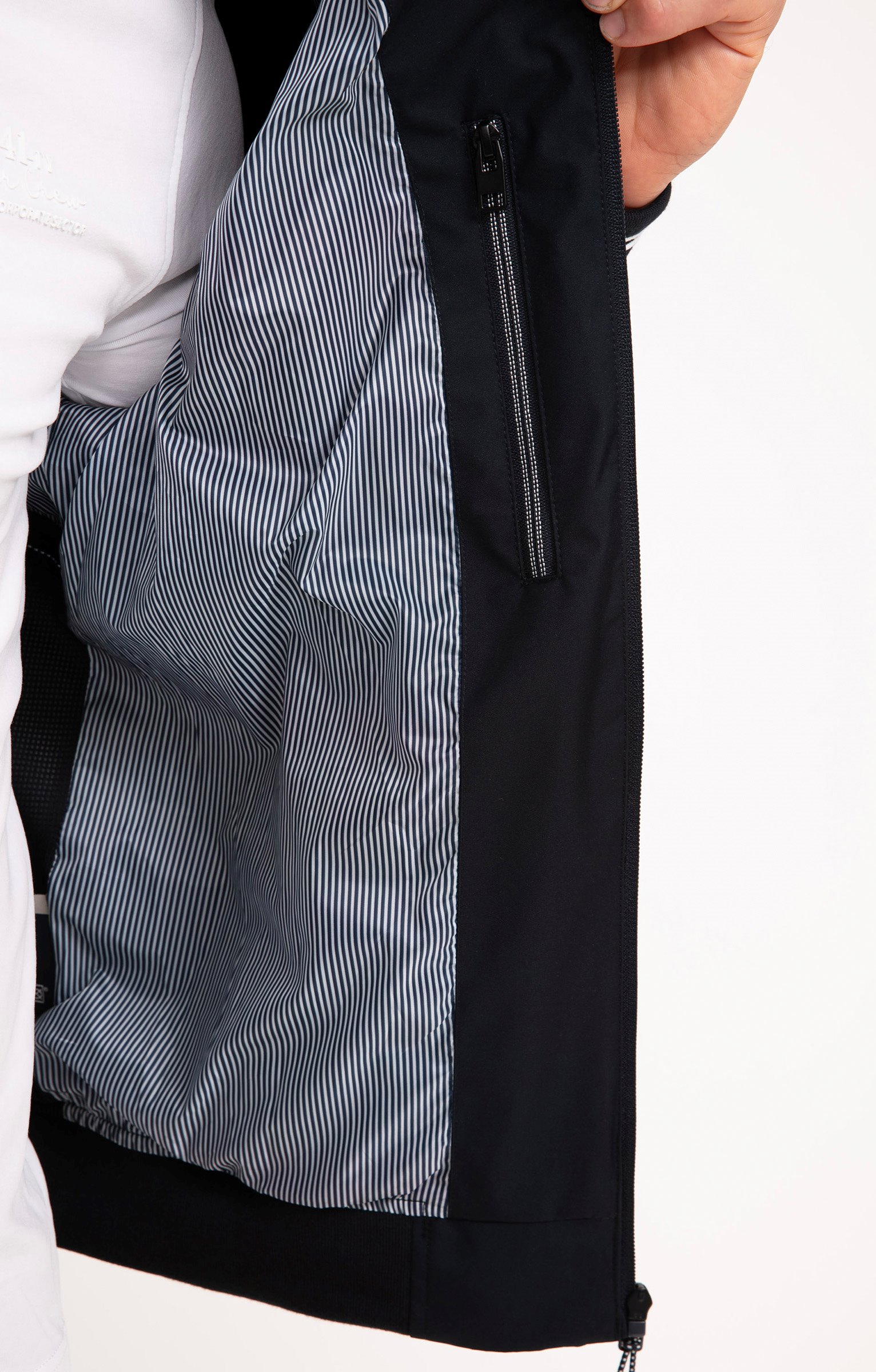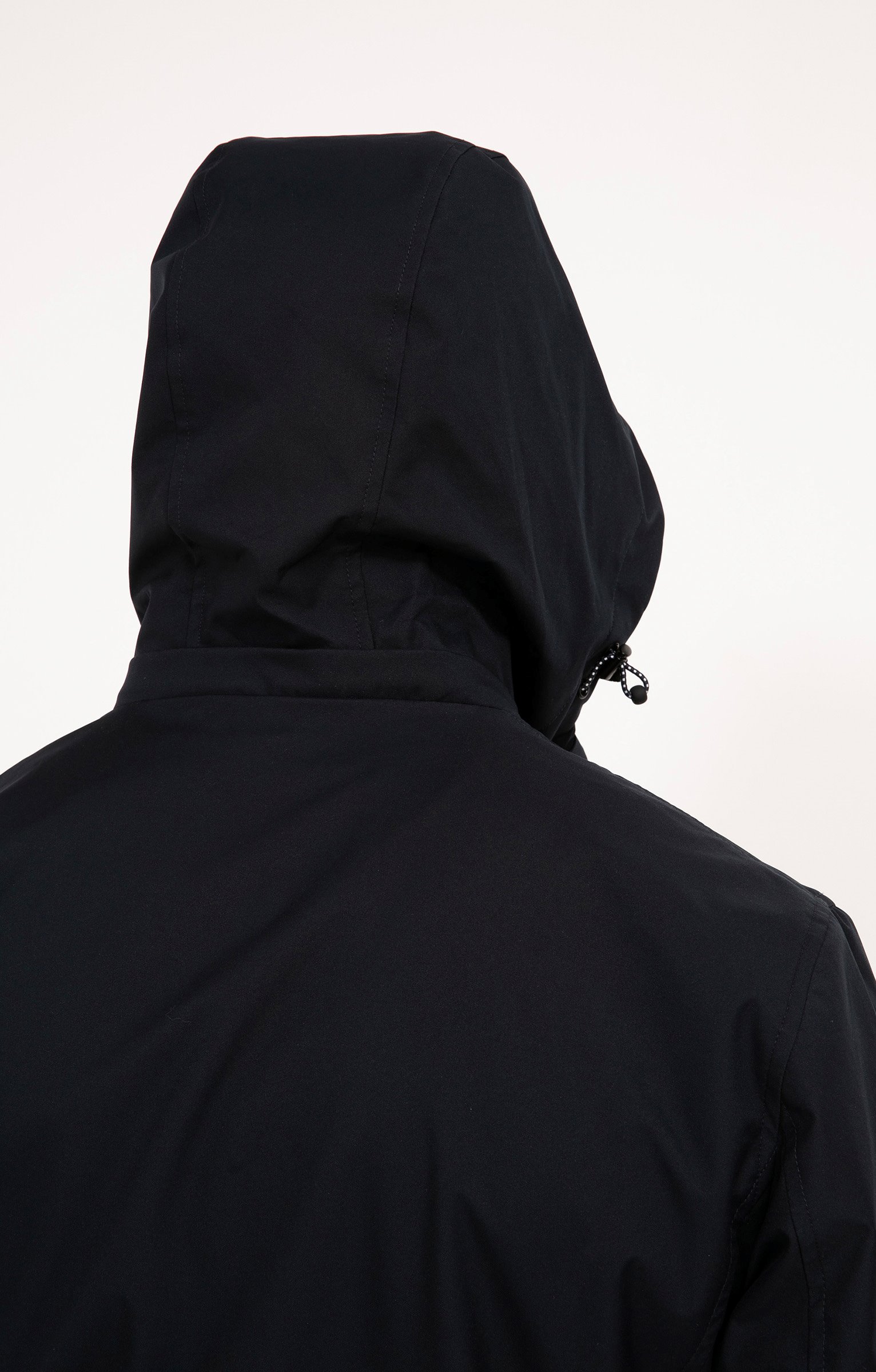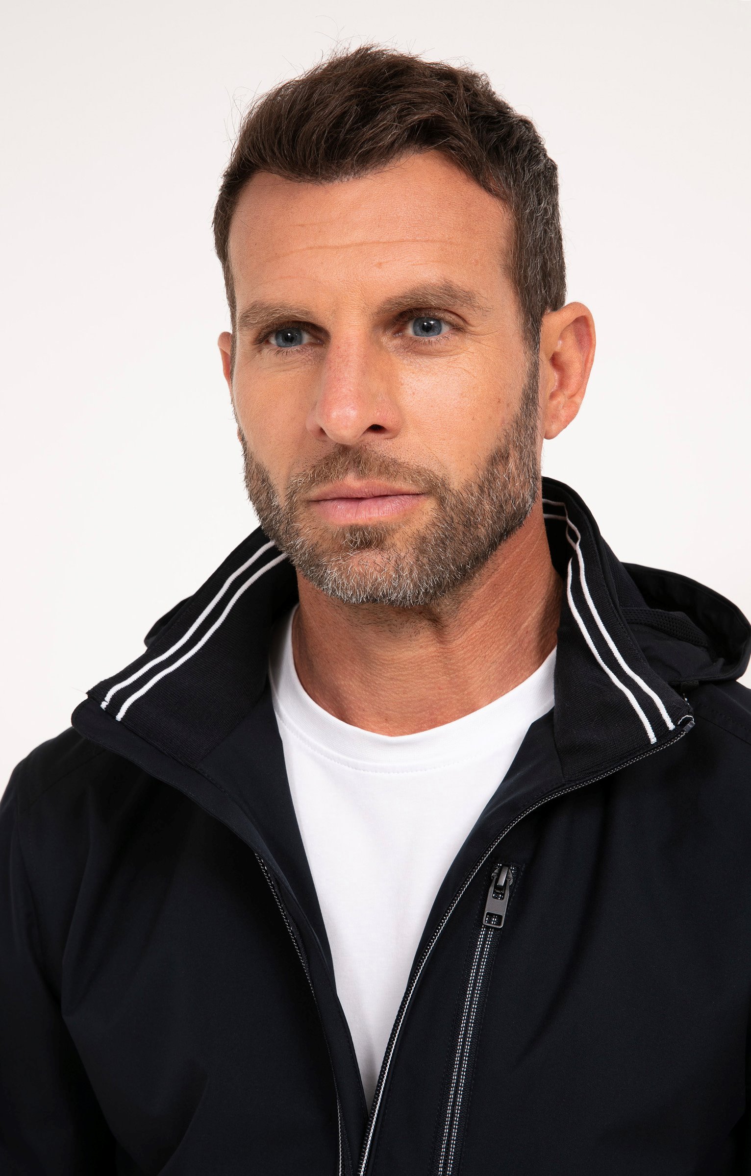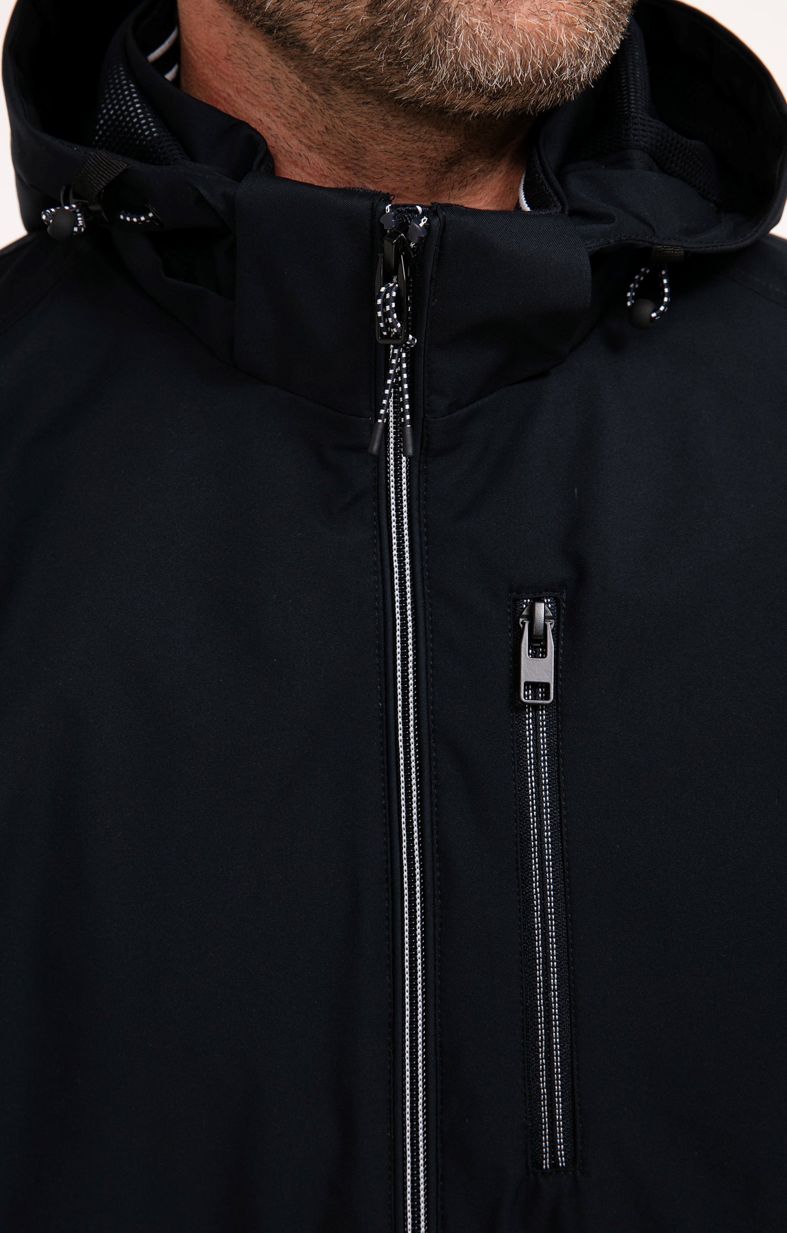 Blouson uni à manches longues et col capuche amovible. Coupe droite. Manches longues. Col capuche. Fermeture à zip avec tirette à cordon. Une poche zippée à la poitrine, une poche passepoilée à la taille, une poche intérieure. Poches verticales. Coloris uni. Tissu aspect toile souple. Doublure rayée. Capuche amovible avec cordon de serrage. Zips rayés. Larges bords-côtes à rayures en finition des poignets et de la base droite. Matière déperlante avec une imperméabilisation sans fluor.