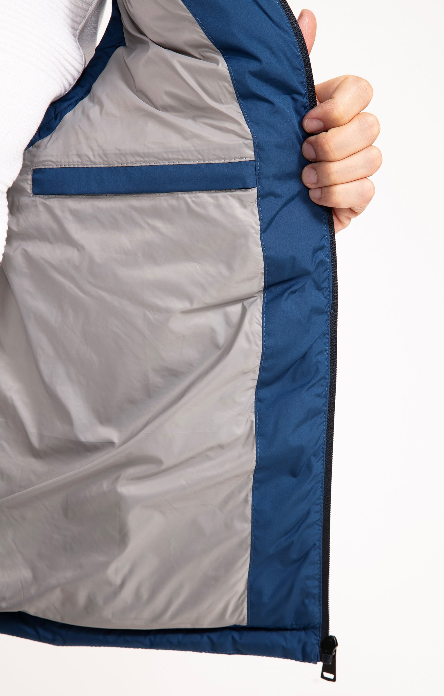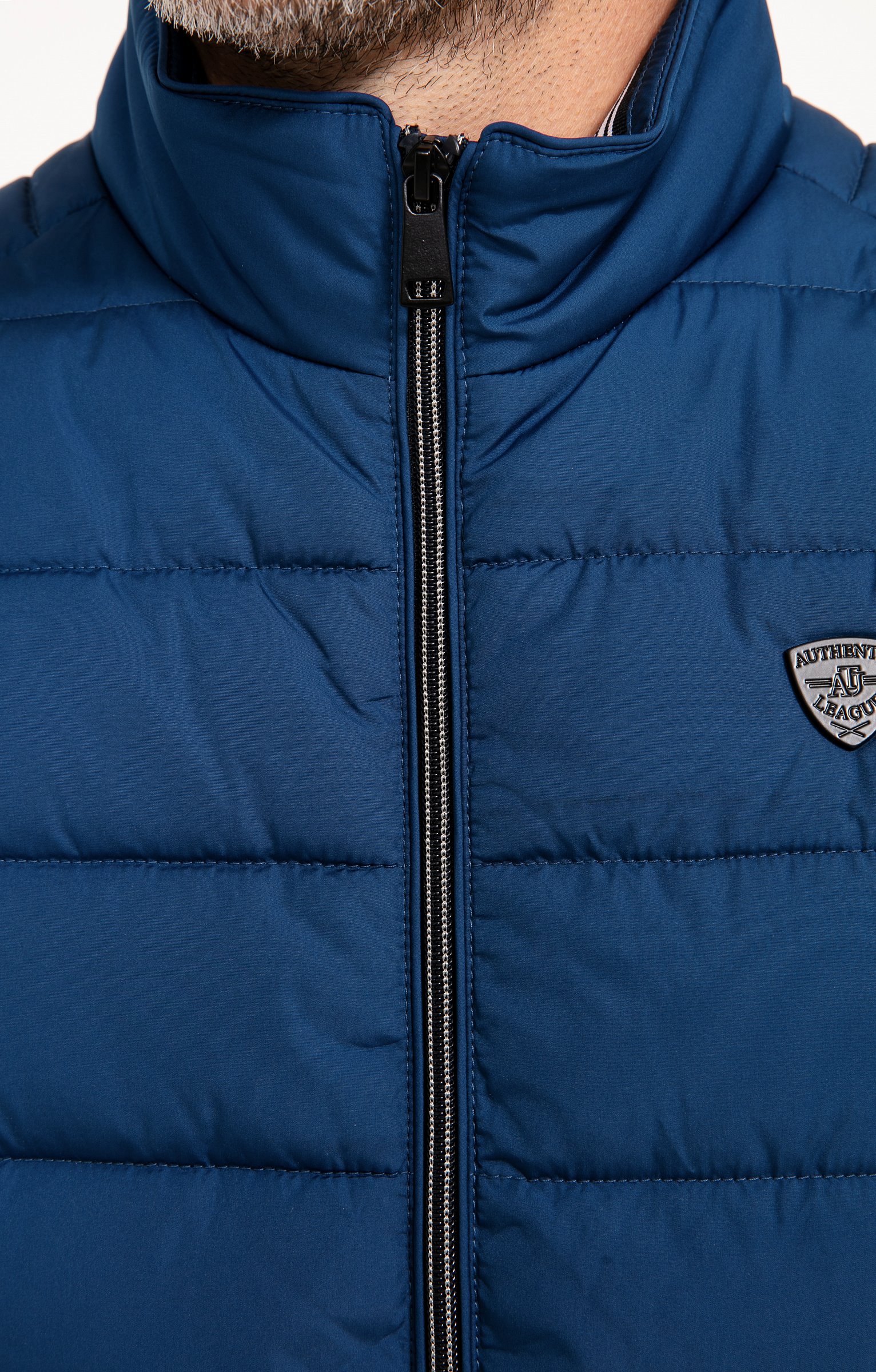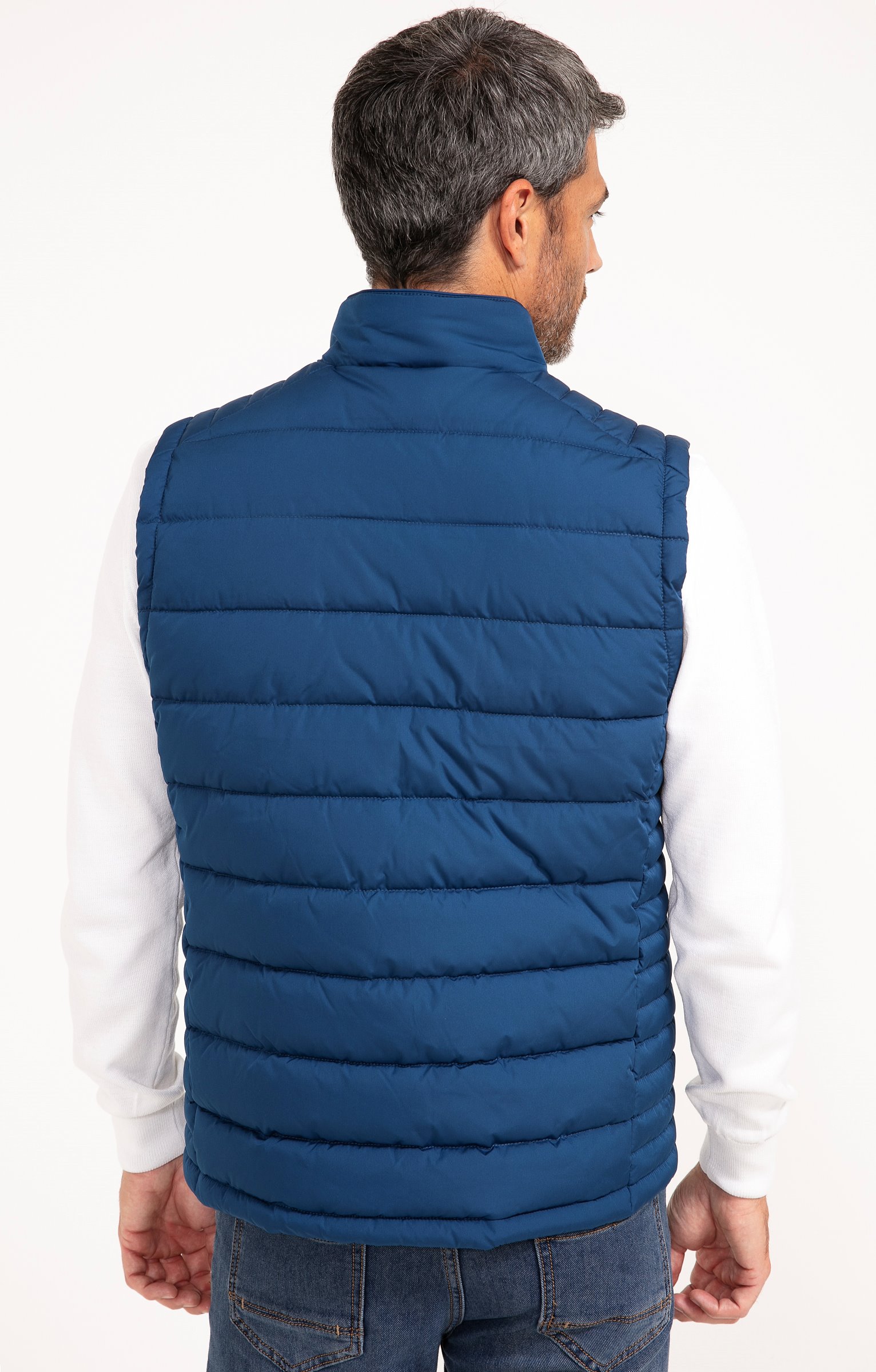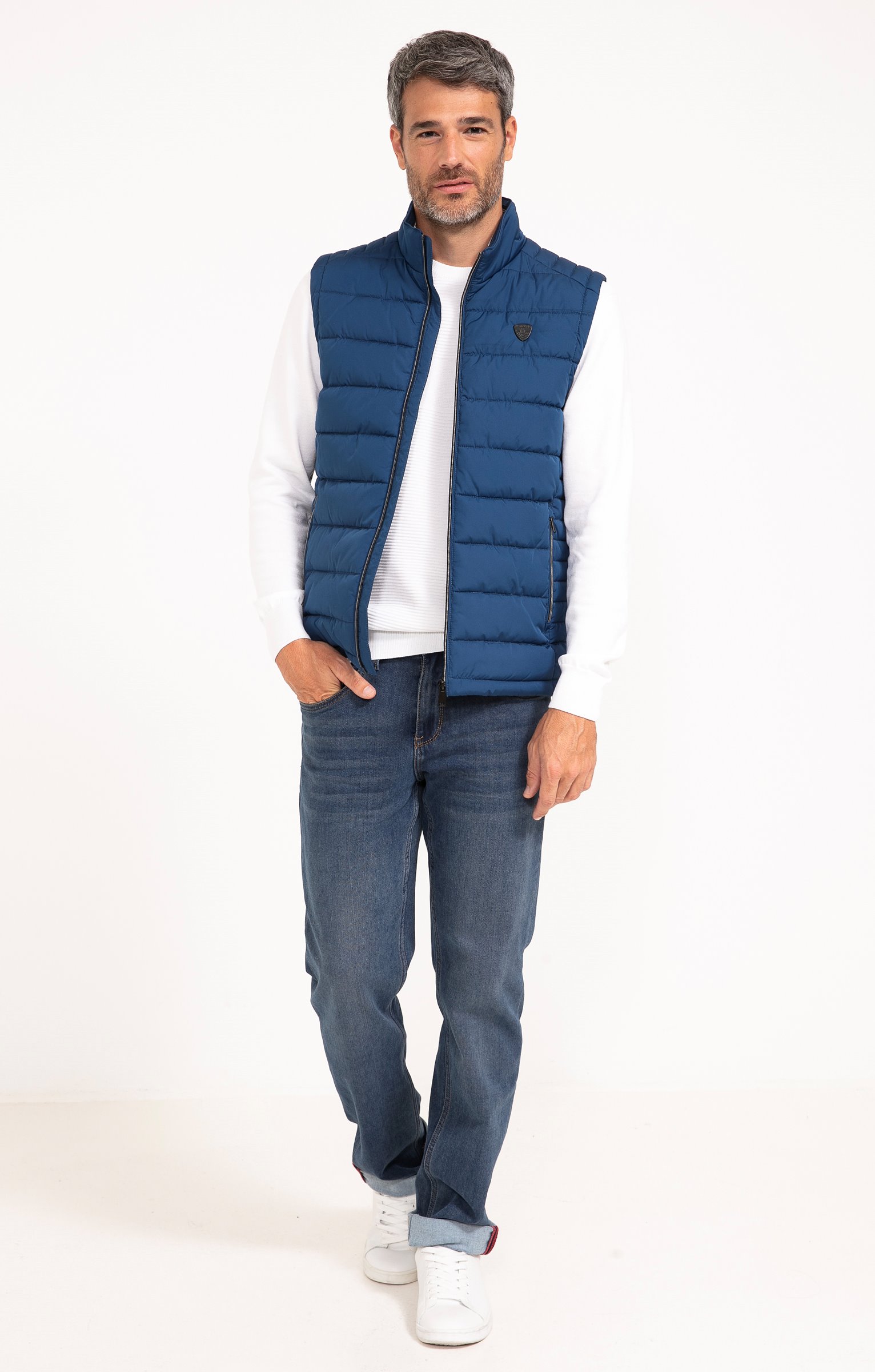 Blouson zippé matelassé uni sans manches et col montant. Coupe droite. Blouson sans manches. Col montant. Fermeture zippée. 2 poches verticales zippées à la taille. Une poche intérieure. Coloris uni. Tissu matelassé à motifs rayés. Doublure contrastante. Petit écusson gravé aspect métallique à la poitrine. Zips rayés pour l'ensemble du modèle. Base droite. Imperméabilisation sans fluor.
