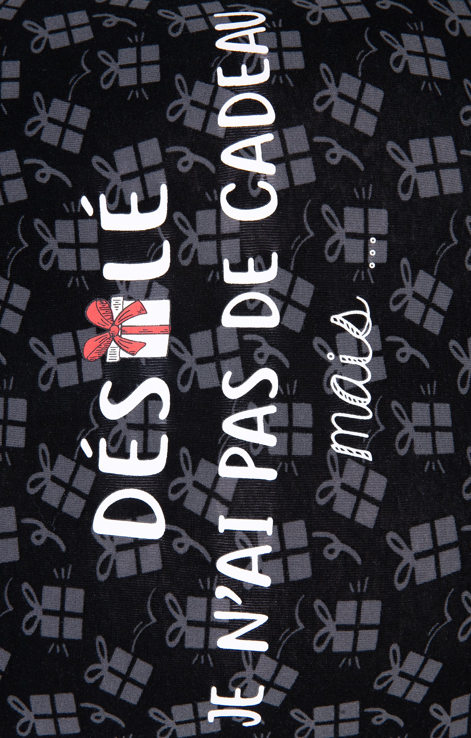 Boxer humoristique collection spéciale cadeaux de Noël. Coupe près du corps. Message contrastant « Désolé j'ai pas de cadeau mais… » au dos et « J'ai un joli paquet » sur le devant dans deux coloris contrastants. Motif nœud contrastant sur le devant. Motif cadeau pour remplacer le « o » de « désolé ». Fond imprimé à motif cadeaux. Matière extensible. Taille plate élastiquée ton sur ton avec inscriptions sur le thème de Noël. Coutures ton sur ton.