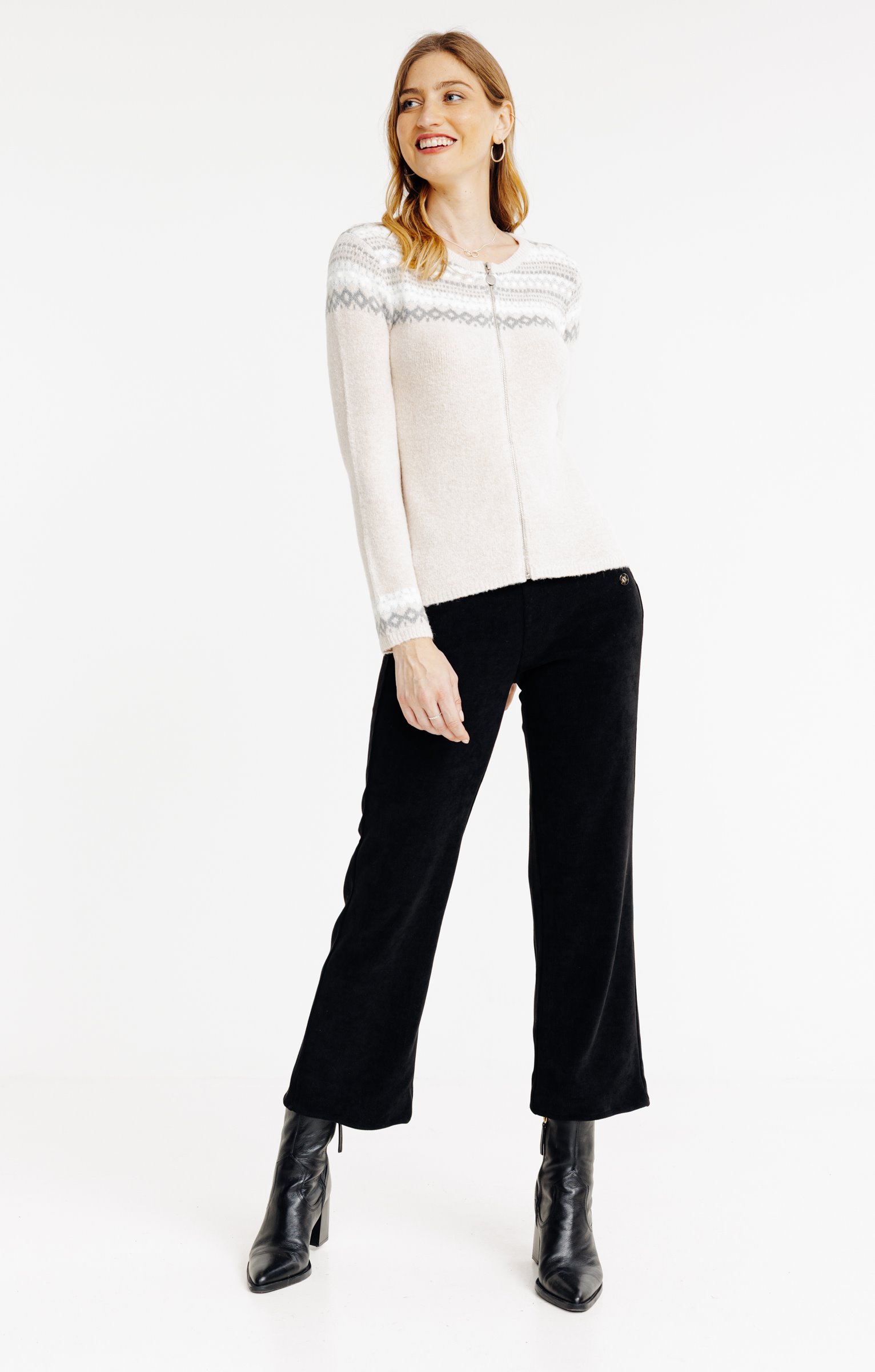 Cardigan zippé à manches longues et col rond. Coupe droite. Longueur standard. Motif jacquard avec détails brillants sur le haut du buste, le haut du dos et le bas des manches. Fermeture zippée centrée sur le devant avec tire-zip rond métallique. Finitions en bords-côtes à la base, aux poignets et au col.