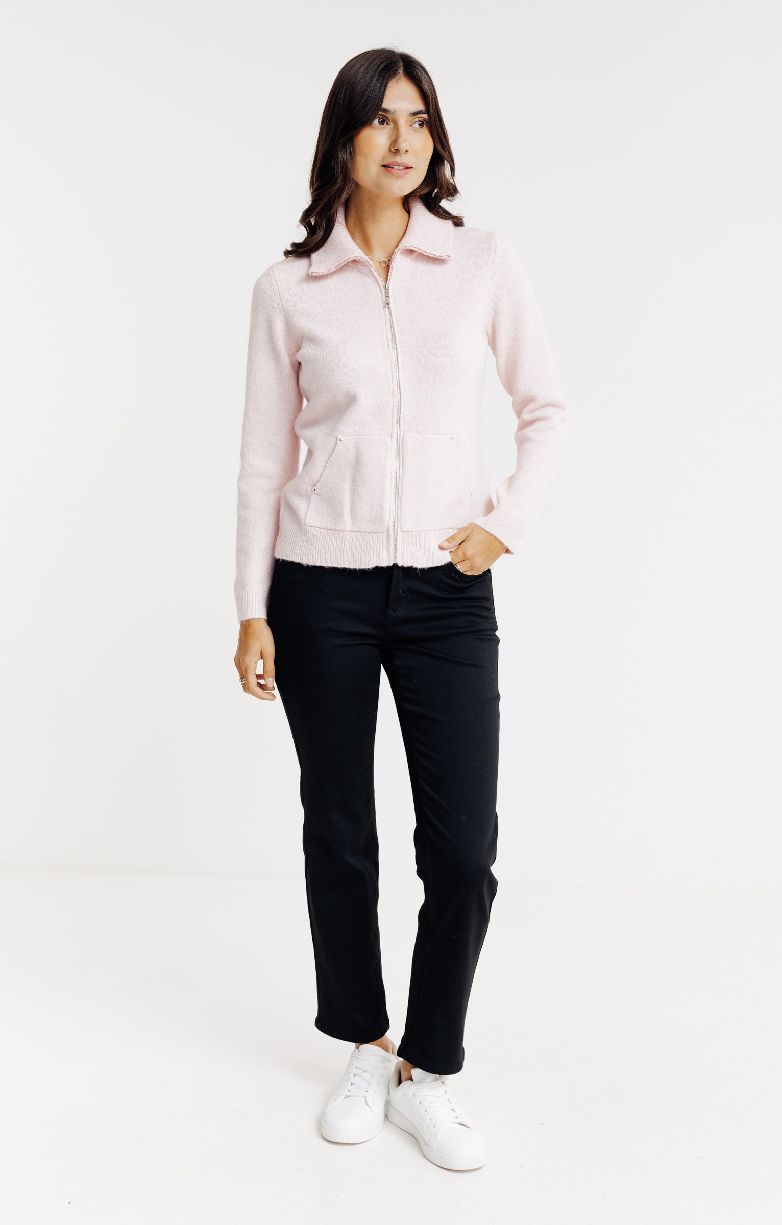 Cardigan uni à manches longues et col camioneur. Coupe droite. Fermeture zippée sur le devant avec tire-zip métallique. Deux poches kangourou à l'avant avec petits rivets décoratifs. Finitions en bords-côtes au col, aux poignets et à la base. Maille douce à texture légèrement duveteuse.