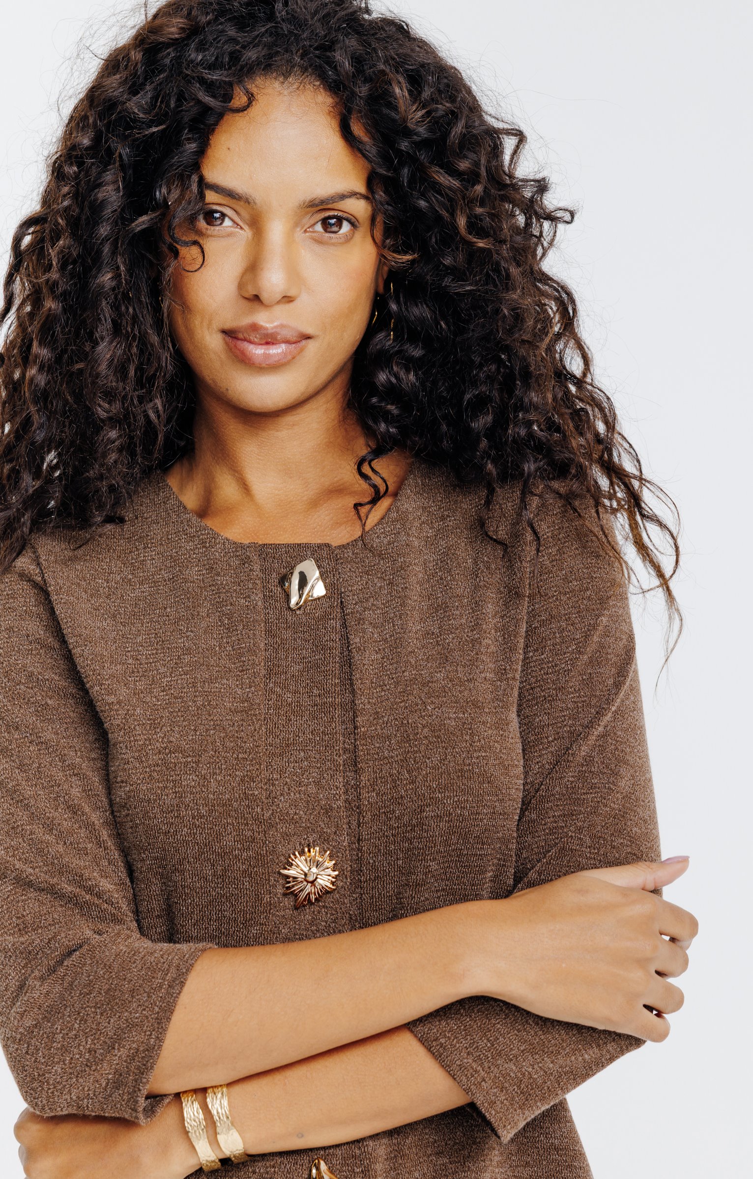 Notre mannequin Juliana mesure 1m79 et porte un cardigan taille 1.