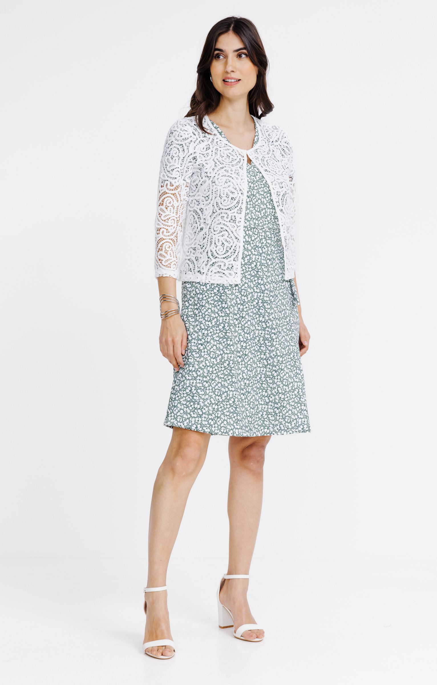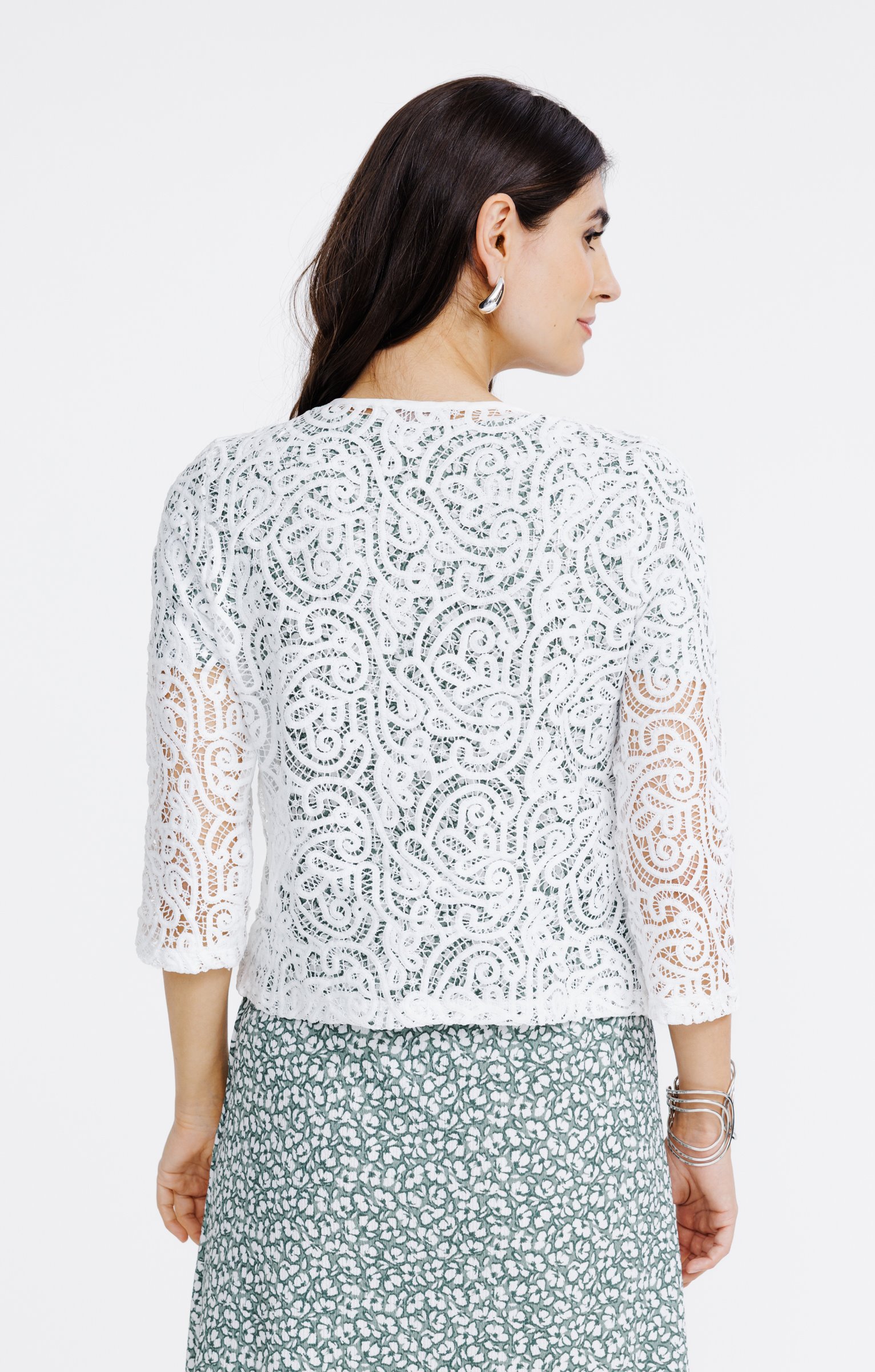 Cardigan court en dentelle. Coupe droite avec manches 3/4. Col rond. Fermeture par une attache au niveau du décolleté. Détails en dentelle avec motifs en relief sur l'ensemble du modèle. Coloris uni.