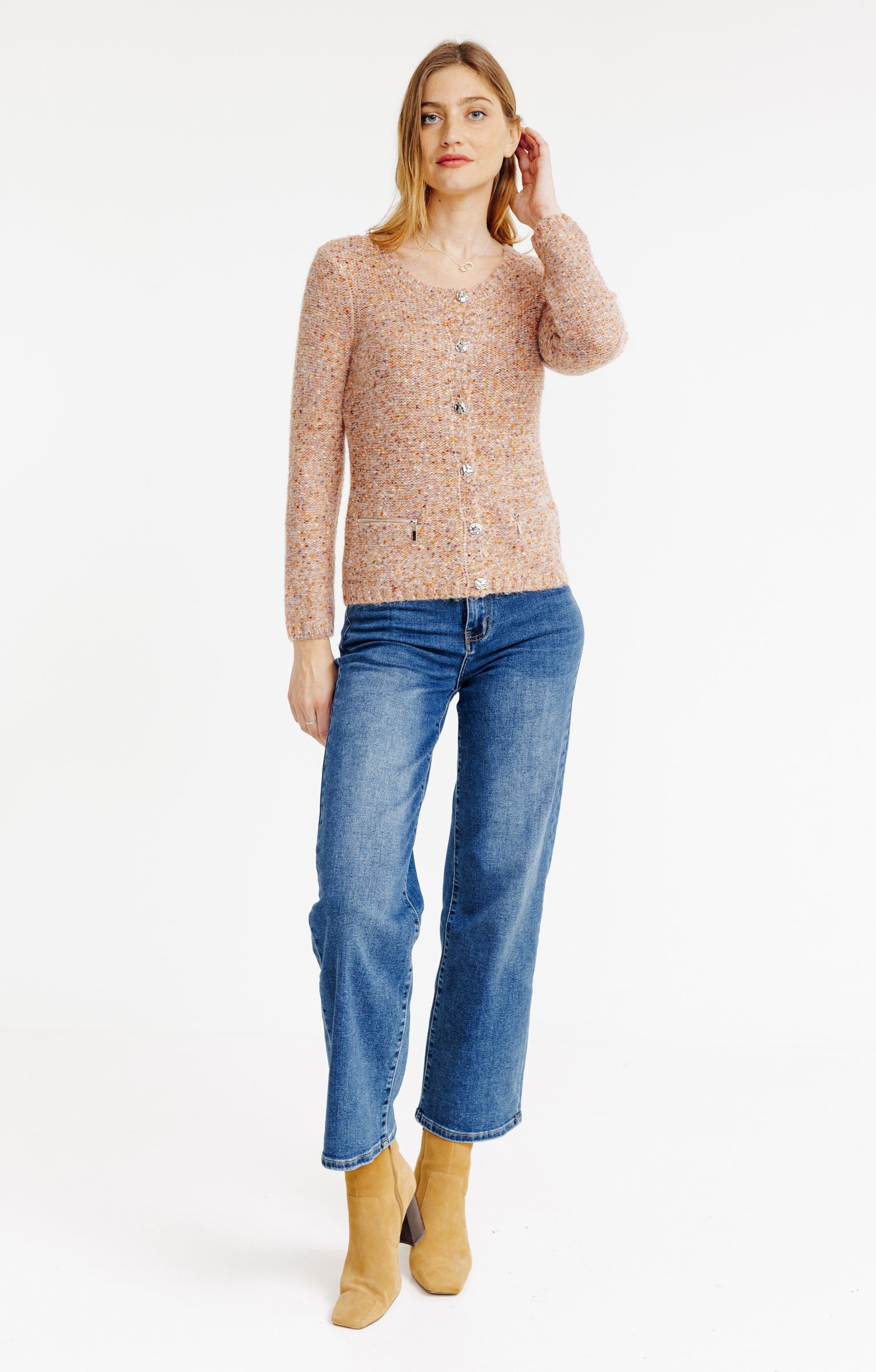 Notre mannequin Anna mesure 1m80 et porte un cardigan taille 1.