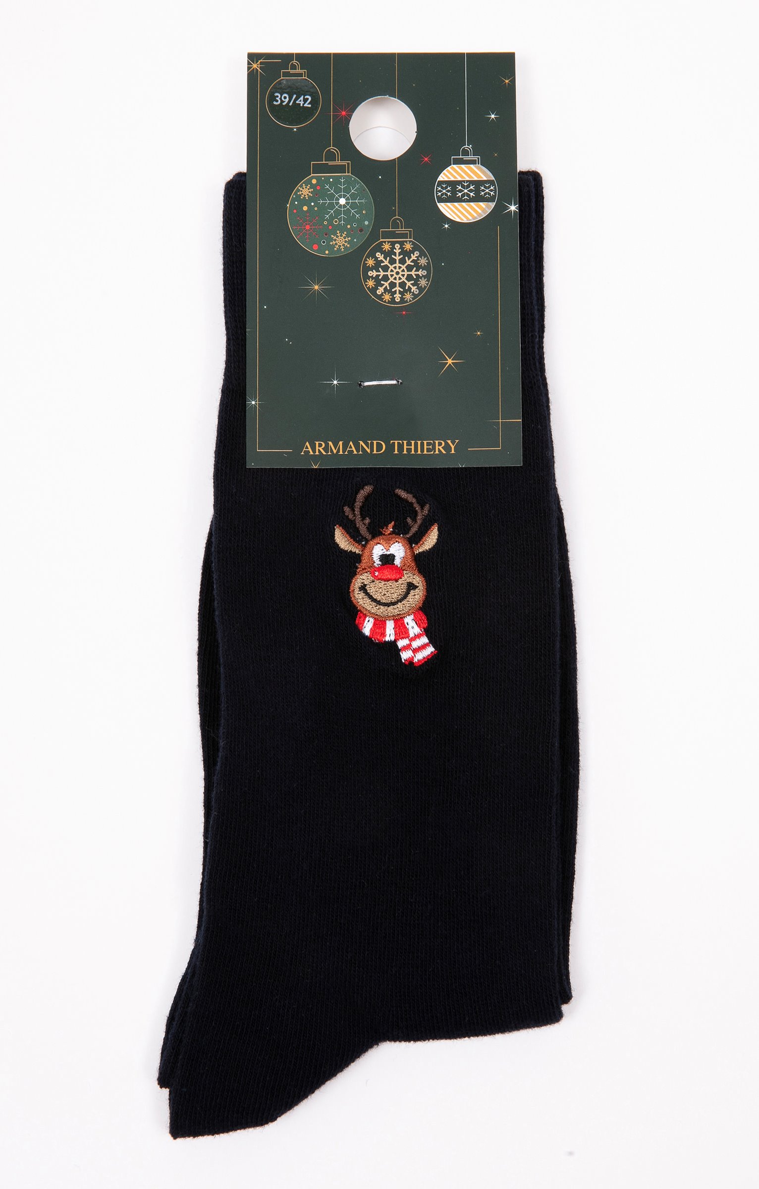 Paire de chaussettes brodées renne au nez rouge, collection spéciale Noël. Renne au nez rouge avec son écharpe brodés en tons multicolores sur le côté extérieur du haut de tige. « Xmas with AT » et pointure en jacquard contrasté sous le pied. Maille jersey. Optimisation du maintien par les côtes tricotées en finition de tige.