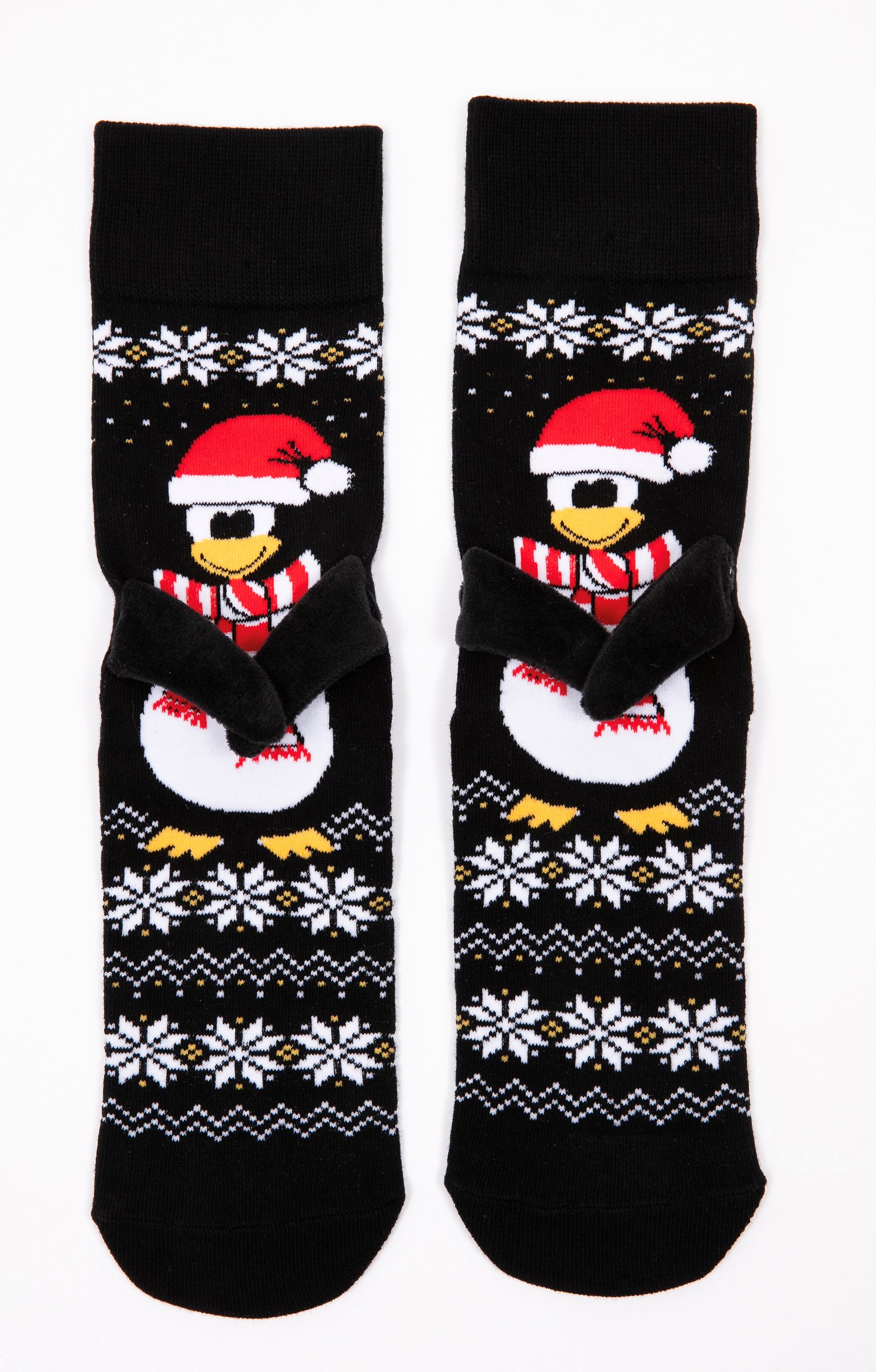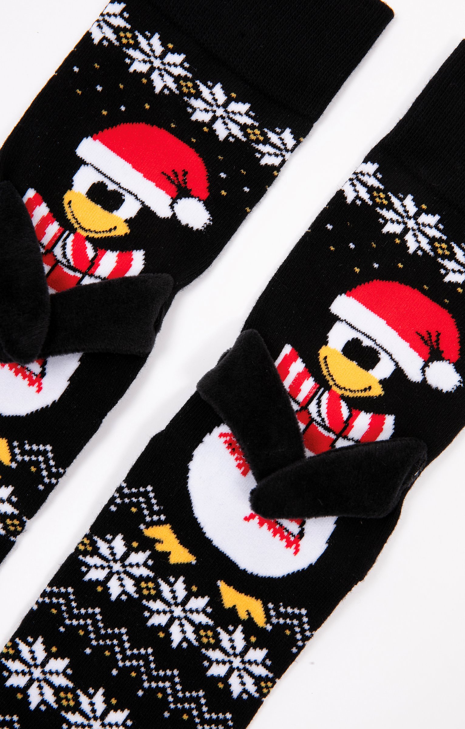 Chaussettes pingouins en jacquard, spécial idée cadeau de Noël. Paire de chaussettes. Motifs jacquard multicolores flocons de neige, lignes brisées, petits points, pingouins à bonnet de père Noël et écharpe sublimés de nageoires en velours. Gamme et pointure en jacquard contrasté sous le pied. Maille jersey. Haut de tige en côtes élastiquées pour un bon maintien.