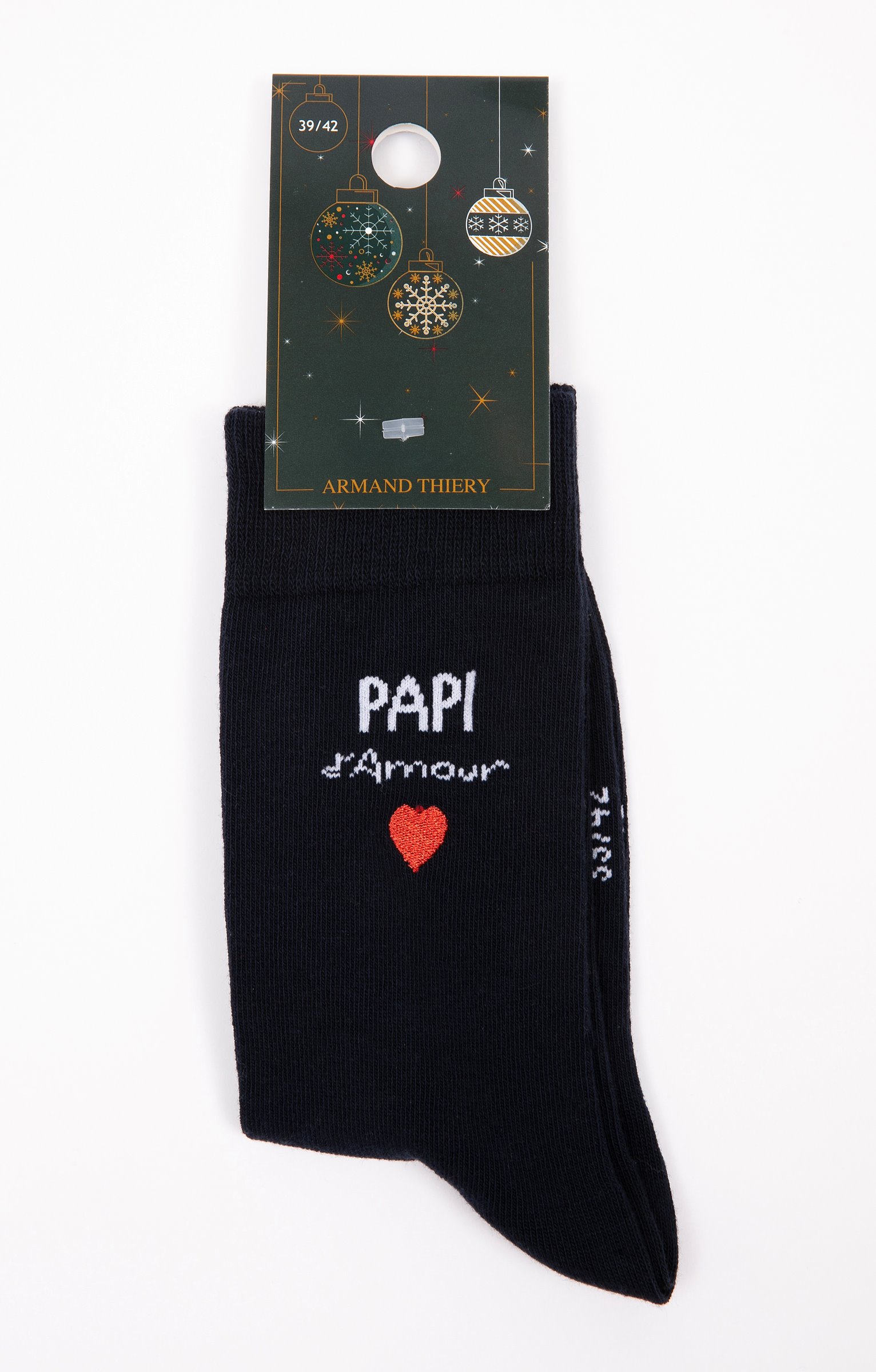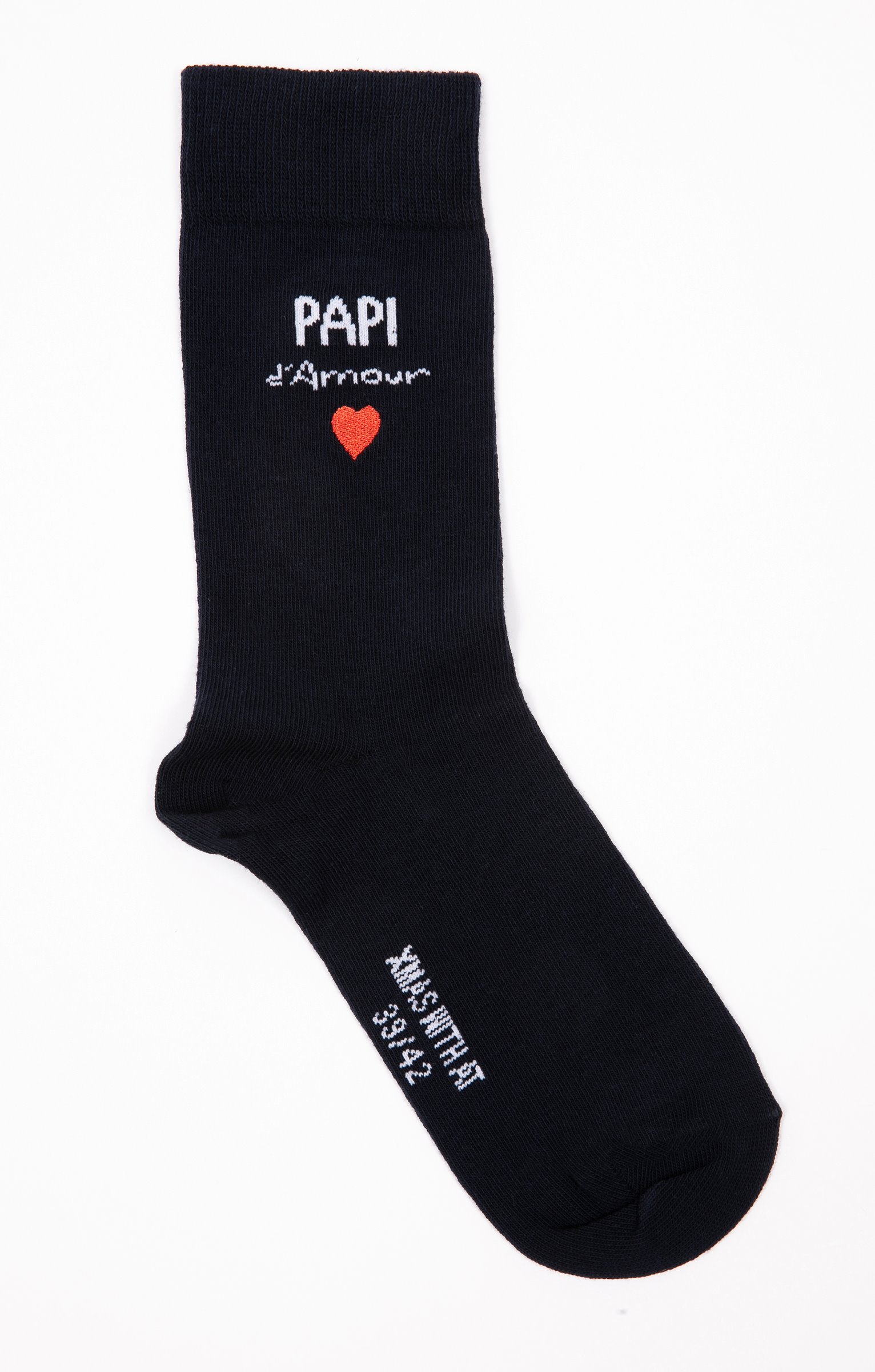 Paire de chaussettes multicolores spécial Noël avec message et broderie. Message « Papi d'amour » en jacquard souligné d'un cœur brodé placé en partie haute face extérieure de la tige. Nom de collection et pointure en jacquard sous le pied. Tricot en jersey. Haut de tige en côtes pour optimiser la tenue.