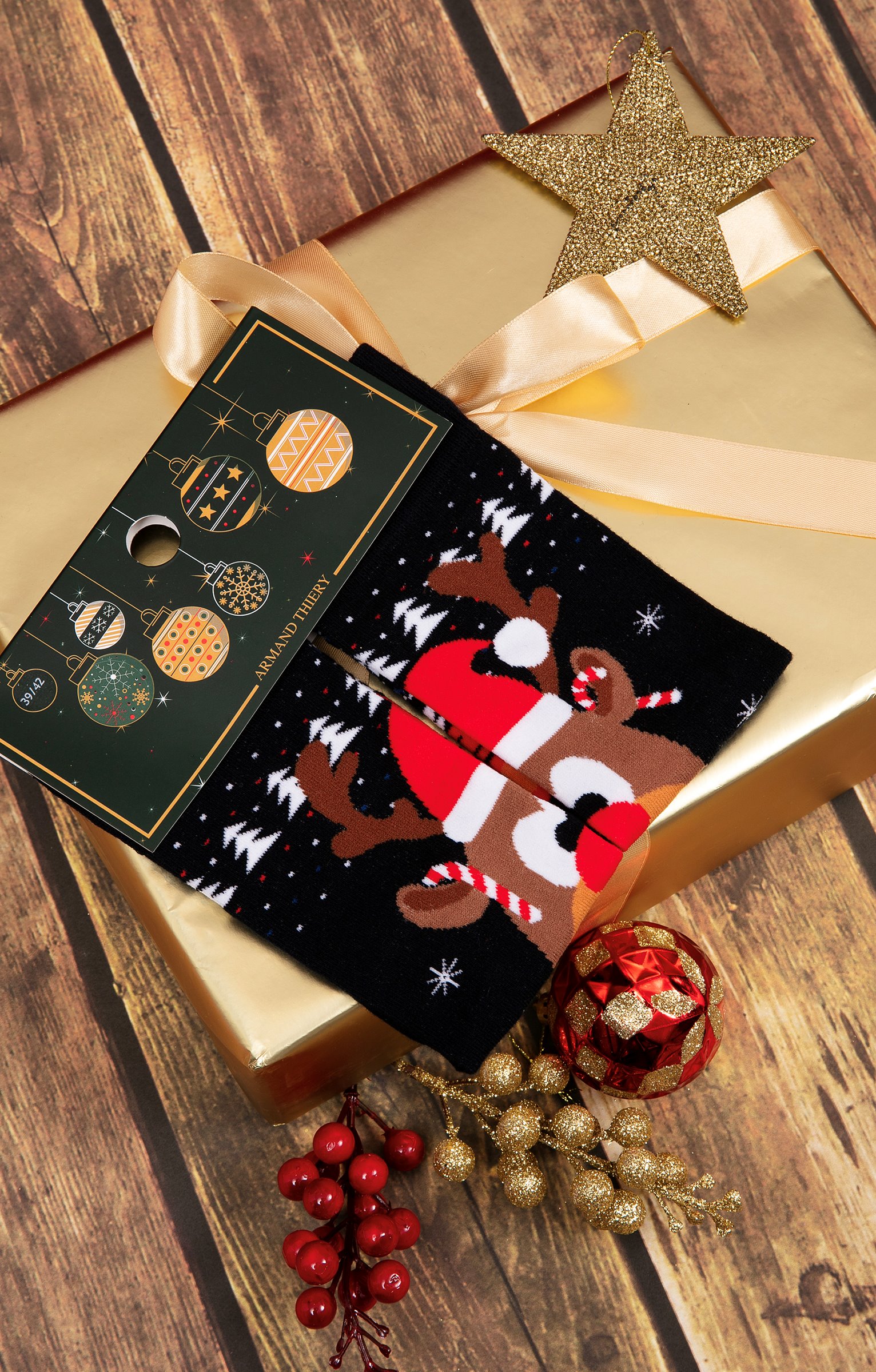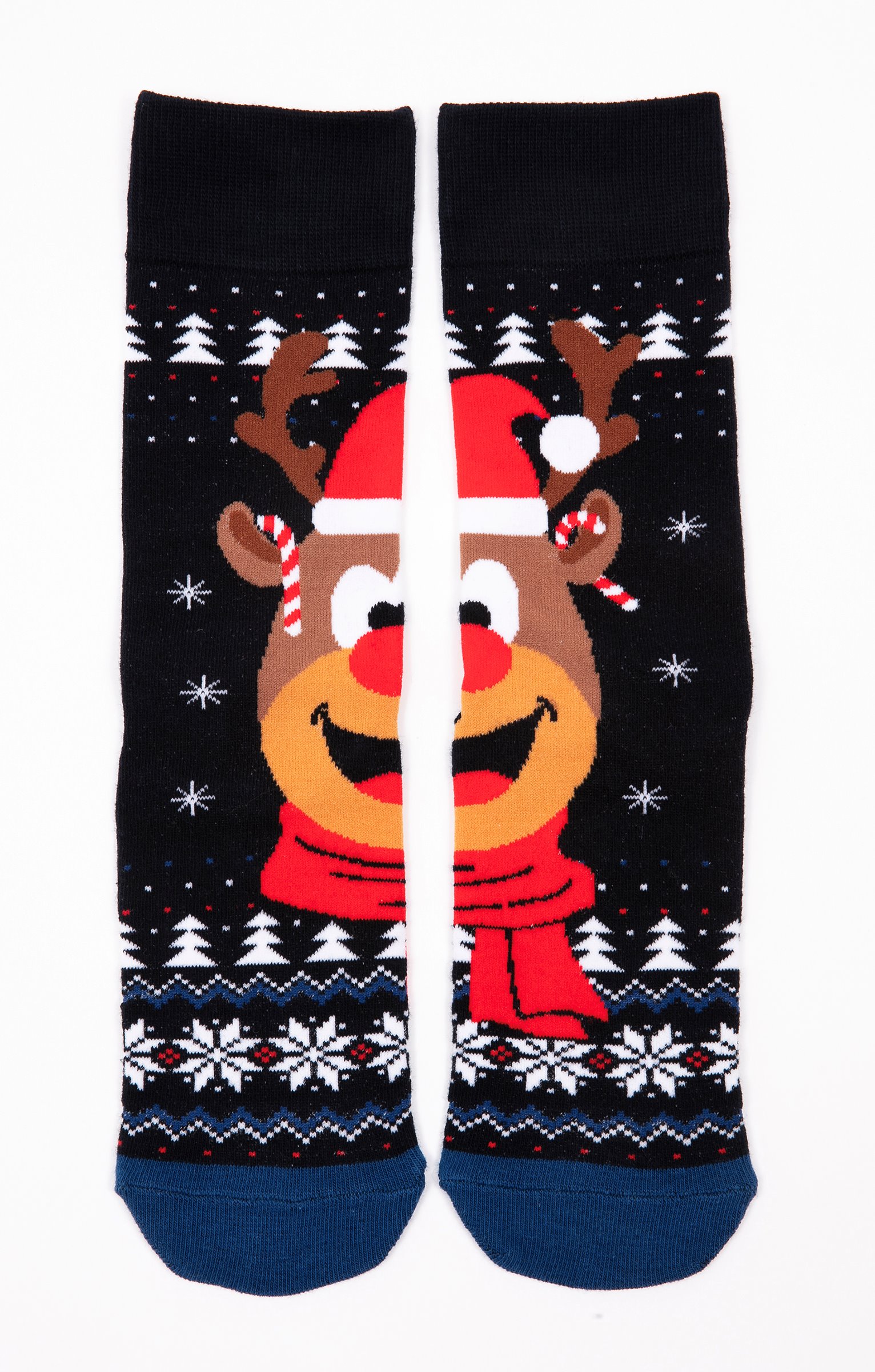 Chaussettes spécial Noël en jacquard multicolore avec le renne au nez rouge. Sapins, points, flocons de neige, rayures en lignes brisées, renne au nez rouge accessoirisé d'un bonnet de Père Noël, de sucres d'orge et d'une écharpe en jacquard intégral multicolore. Tricot en maille jersey. Haut de tige en côtes pour un bon maintien.