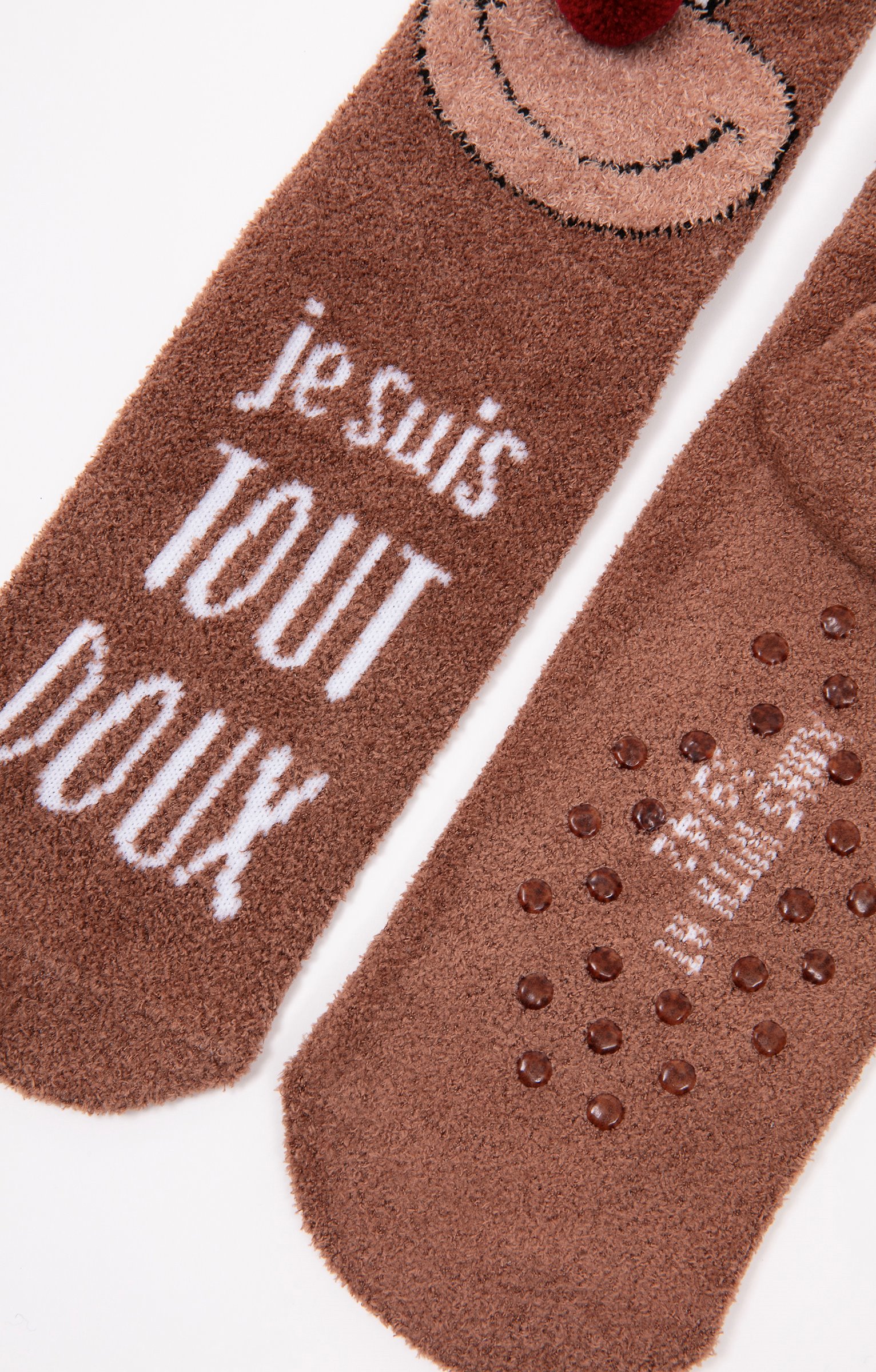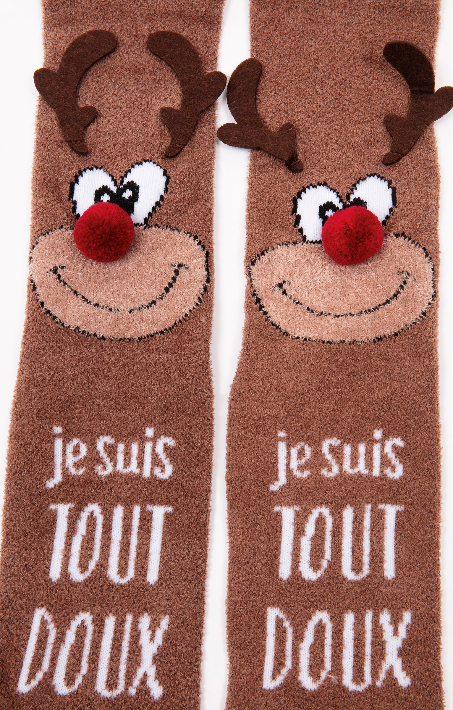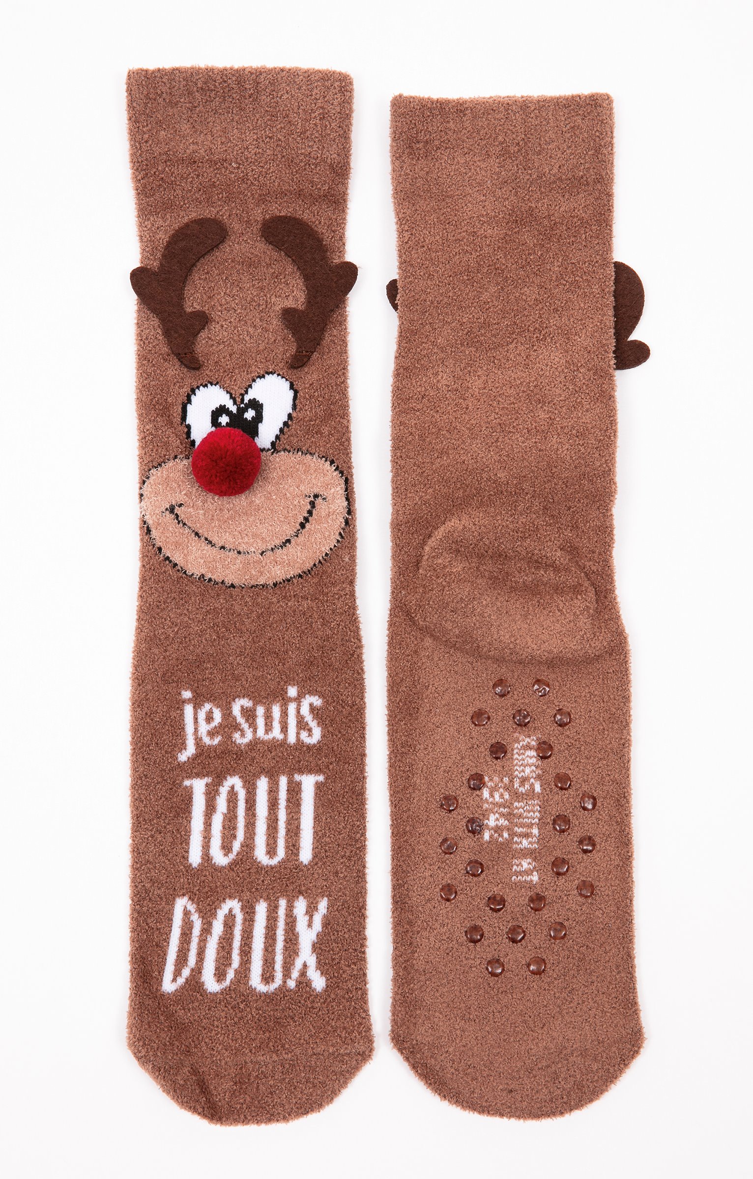 Chaussettes d'intérieur antidérapantes à motif renne. Collection d'idées cadeaux de Noël. Motif tête de renne et message «Je suis tout doux» en jacquard multicolore contrasté sur le dessus du pied. Tricot en maille jersey effet bouclette. Côtes élastiquées en haut de tige pour un bon maintien. Picots antidérapants sous le pied. Nez du renne en pompon en relief et bois en feutrine unie.