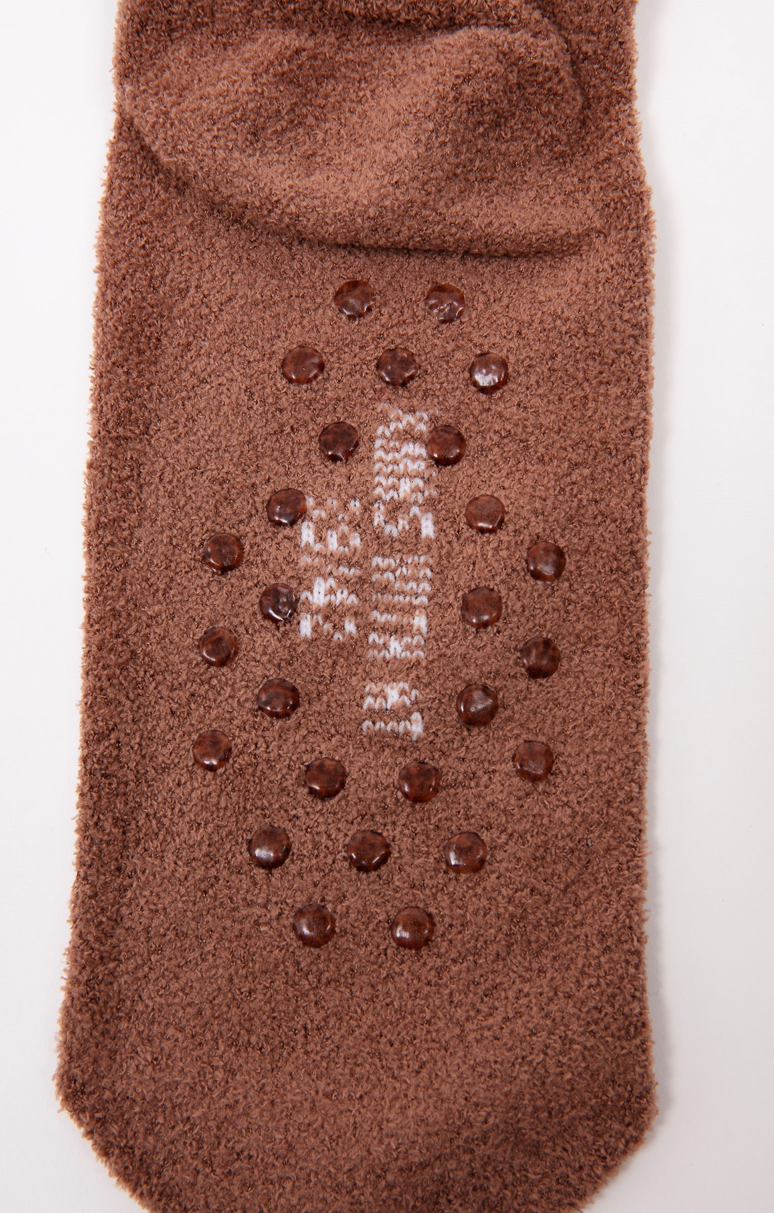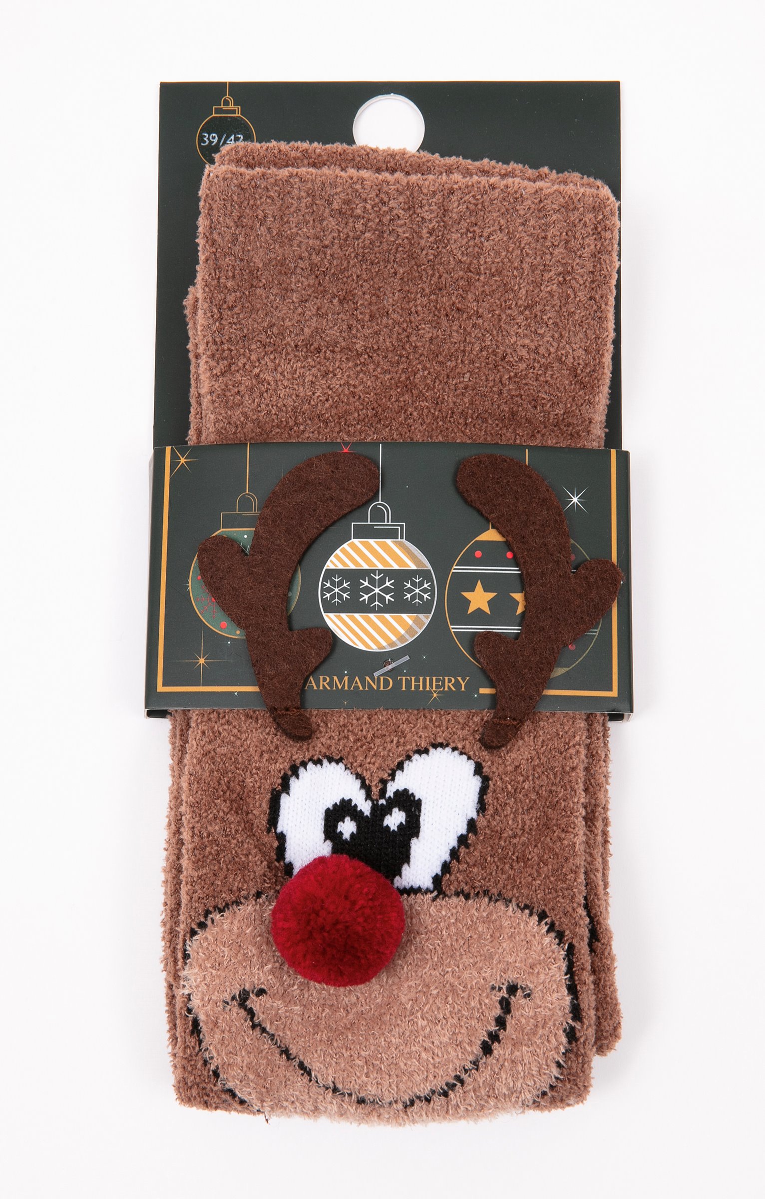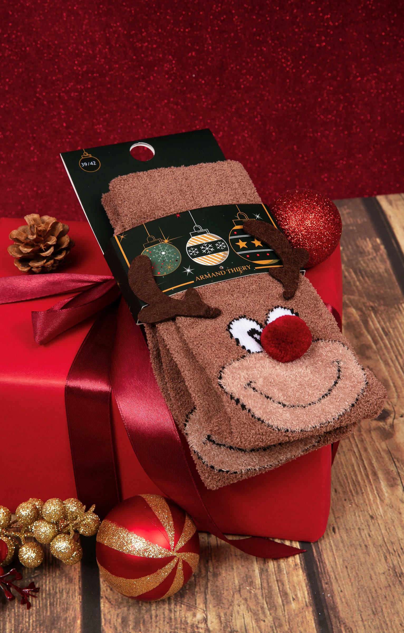 Chaussettes d'intérieur antidérapantes à motif renne. Collection d'idées cadeaux de Noël. Motif tête de renne et message «Je suis tout doux» en jacquard multicolore contrasté sur le dessus du pied. Tricot en maille jersey effet bouclette. Côtes élastiquées en haut de tige pour un bon maintien. Picots antidérapants sous le pied. Nez du renne en pompon en relief et bois en feutrine unie.
