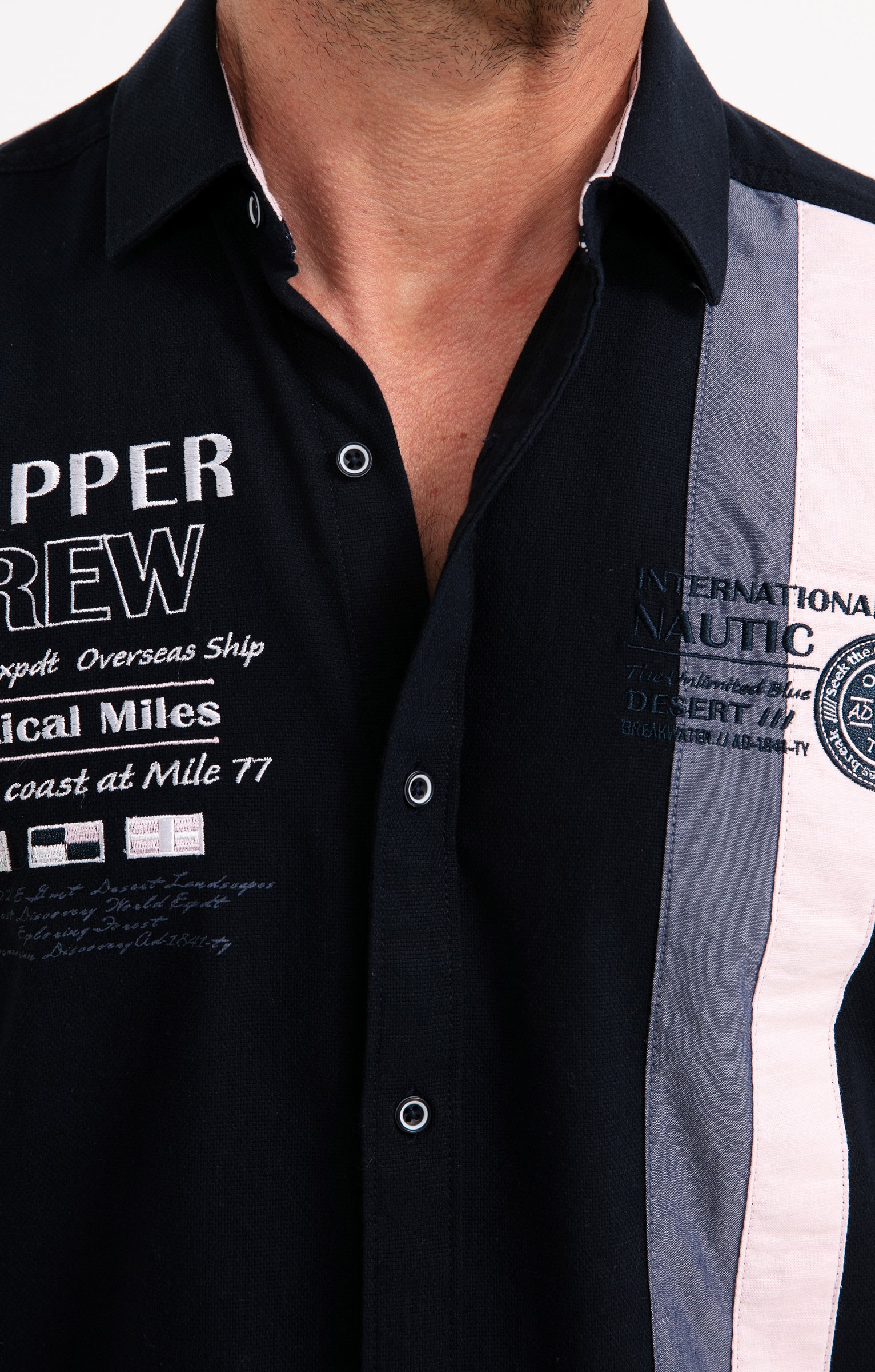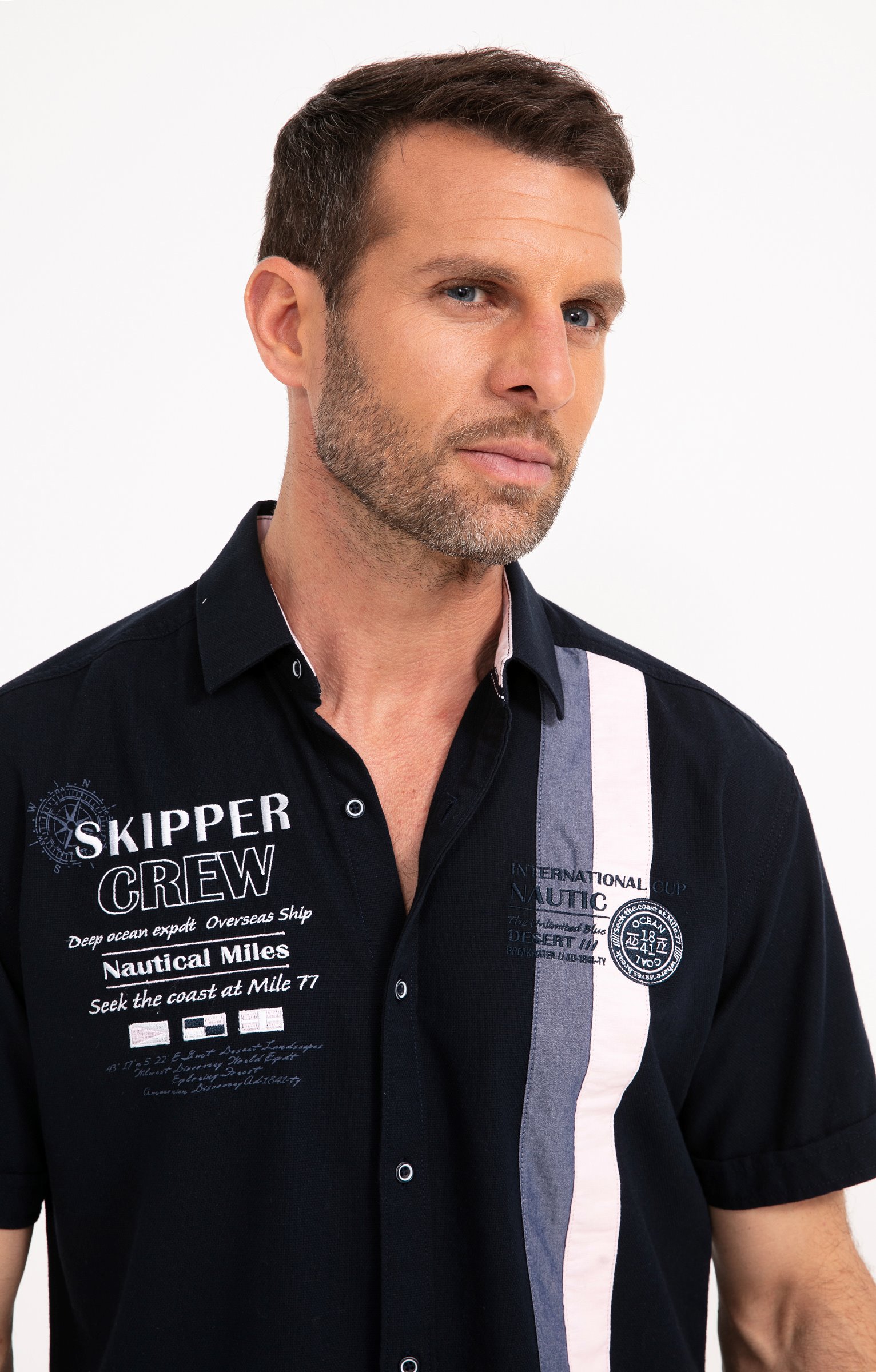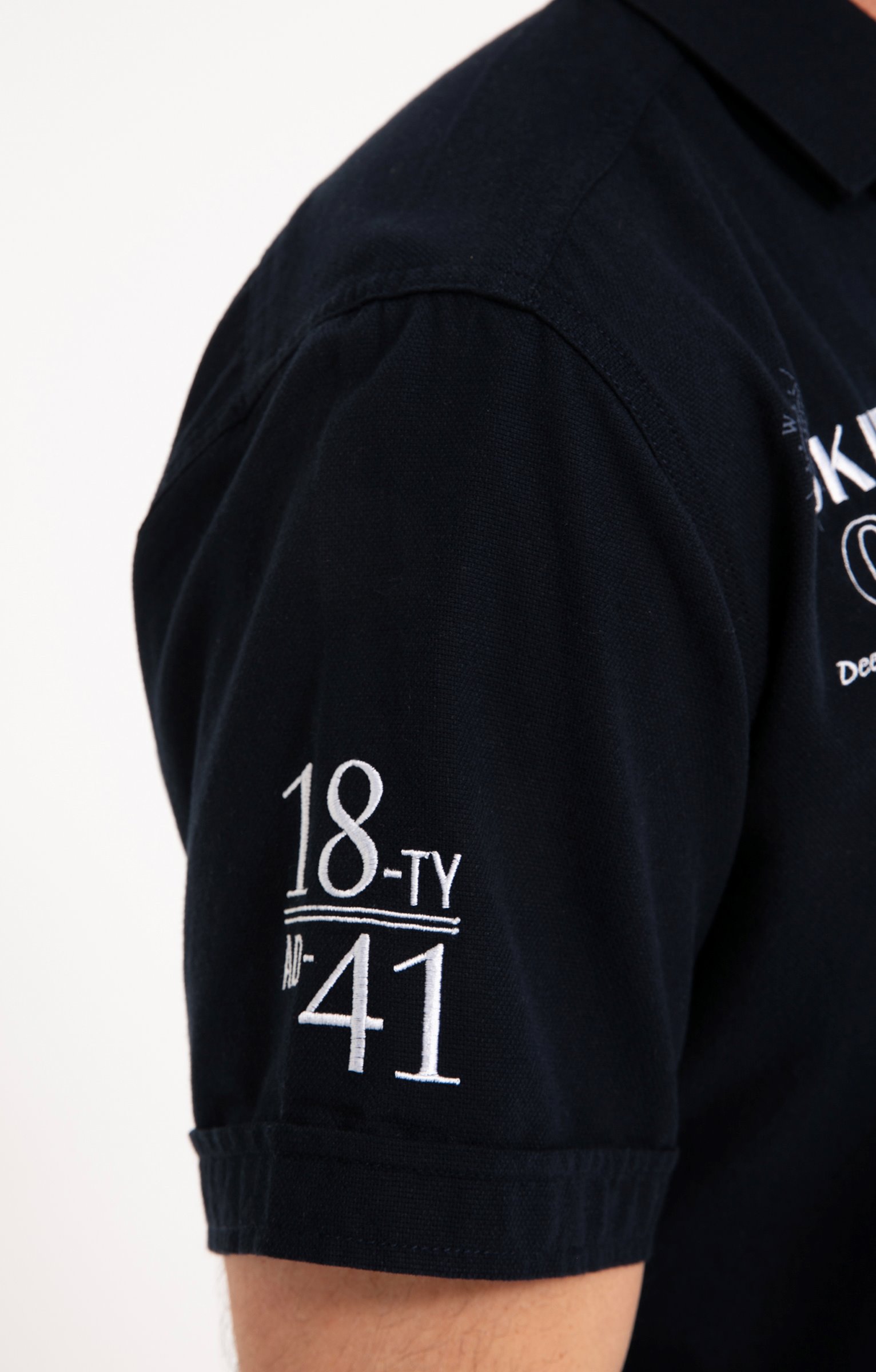 Chemise regular brodée à manches courtes. Coupe regular. Manches courtes. Col classique. Fermeture à boutons bicolores. Coloris uni. Matière souple. 2 bandes verticales cousues sur côté gauche devant. Doublure bicolore pied de col. Broderies et badges contrastés sur poitrine, manches et haut du dos. Base liquette. Empiècement droit en haut du dos.