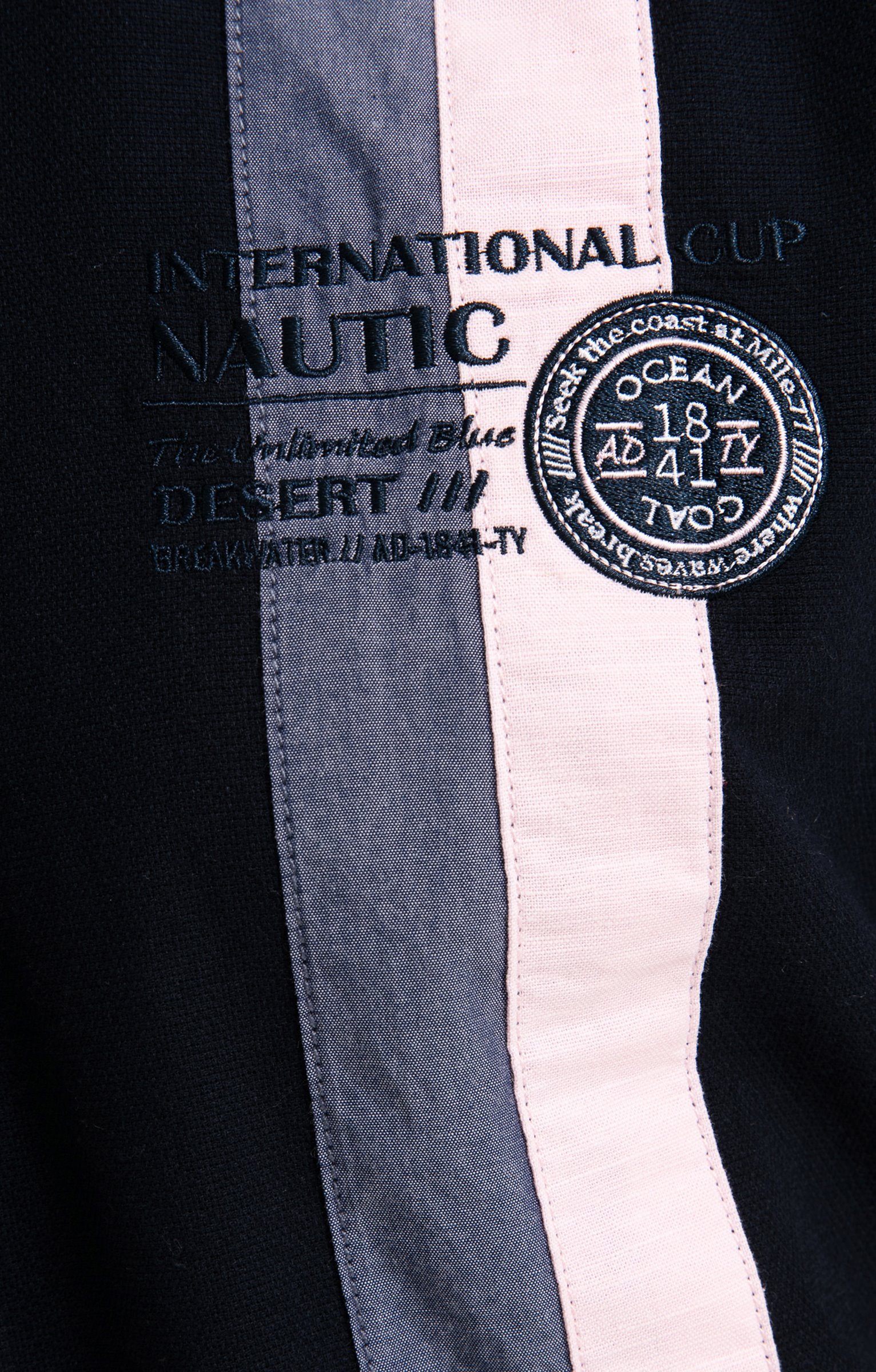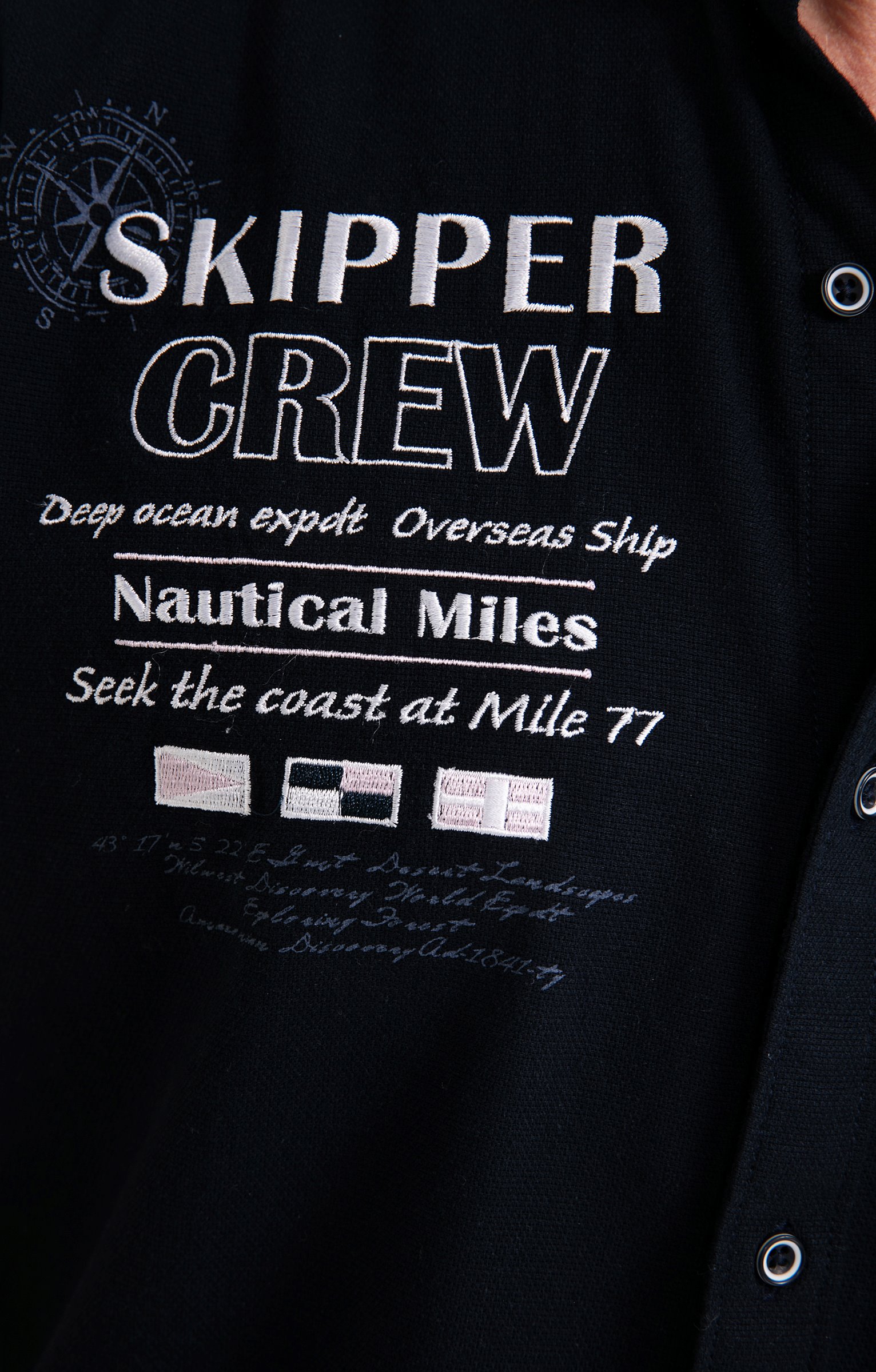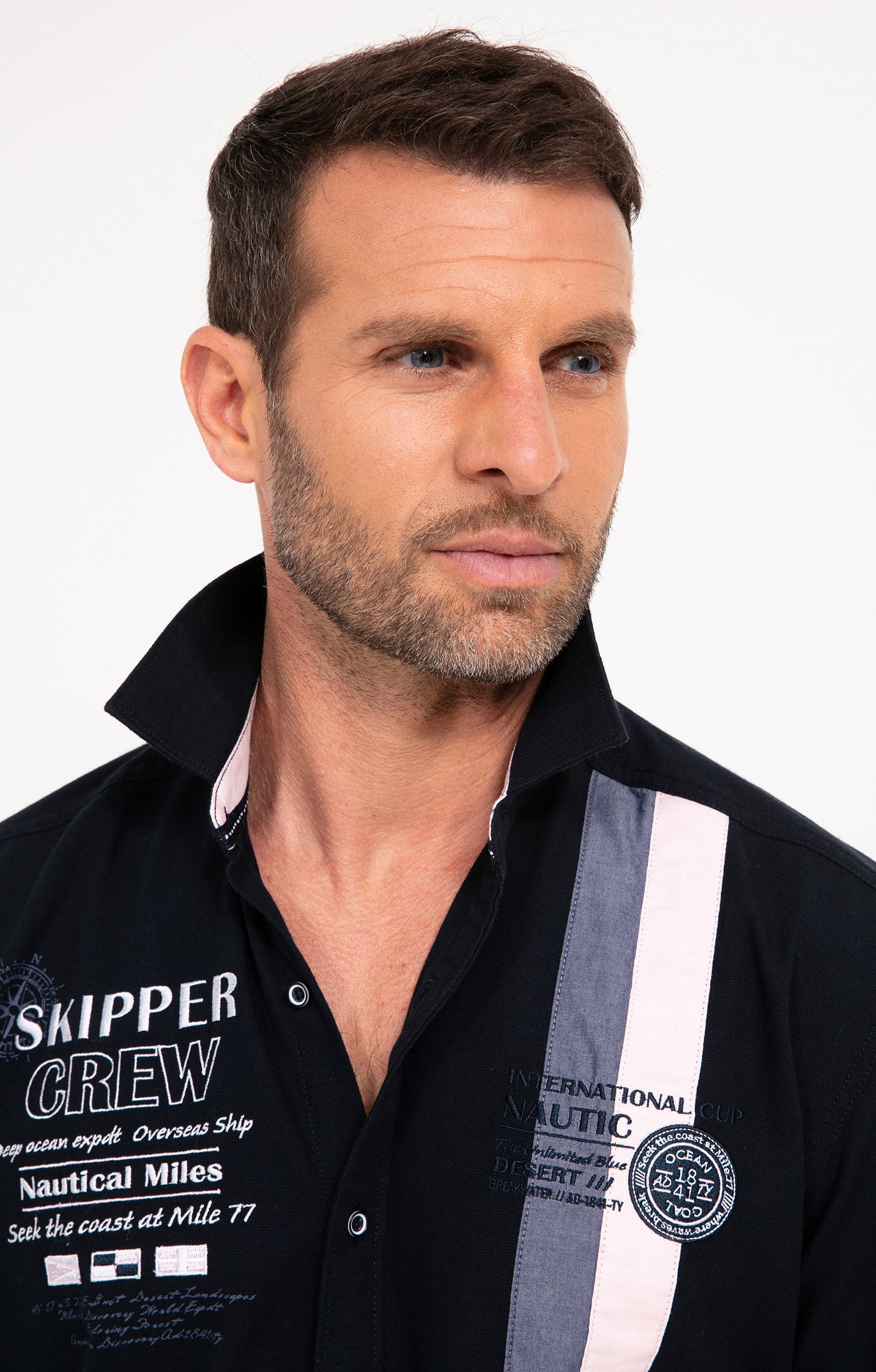 Chemise regular brodée à manches courtes. Coupe regular. Manches courtes. Col classique. Fermeture à boutons bicolores. Coloris uni. Matière souple. 2 bandes verticales cousues sur côté gauche devant. Doublure bicolore pied de col. Broderies et badges contrastés sur poitrine, manches et haut du dos. Base liquette. Empiècement droit en haut du dos.
