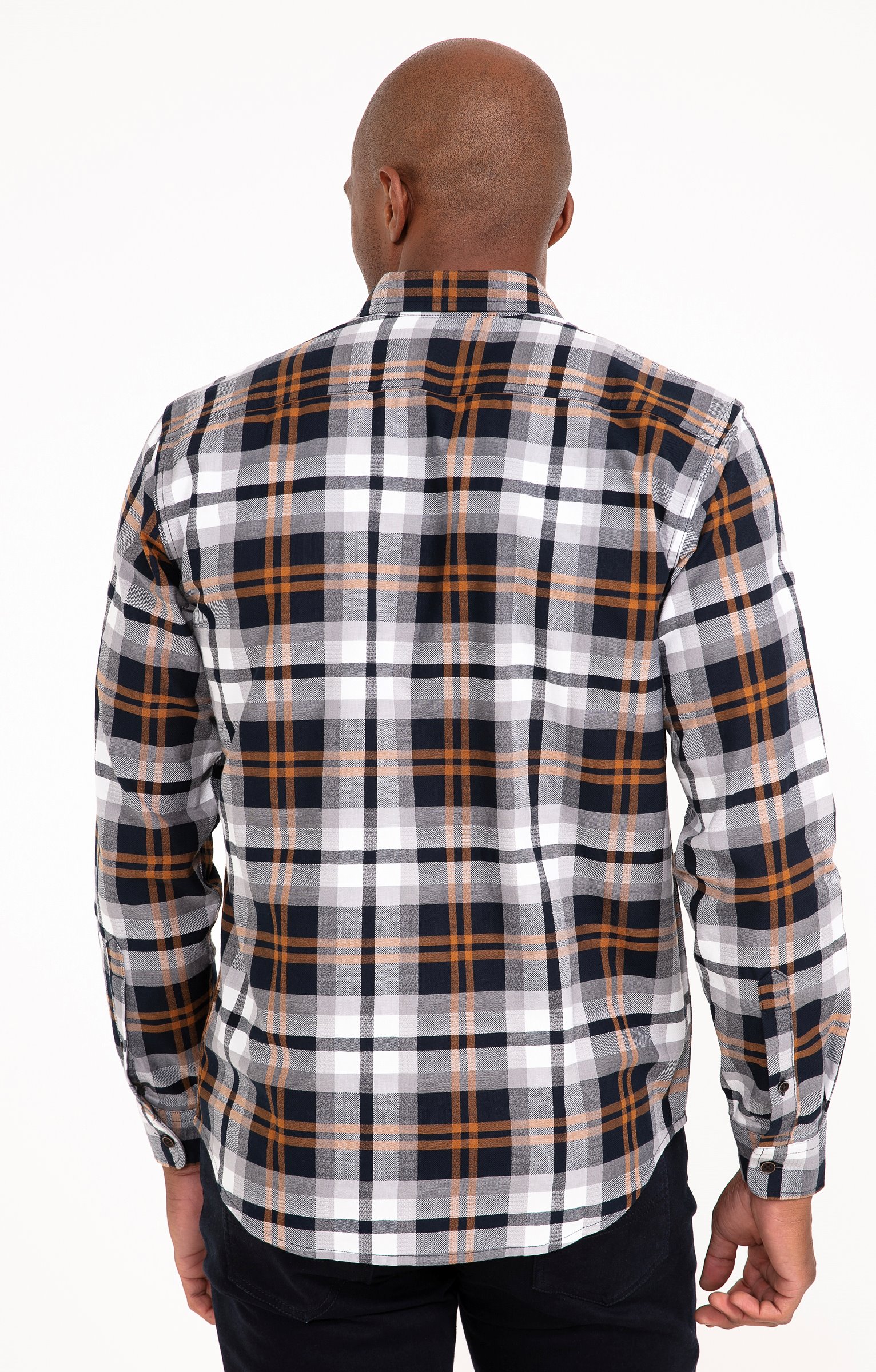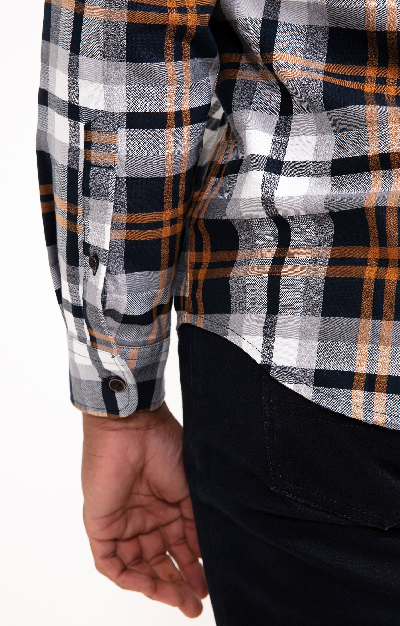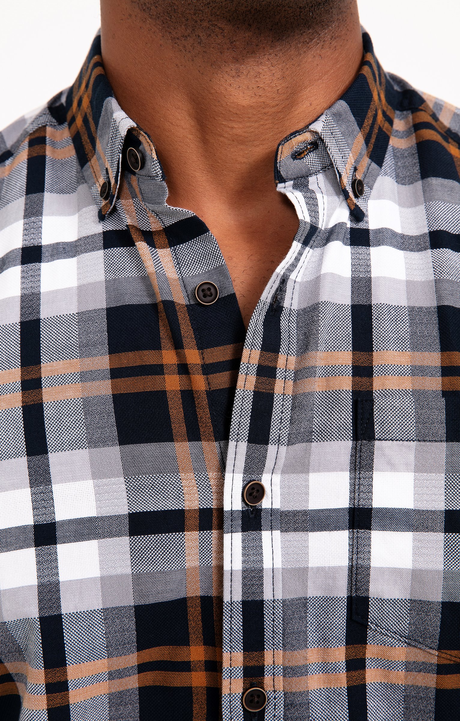 Chemise manches longues à carreaux. Coupe regular. Manches longues avec poignets boutonnés. Col chemise souple. Fermeture par des boutons bicolores sur le devant. Une poche plaquée sur la poitrine. Imprimé à motifs grands carreaux tricolores. Découpe horizontale dans le haut du dos. Bas liquette.