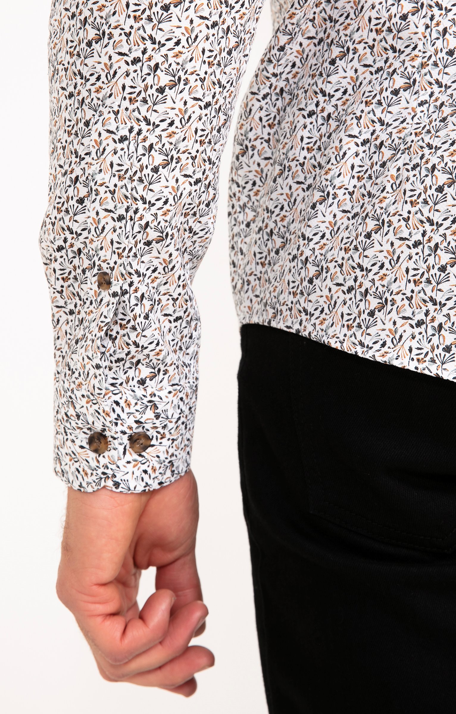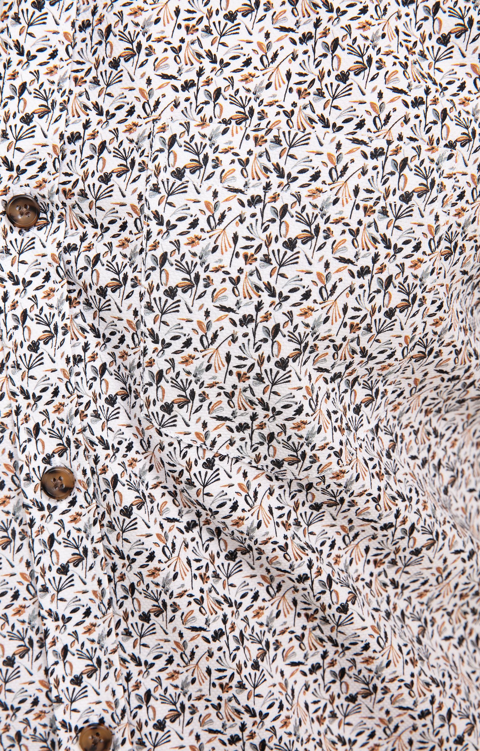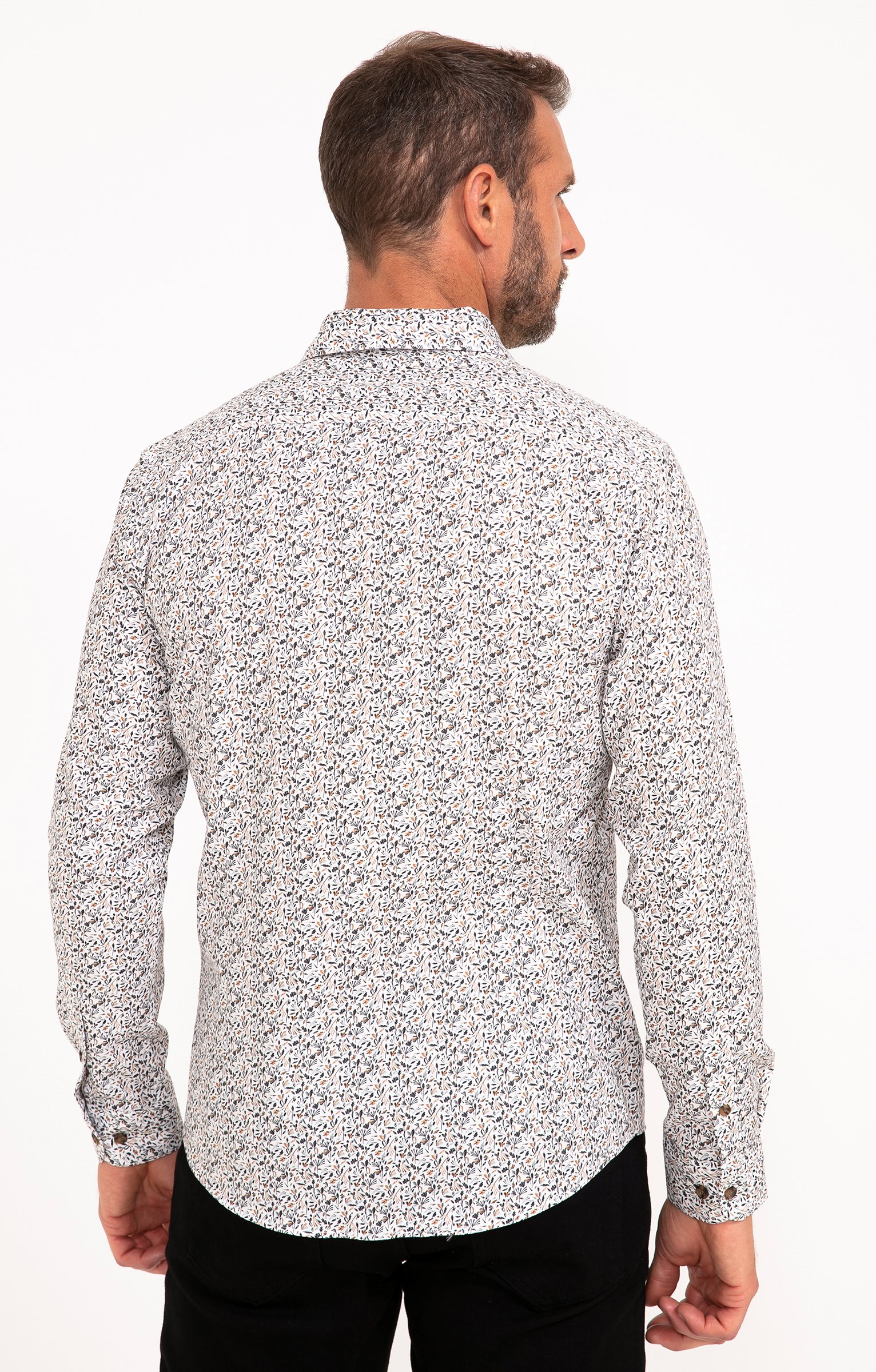 Chemise à manches longues imprimé végétal. Coupe ajustée. Manches longues avec poignets boutonnés. Col chemise souple. Fermeture par des boutons bicolores sur le devant. Imprimé à motif végétal sur l'ensemble du modèle. Découpe horizontale dans le haut du dos. Bas liquette. Coutures discrètes.
