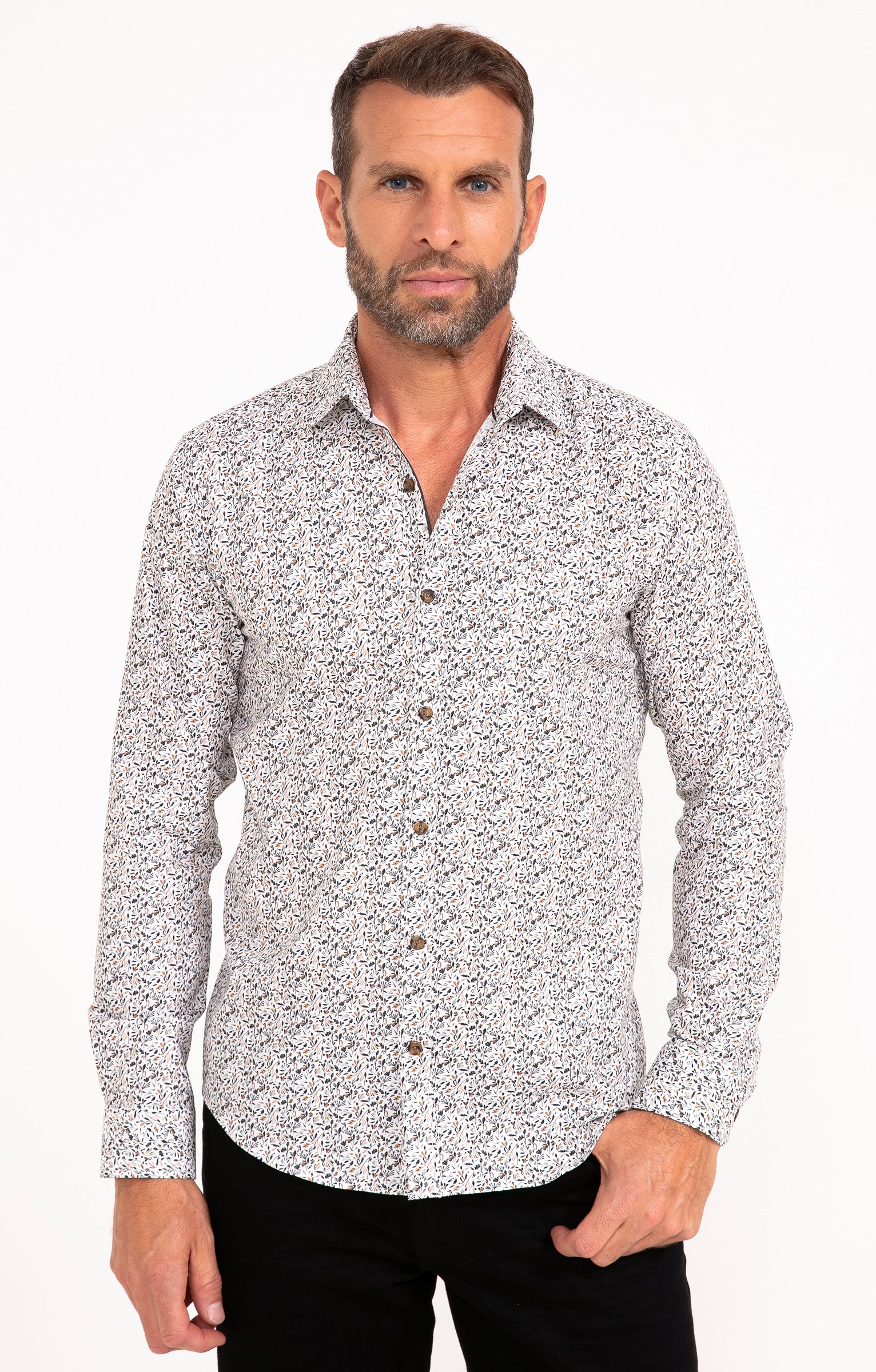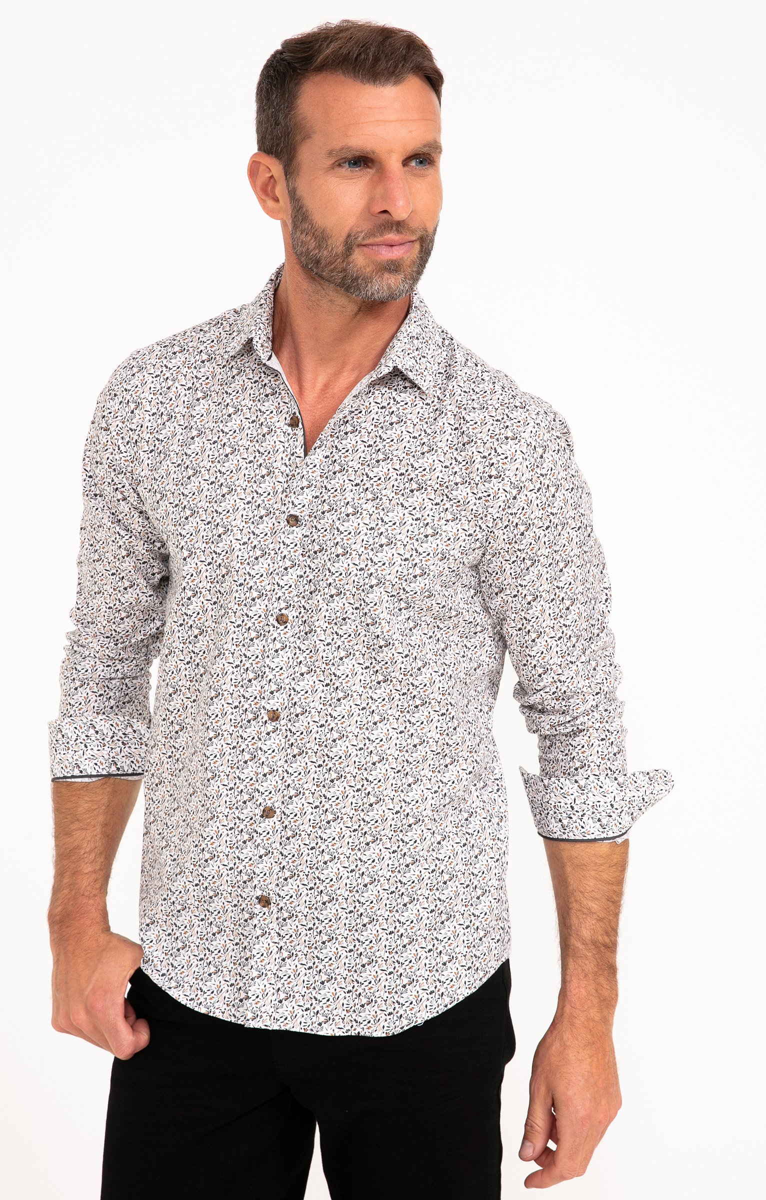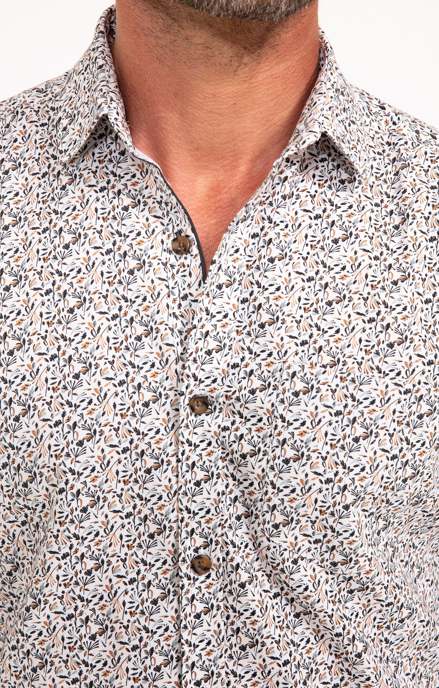 Chemise à manches longues imprimé végétal. Coupe ajustée. Manches longues avec poignets boutonnés. Col chemise souple. Fermeture par des boutons bicolores sur le devant. Imprimé à motif végétal sur l'ensemble du modèle. Découpe horizontale dans le haut du dos. Bas liquette. Coutures discrètes.